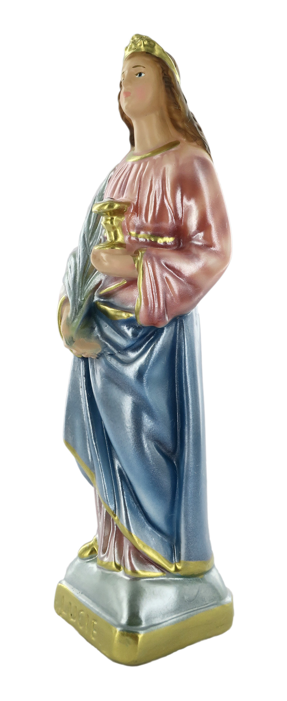 La statua, in gesso finemente dipinto a mano e impreziosito da una rifinitura madreperlata, raffigura Santa Lucia, vergine e martire durante le persecuzioni di Diocleziano. Patrona di Siracusa, degli elettricisti, dei non vedenti e degli oculisti, è celebrata il 13 dicembre. Viene qui rappresentata in vesti rosa e azzurre con bordi color oro, mentre tiene in mano due dei suoi simboli: una foglia di palma e una coppa che contiene due occhi. I suoi indumenti vantano un'attenzione particolare alla resa delle pieghe e delle delicate sfumature, che donano grande plasticità e profondità alla rappresentazione.
