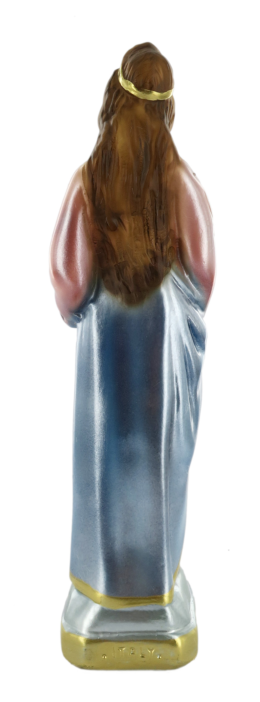 Questa statua di S. Lucia da 20 cm è realizzata artigianalmente in Italia e si distingue per la qualità della fattura e per il sapiente uso dei colori, adeguatamente dosati. L'effetto madreperlato rende le tinte molto lucenti e arricchisce la figura di suggestivi riflessi, donandole un aspetto elegante e pregevole. Adatta anche a piccole nicchie di ambienti dedicati al culto, la statuetta di Santa Lucia è ideale per essere esposta in casa come soprammobile o in una vetrinetta. Sarà una gradita idea regalo per i devoti a questa figura. La luce delle fiammelle dei lumini o dei faretti esalterà l'effetto iridescente della sua rifinitura madreperlacea.