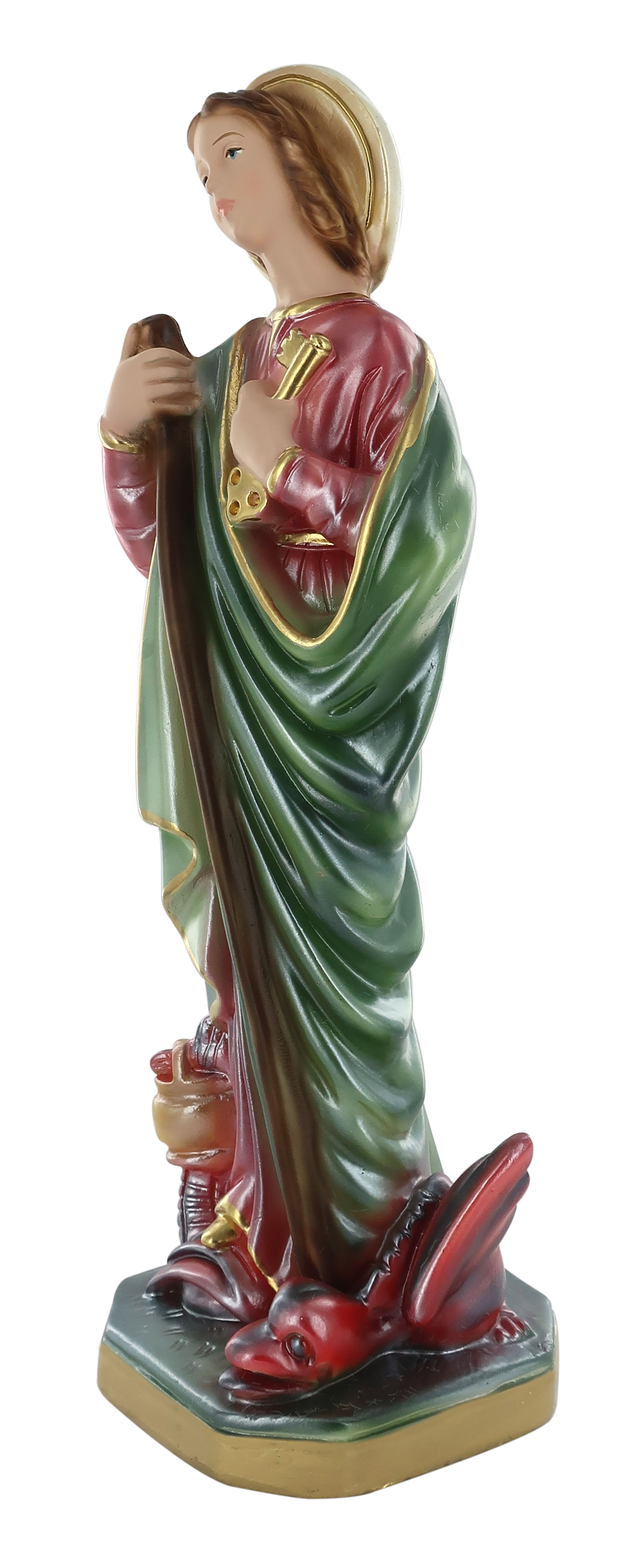 Questa statua di Santa Marta da 30 cm è realizzata artigianalmente in Italia e si distingue per la qualità della fattura e per il sapiente uso dei colori, adeguatamente dosati. L'effetto madreperlato rende le tinte molto lucenti e arricchisce la figura di suggestivi riflessi, donandole un aspetto elegante e pregevole. La statua di Santa Marta, adatta anche a nicchie in ambienti dedicati al culto, è ideale per essere esposta in casa come soprammobile o in una vetrinetta. Sarà una gradita idea regalo per i devoti a questo personaggio. La luce delle fiammelle dei lumini o dei faretti esalterà l'effetto iridescente della sua rifinitura madreperlacea.