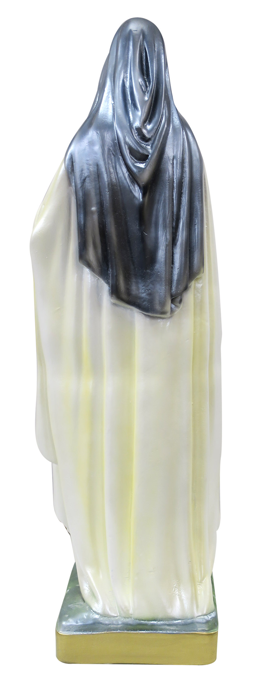 Questa statua di S. Teresa di Lisieux da 60 cm è realizzata artigianalmente in Italia e si distingue per la qualità della fattura e per il sapiente uso dei colori, adeguatamente dosati. L'effetto madreperlato rende le tinte molto lucenti e arricchisce la figura di suggestivi riflessi, donandole un aspetto elegante e pregevole. La statua di Teresa di Gesù Bambino e del Volto Santo è particolarmente indicata per essere esposta in grandi nicchie di luoghi di culto, in cappellette o edicole. La luce di faretti esalterà l'effetto iridescente della sua rifinitura madreperlacea.