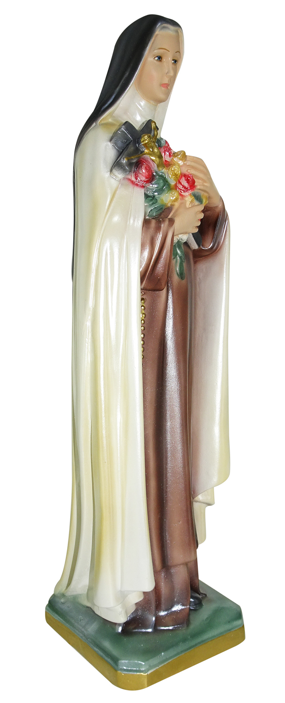 La statua, in gesso finemente dipinto a mano e impreziosito da una rifinitura madreperlata, raffigura Santa Teresa di Lisieux, patrona dei missionari, dei malati di AIDS/HIV, della Russia e della Francia. Proclamata santa da Papa Pio XI nel 1925, è qui ritratta su un piedistallo color oro, indossa la tunica scura delle Carmelitane Scalze, coperta da un lungo, candido mantello. Regge in mano i suoi fiori simbolo, le rose, insieme a un crocifisso. Gli indumenti vantano un'attenzione particolare alla resa delle pieghe e delle delicate sfumature, che donano grande plasticità e profondità alla rappresentazione.