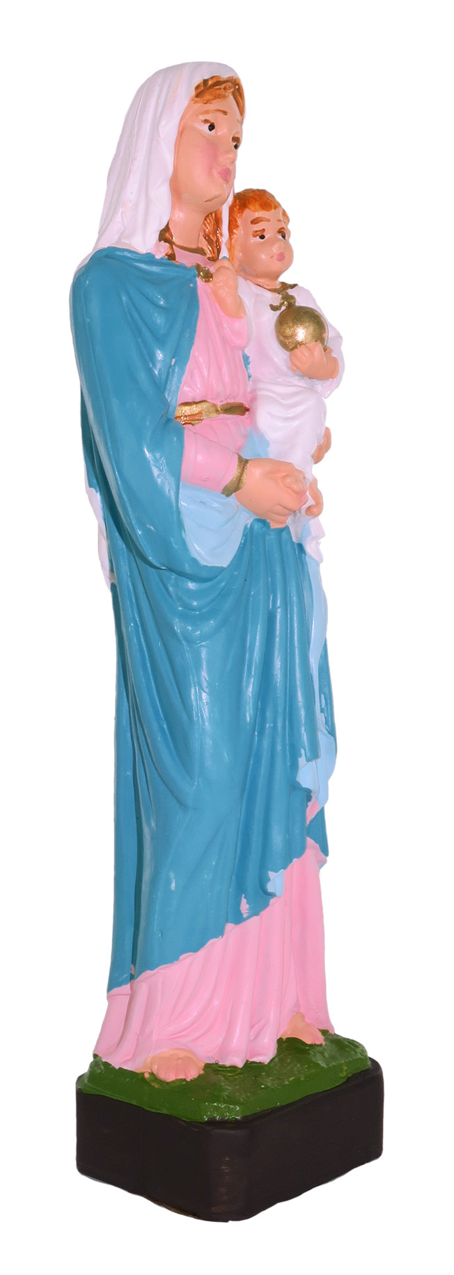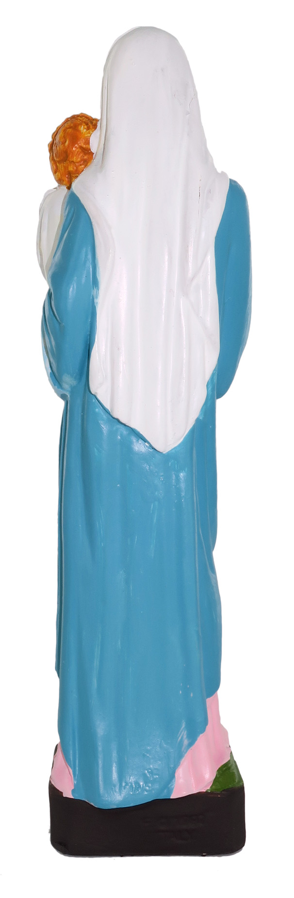 La statua, in materiale infrangibile tipo gomma, raffigura la Madonna con Bambino ed è dipinta a mano. Grazie al materiale di cui è fatta e alla resistenza che la caratterizza, è adatta all'uso esterno, come in giardini e nicchie all'aperto. Può essere esposta anche alla pioggia. La rappresentazione fa riferimento a uno dei soggetti più rappresentati nell'arte sacra: la Vergine con il Bambino, simbolo di maternità e del forte legame tra madre e figlio.