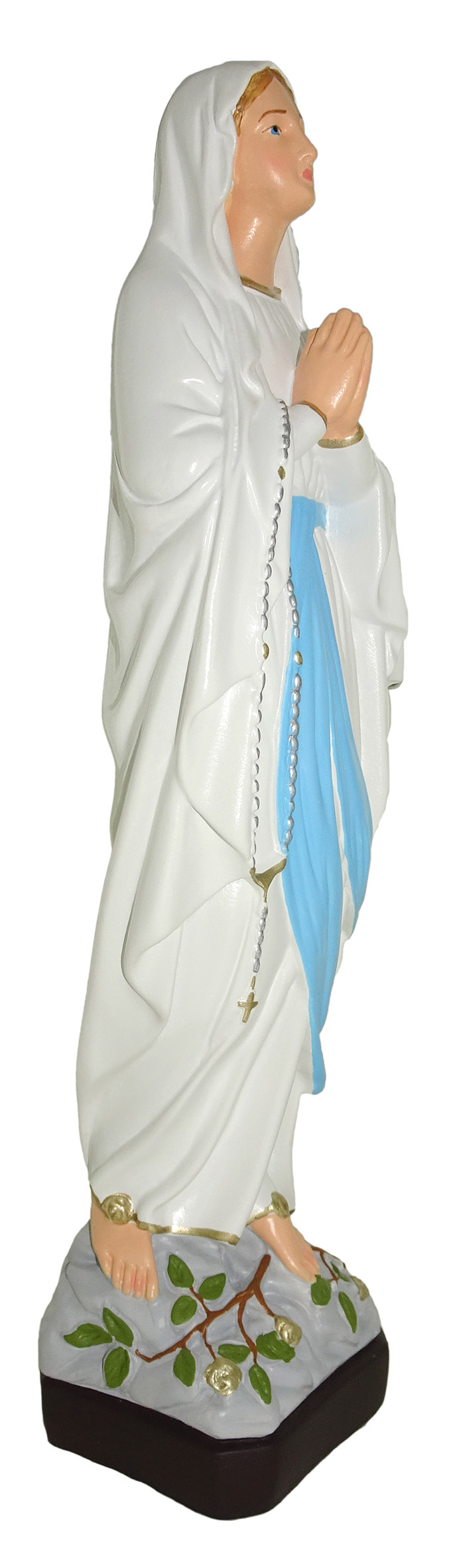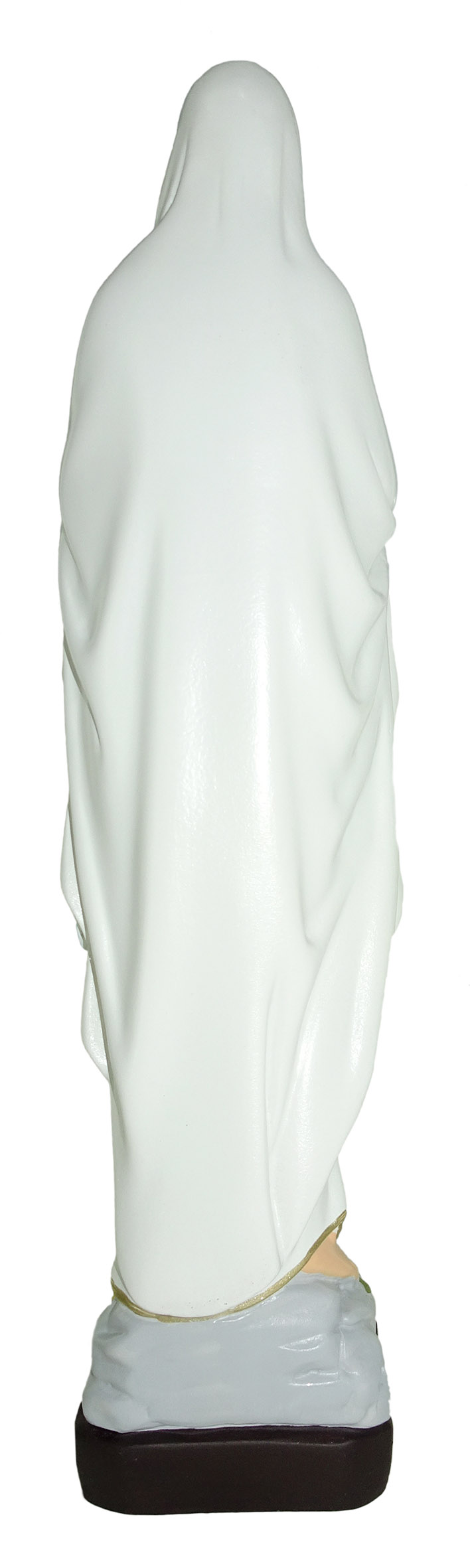 La statua, in materiale infrangibile tipo gomma, raffigura la Madonna Madonna di Lourdes ed è dipinta a mano. Grazie al materiale di cui è fatta e alla resistenza che la caratterizza, è adatta all'uso esterno, come in giardini e nicchie all'aperto. Può essere esposta anche alla pioggia.