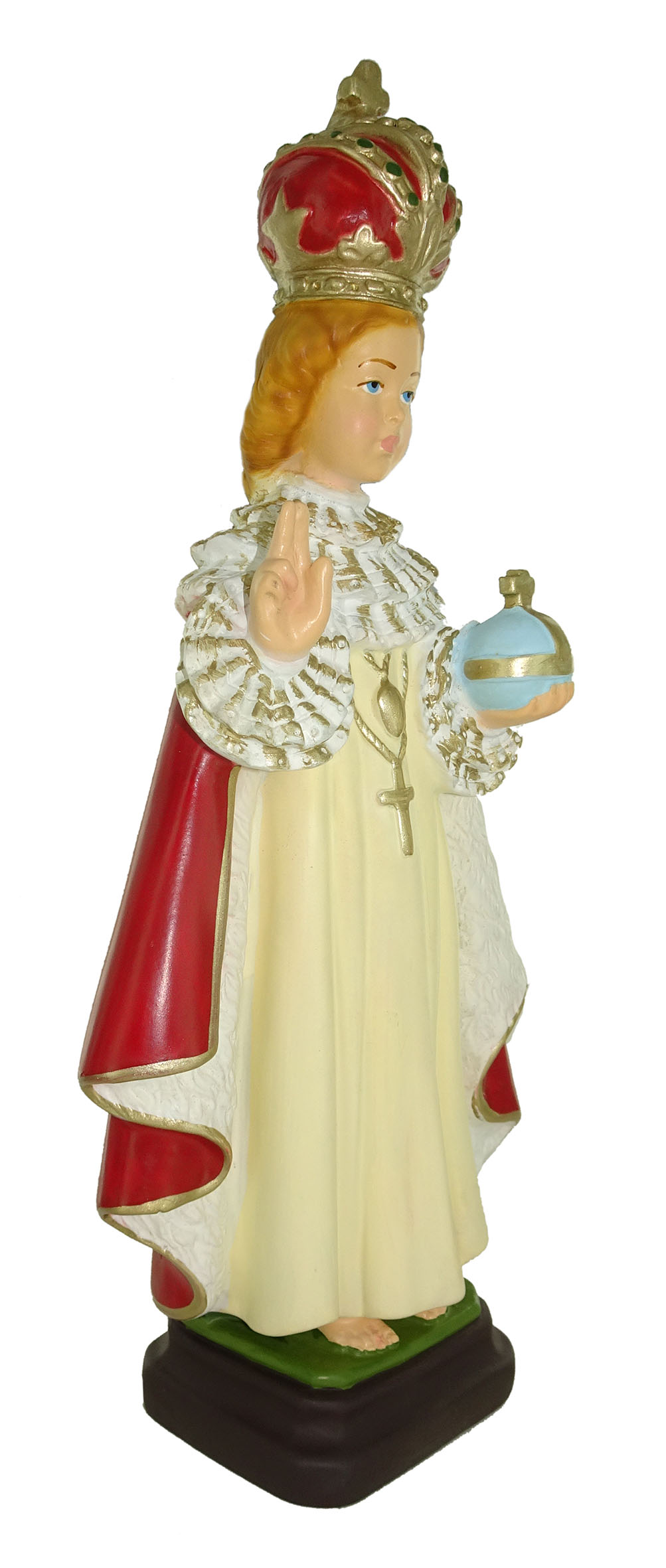 La statua, in materiale infrangibile tipo gomma, raffigura Gesù Bambino di Praga ed è dipinta a mano. Grazie al materiale di cui è fatta e alla resistenza che la caratterizza, è adatta all'uso esterno (giardini, nicchie all'aperto, ecc.). Può essere esposta anche alla pioggia.