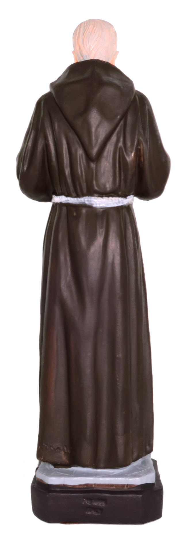 La statua, in materiale infrangibile tipo gomma, raffigura Padre Pio da Pietrelcina ed è dipinta a mano. Grazie al materiale di cui è fatta e alla resistenza che la caratterizza, è adatta all'uso esterno (giardini, nicchie all'aperto, ecc.). Può essere esposta anche alla pioggia.
