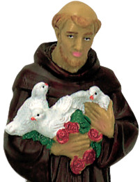 La statua, in materiale infrangibile tipo gomma, raffigura San Francesco d'Assisi ed è dipinta a mano. Grazie al materiale di cui è fatta e alla resistenza che la caratterizza, è adatta all'uso esterno, come giardini e nicchie all'aperto. Può essere esposta anche alla pioggia.