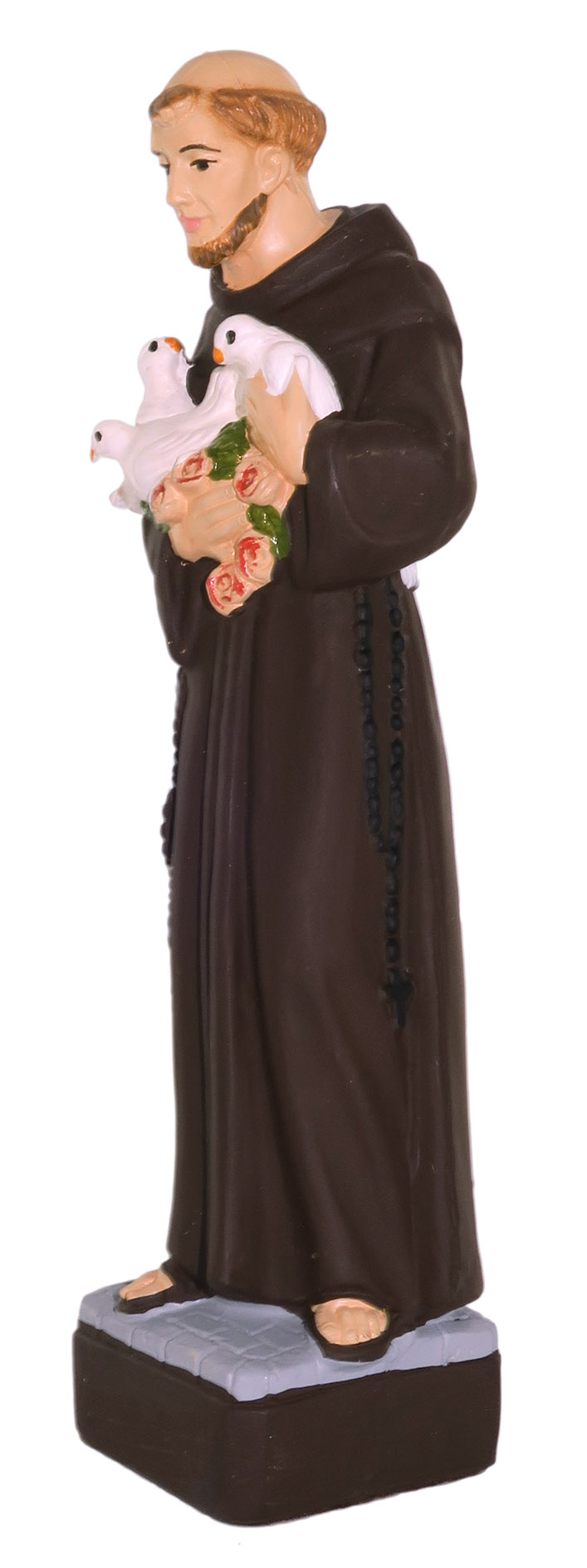La statua, in materiale infrangibile tipo gomma, raffigura San Francesco d'Assisi ed è dipinta a mano. Grazie al materiale di cui è fatta e alla resistenza che la caratterizza, è adatta all'uso esterno, come giardini e nicchie all'aperto. Può essere esposta anche alla pioggia.