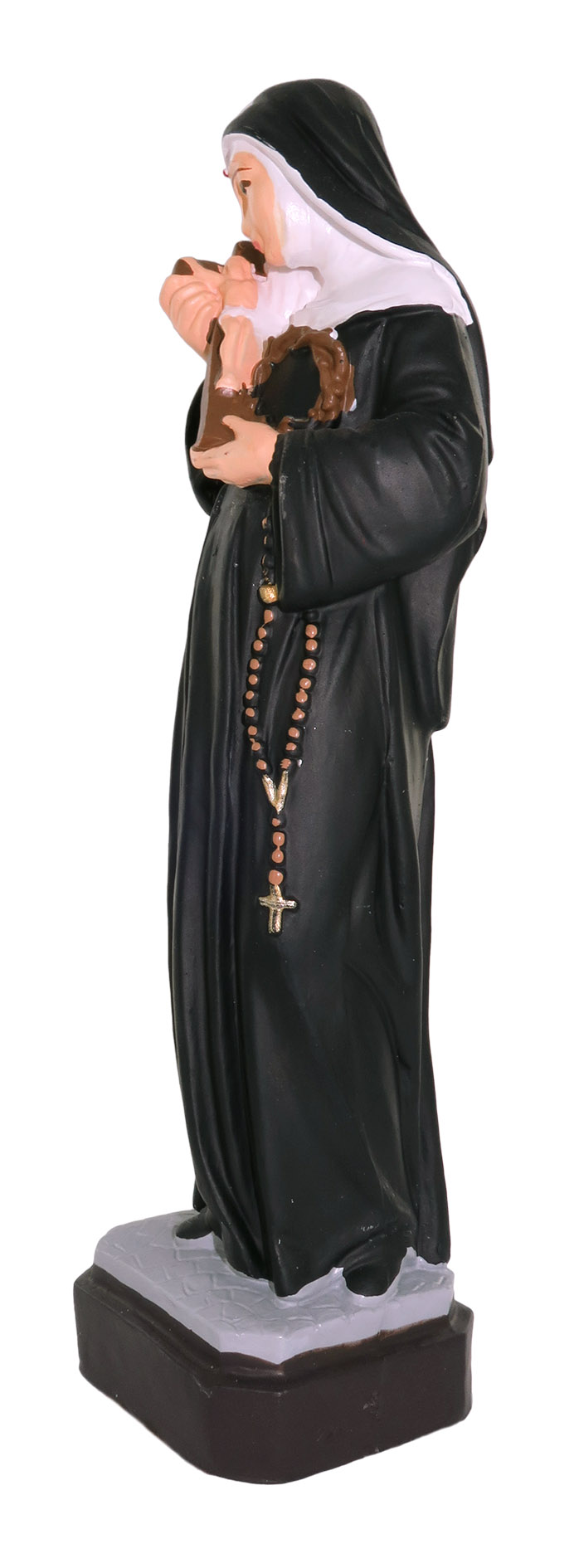 Questa statua di S. Rita da circa 16 cm è realizzata artigianalmente in Italia e si distingue per la durevolezza della fattura e per i suoi colori coprenti.