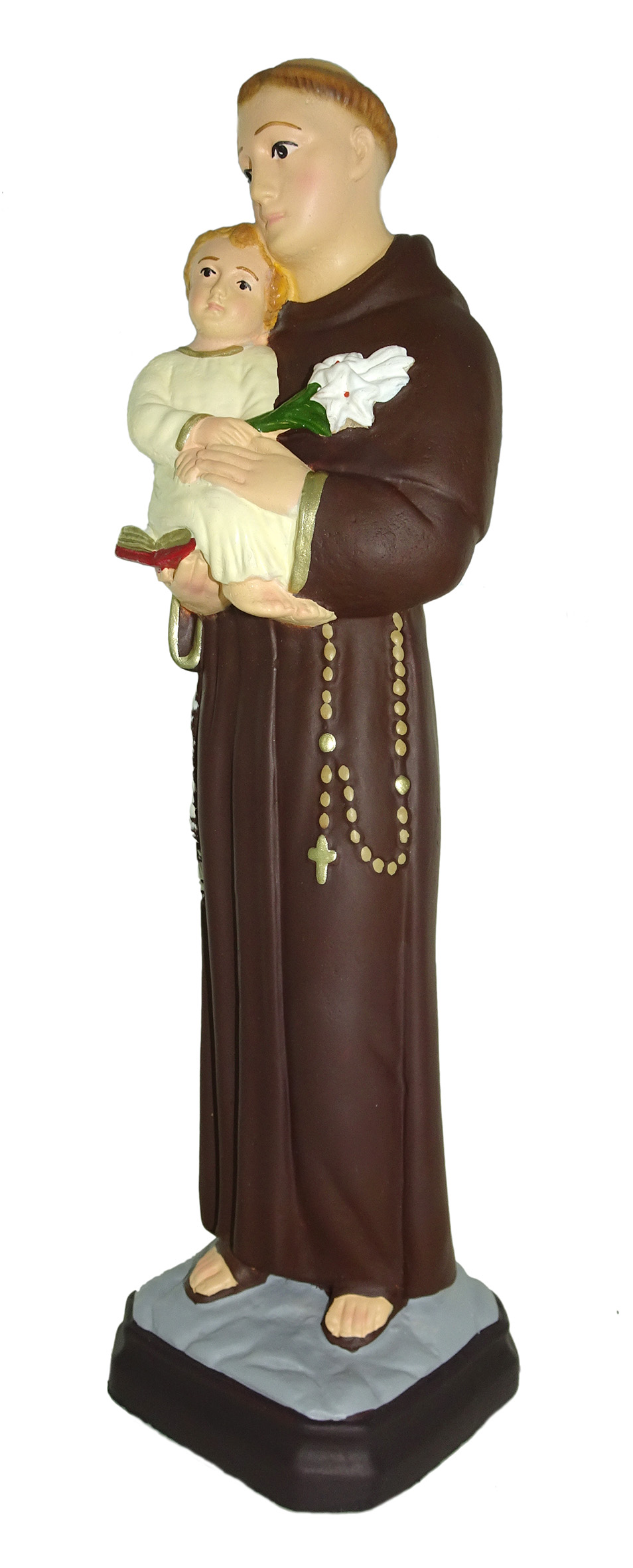 La statua da giardino, in materiale infrangibile tipo gomma, raffigura Sant'Antonio ed è dipinta a mano. Grazie al materiale di cui è fatta e alla resistenza che la caratterizza, è adatta all'uso esterno (giardini, nicchie all'aperto, ecc.). Può essere esposta anche alla pioggia.