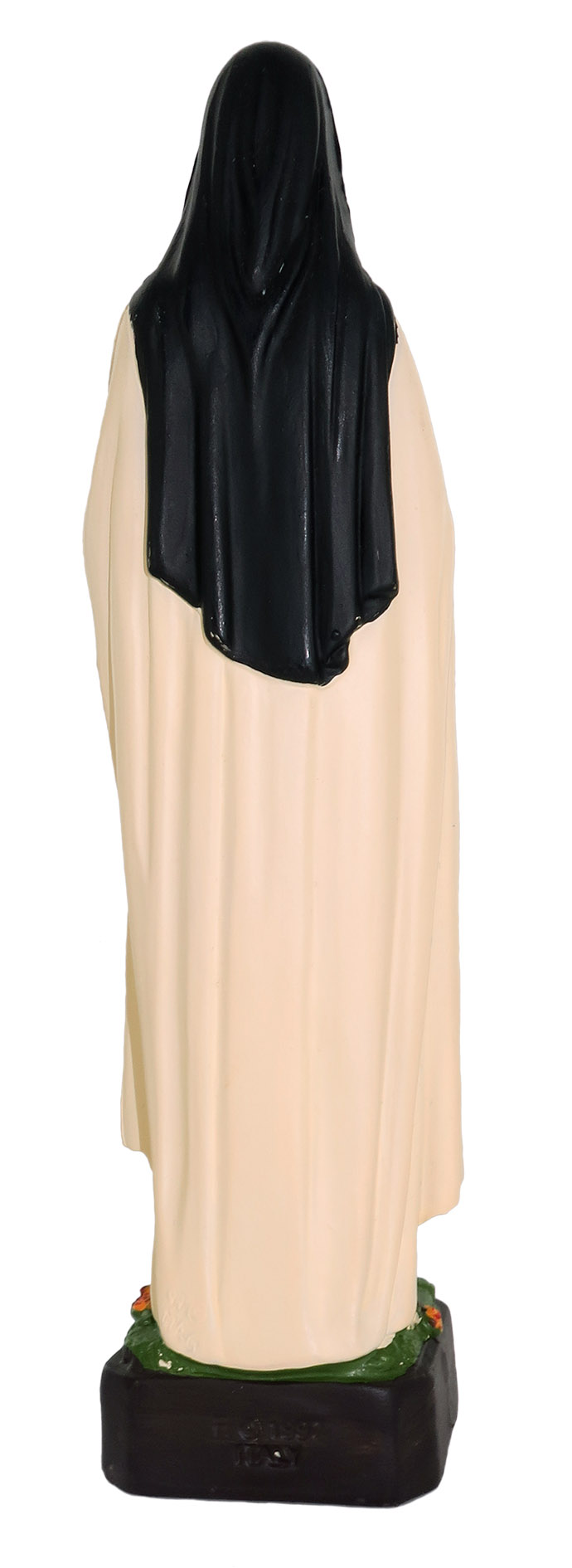 La statua, in materiale infrangibile tipo gomma, raffigura Santa Teresa di Lisieux ed è dipinta a mano. Grazie al materiale di cui è fatta e alla resistenza che la caratterizza, è adatta all'uso esterno (giardini, nicchie all'aperto, ecc.). Può essere esposta anche alla pioggia.