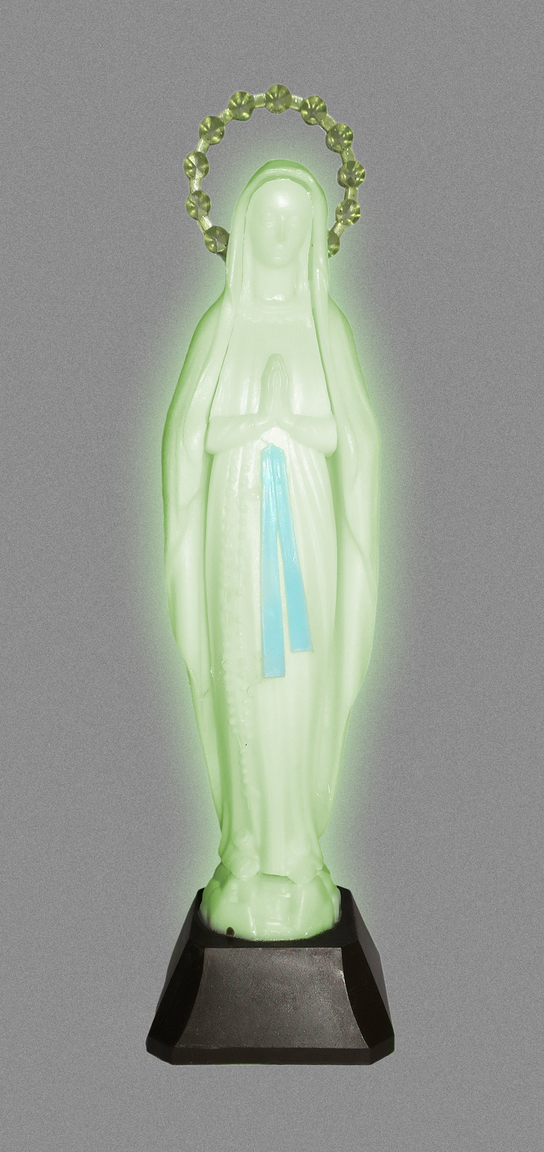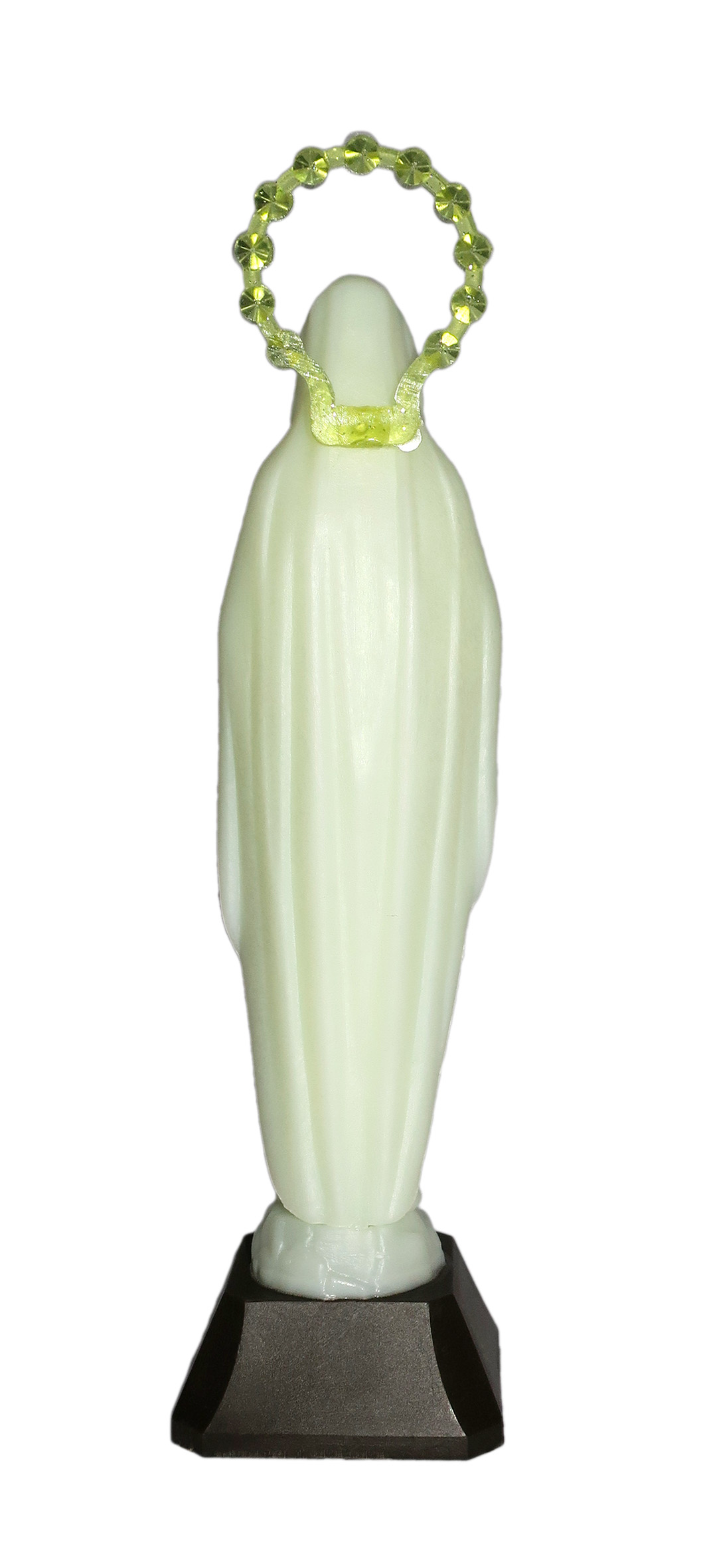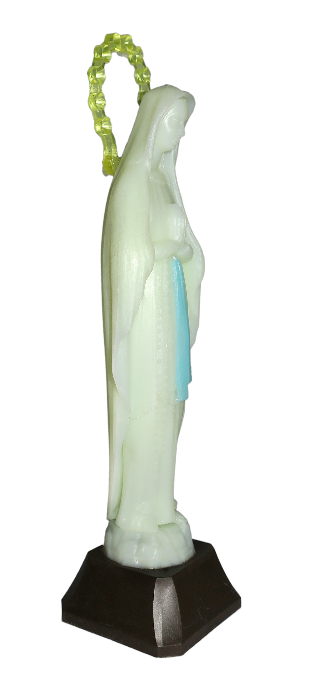 Statua della Madonna di Lourdes realizzata in plastica fosforescente. La statua misura 14 cm ed è incollata su piedistallo. La aureola è removibile.