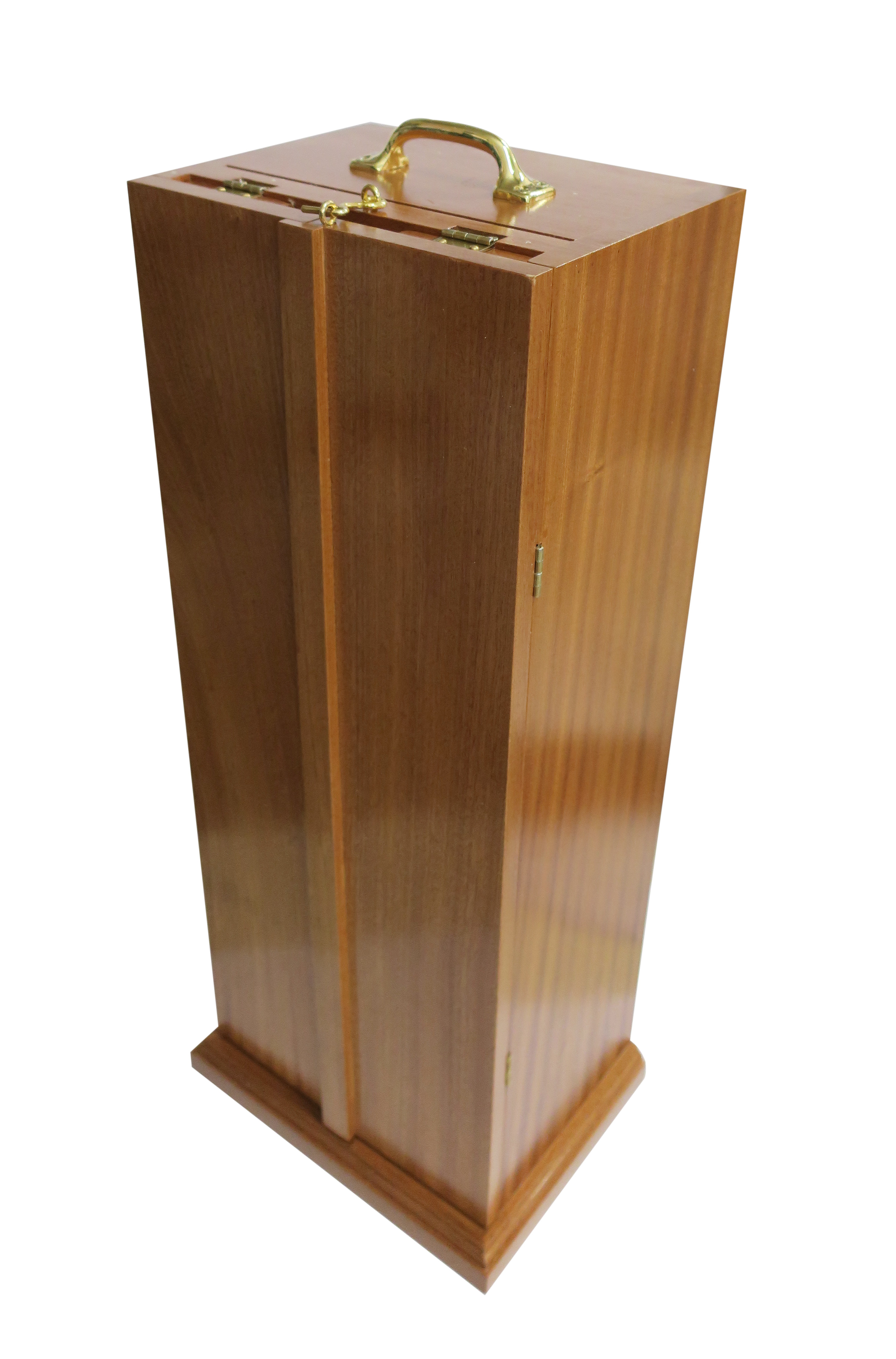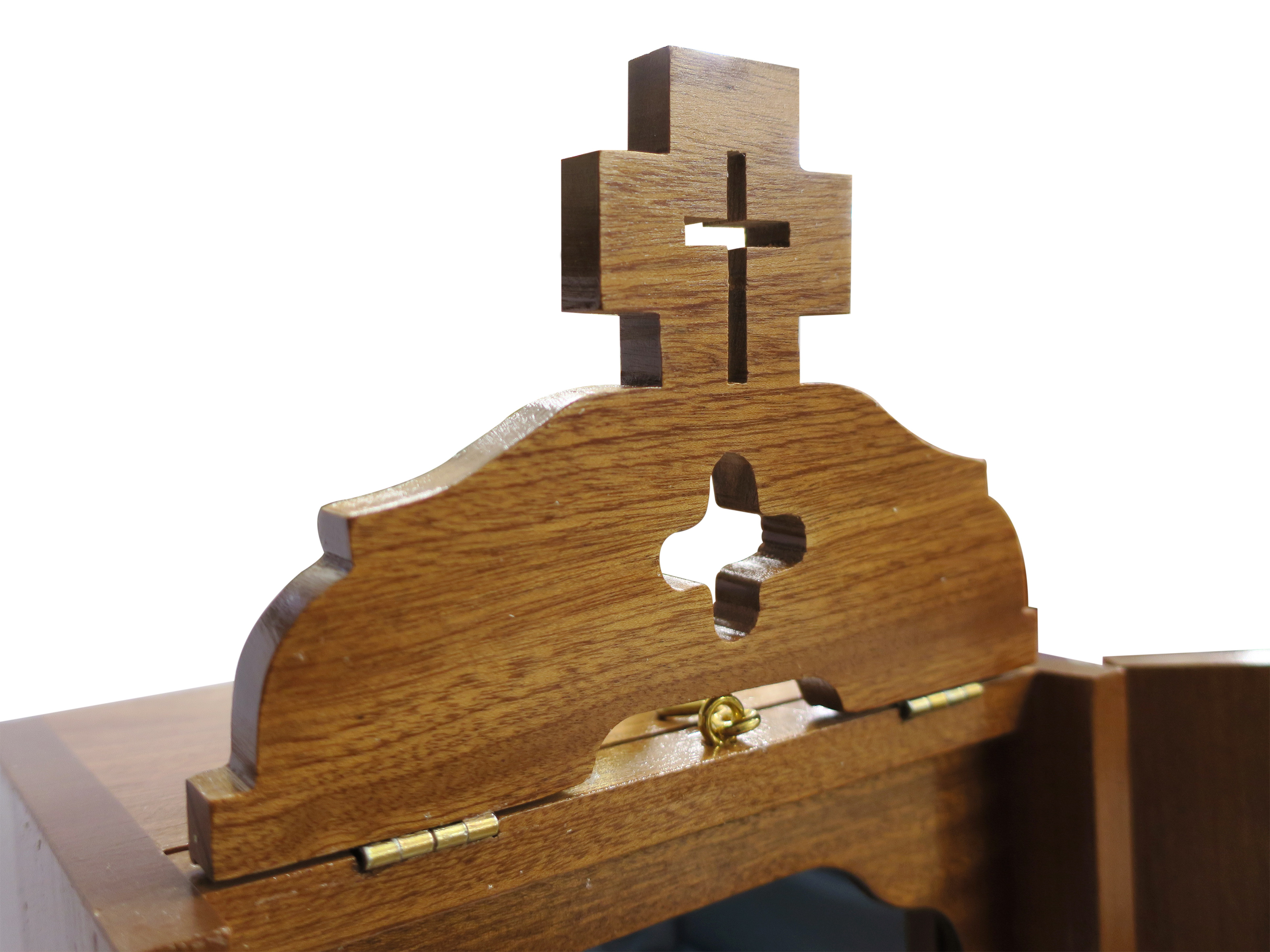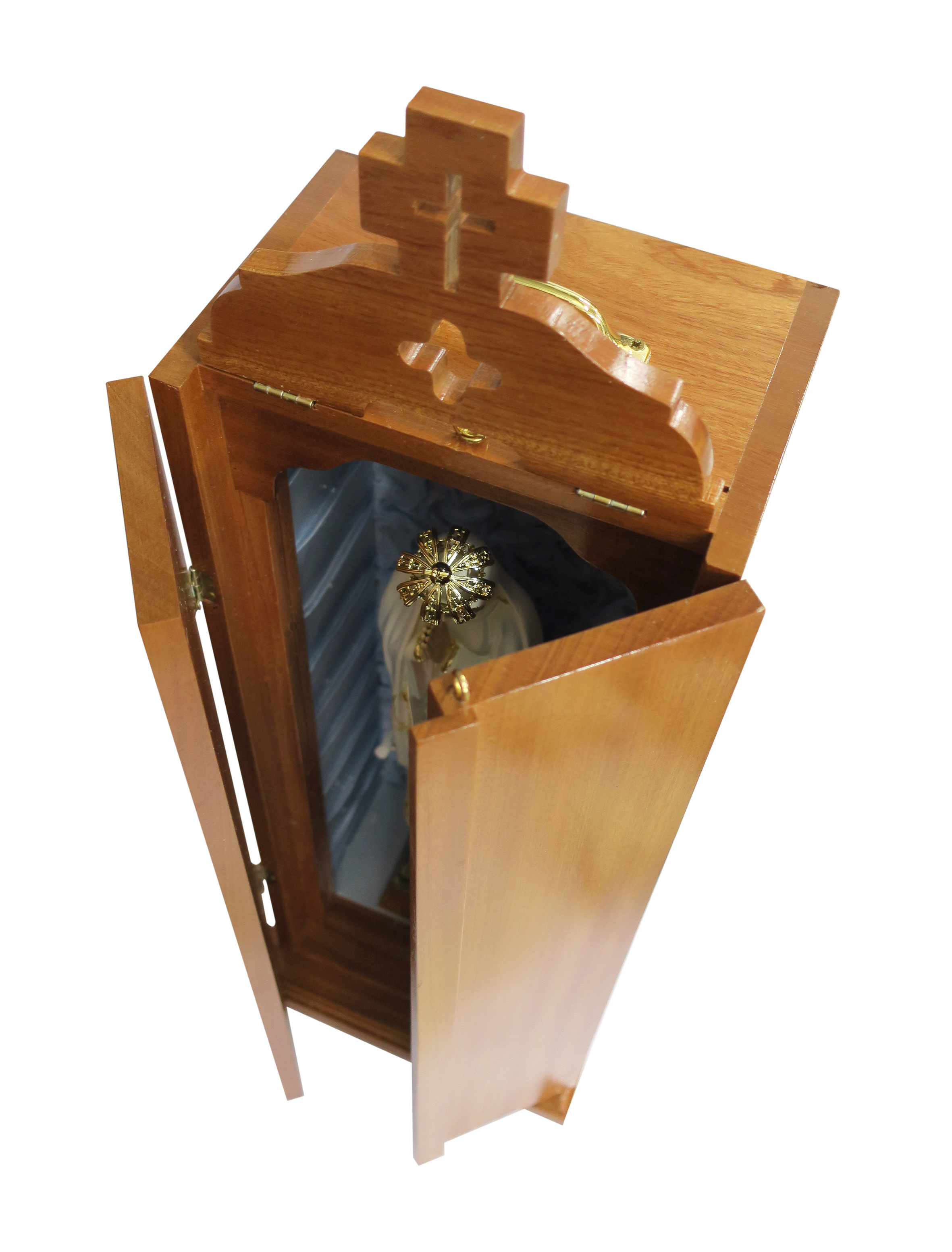 La custodia che la contiene funge anche da bellissima vetrinetta espositiva per la statua: aprite le due ante della parte frontale della scatola e infilate nell'apposita fessura nella parte superiore della scatola il pannello di vetro in dotazione. In tal modo, la statua della Madonna di Fatima sarà protetta, pur riuscendo a mostrarsi al meglio e a farsi ammirare per la sua bellezza. La parte superiore della scatola non appare semplicemente squadrata, ma basta alzare una piccola antina in legno intagliato che riproduce la forma di una croce per rendere la vetrinetta ancora più gradevole alla vista e coprire così anche la piccola maniglia collocata nel lato superiore, molto utile per maneggiare la scatola.