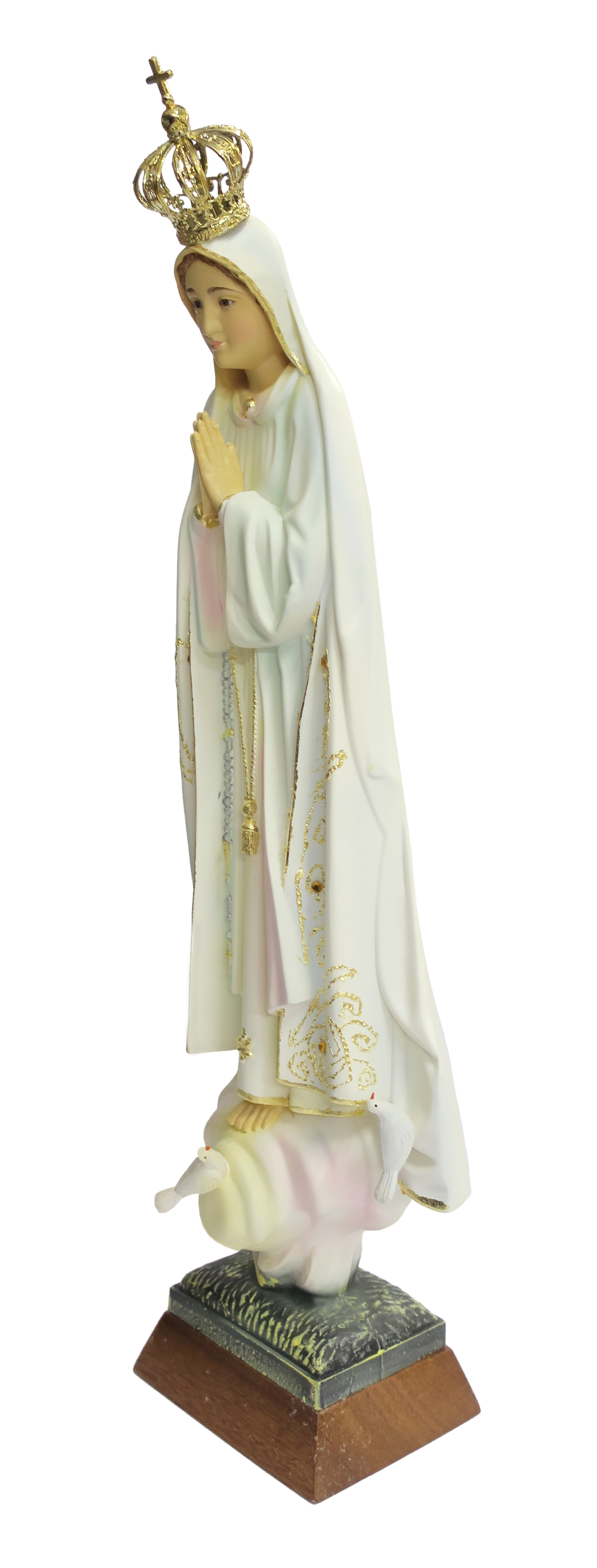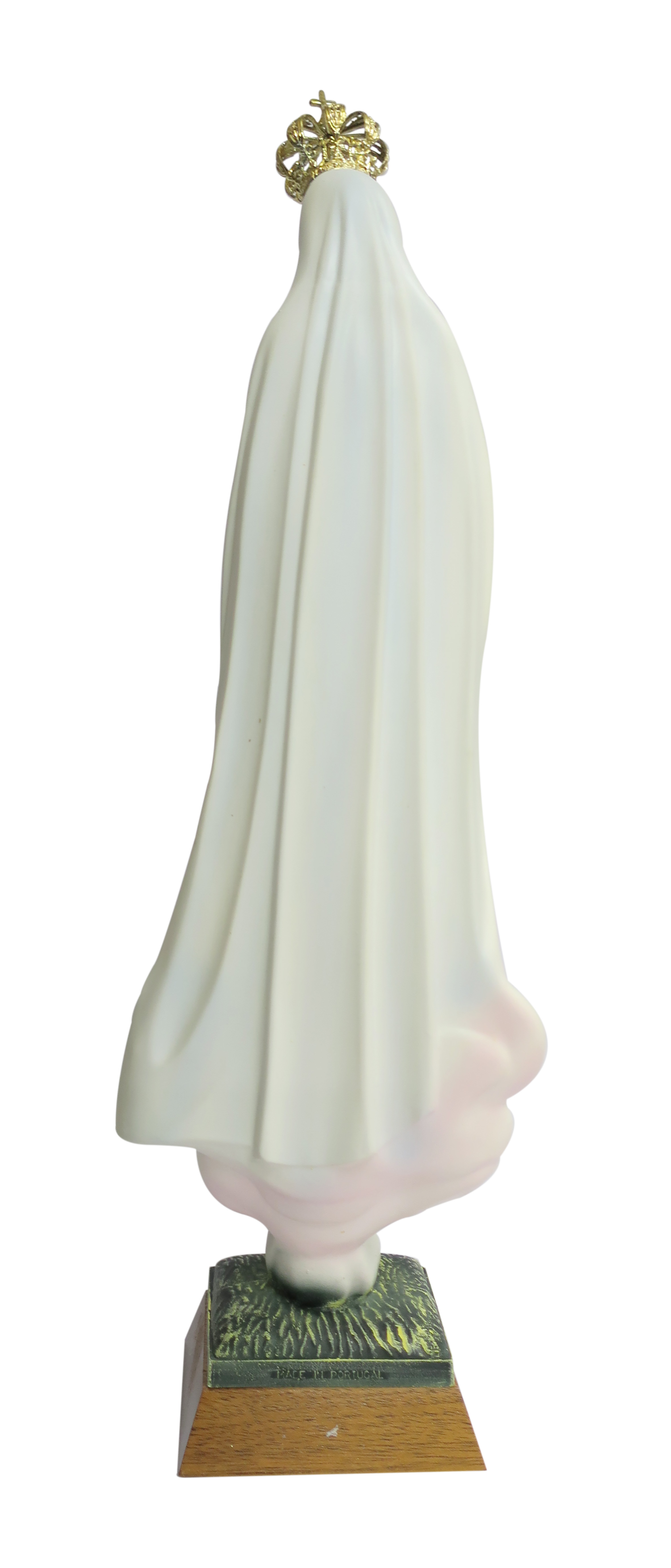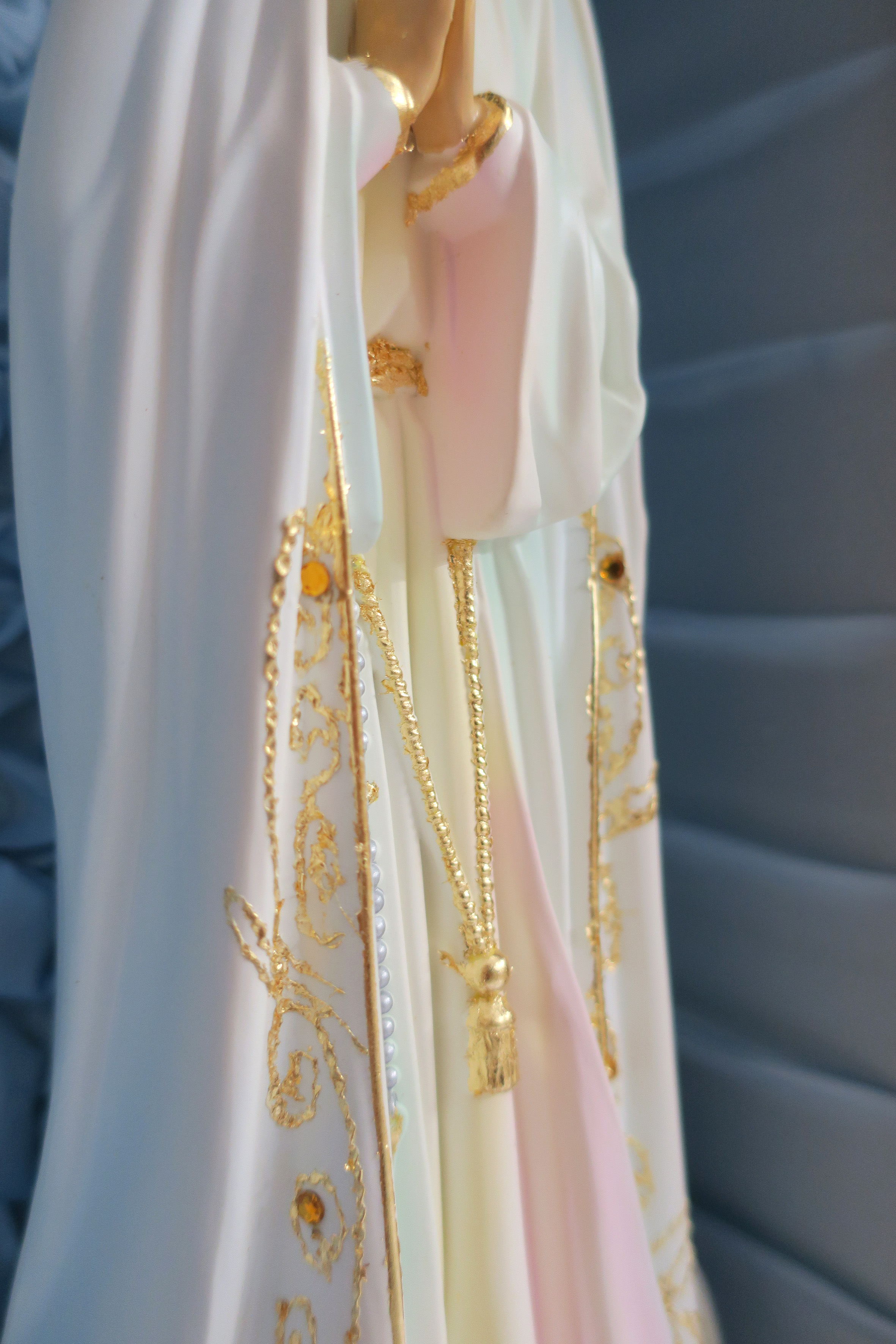 La statua della Vergine di Fatima è contenuta in una custodia in legno, foderata di morbida e vellutata seta. Prodotta a Fatima, in Portogallo, la statua è finemente realizzata in poliestere, liscia e finemente dipinta a mano. Il volto della Vergine, con dolci occhi marroni, è molto delicato. I suoi abiti, abbelliti da bordi in color oro e strass arancioni, sono impreziositi da diverse decorazioni e da tenui sfumature rosa. Sul capo, la Vergine di Fatima porta una corona in metallo di color oro che contribuisce a far risaltare ulteriormente il suo volto. Lungo il vestito, si nota il rosario, elemento classico di questa raffigurazione mariana. La statua della Madonna di Fatima reca sul retro il marchio "Made in Portugal".