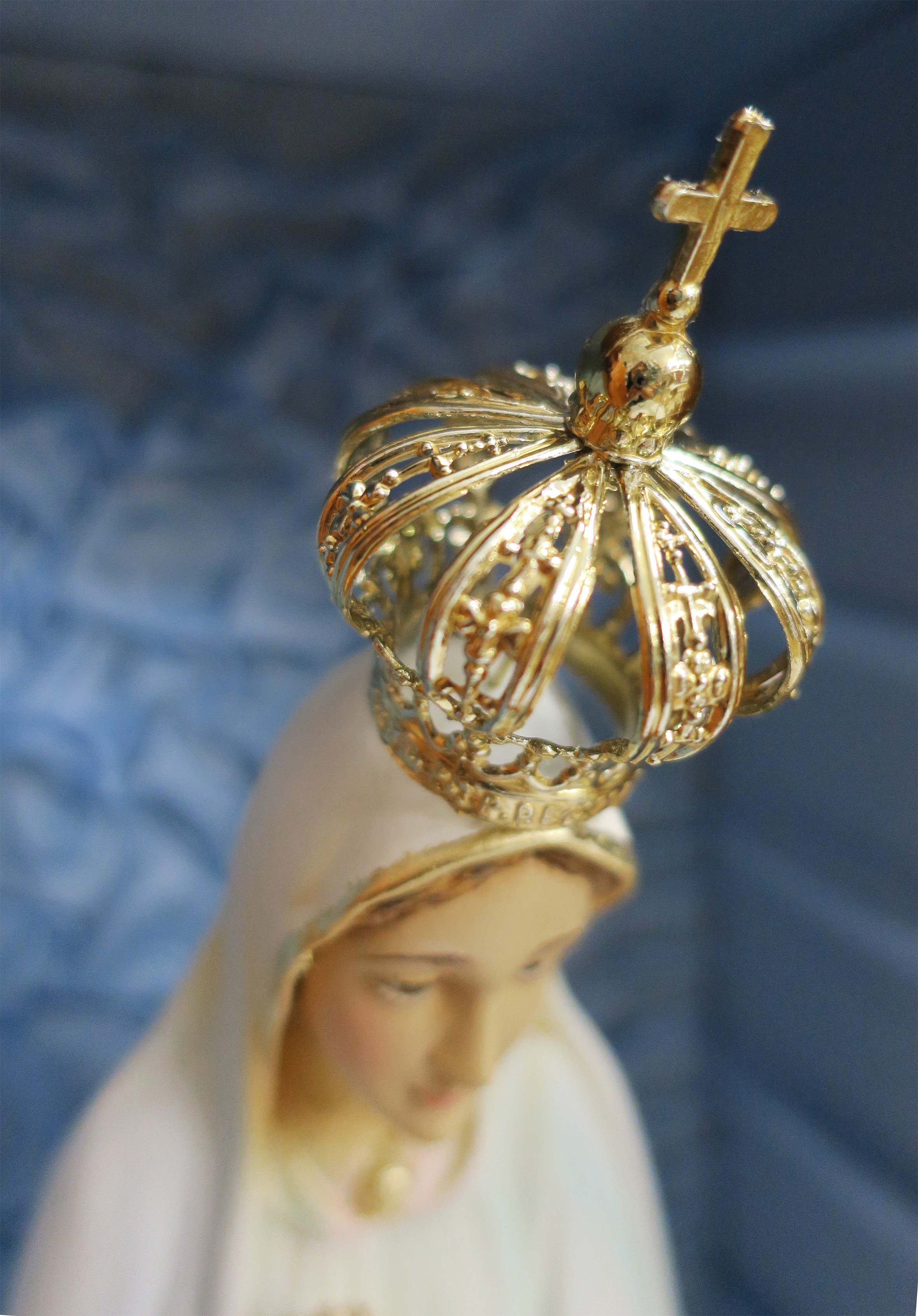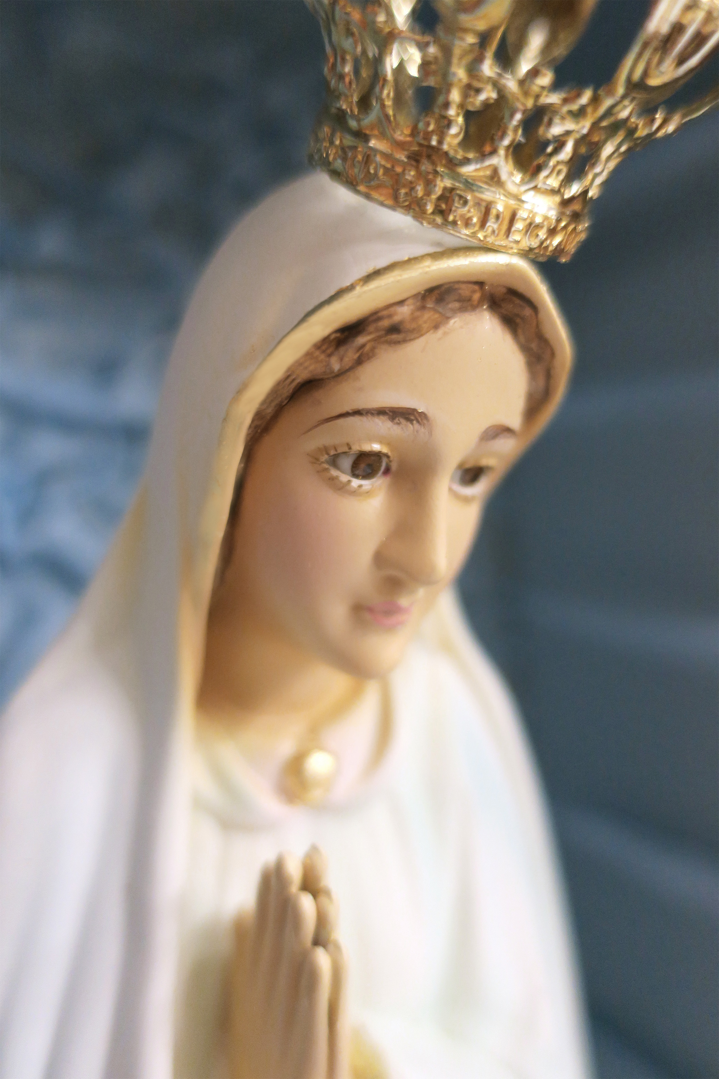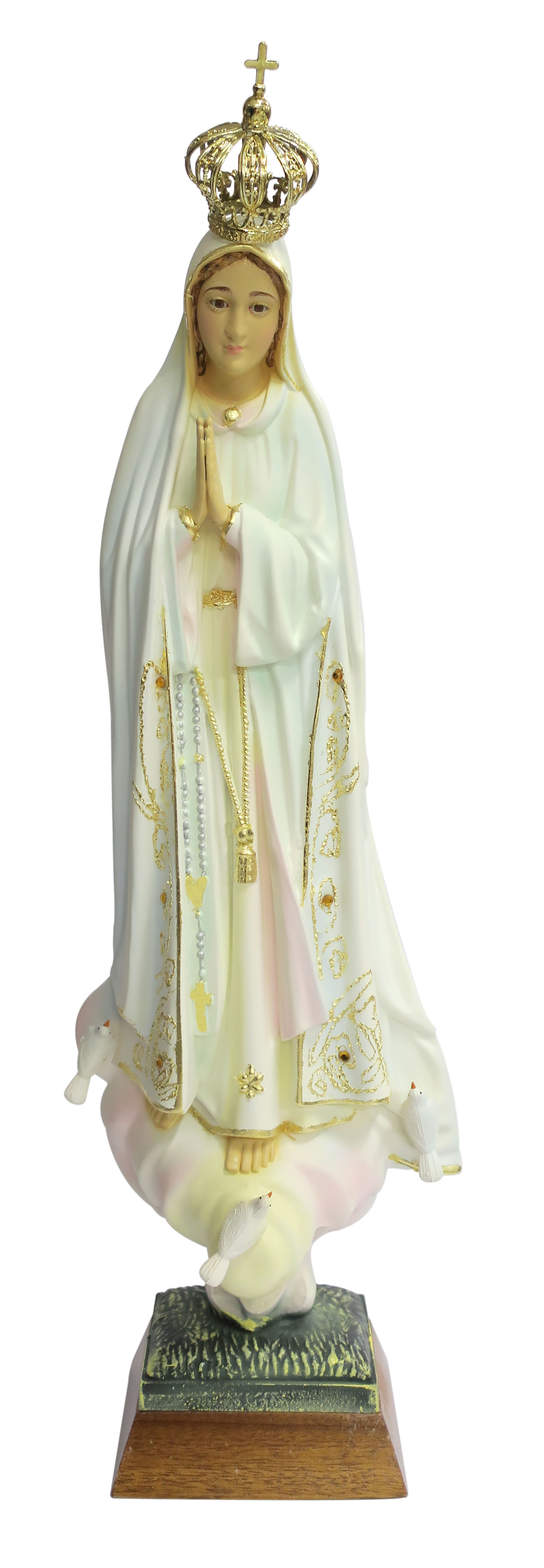 La statua della Vergine di Fatima è contenuta in una custodia in legno, foderata di morbida e vellutata seta. Prodotta a Fatima, in Portogallo, la statua è finemente realizzata in poliestere, liscia e finemente dipinta a mano. Il volto della Vergine, con dolci occhi marroni, è molto delicato. I suoi abiti, abbelliti da bordi in color oro e strass arancioni, sono impreziositi da diverse decorazioni e da tenui sfumature rosa. Sul capo, la Vergine di Fatima porta una corona in metallo di color oro che contribuisce a far risaltare ulteriormente il suo volto. Lungo il vestito, si nota il rosario, elemento classico di questa raffigurazione mariana. La statua della Madonna di Fatima reca sul retro il marchio "Made in Portugal".