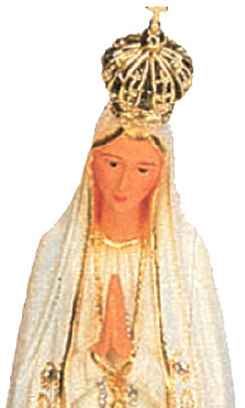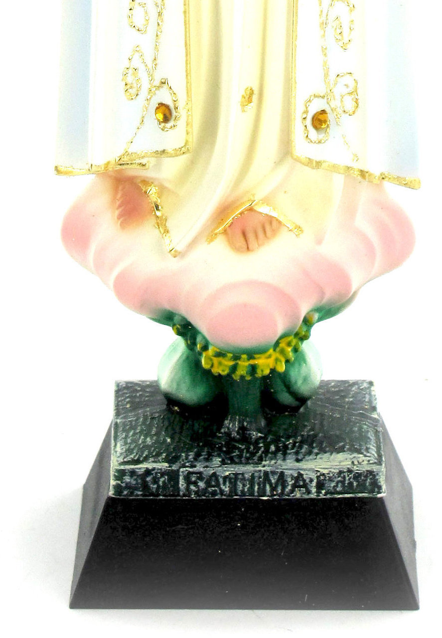 Questa statua della Vergine di Fatima di circa 27 cm d'altezza è prodotta a Fatima, in Portogallo, è realizzata in poliestere ed è dipinta a mano. Il volto della Vergine, qui rappresentata con le mani giunte in preghiera, è molto delicato. I suoi abiti sono abbelliti da bordi e decori in color oro, pieghe e sfumature molto tenui di color giallo e azzurro, e da strass verdi. Sul capo, la Vergine di Fatima porta una corona metallica di color oro che contribuisce a far risaltare ulteriormente il suo volto. Lungo il vestito, si nota il rosario di color argento, ben realizzato, elemento classico di questa raffigurazione mariana. La nuvola su cui poggia vanta sfumature molto delicate di color rosa.