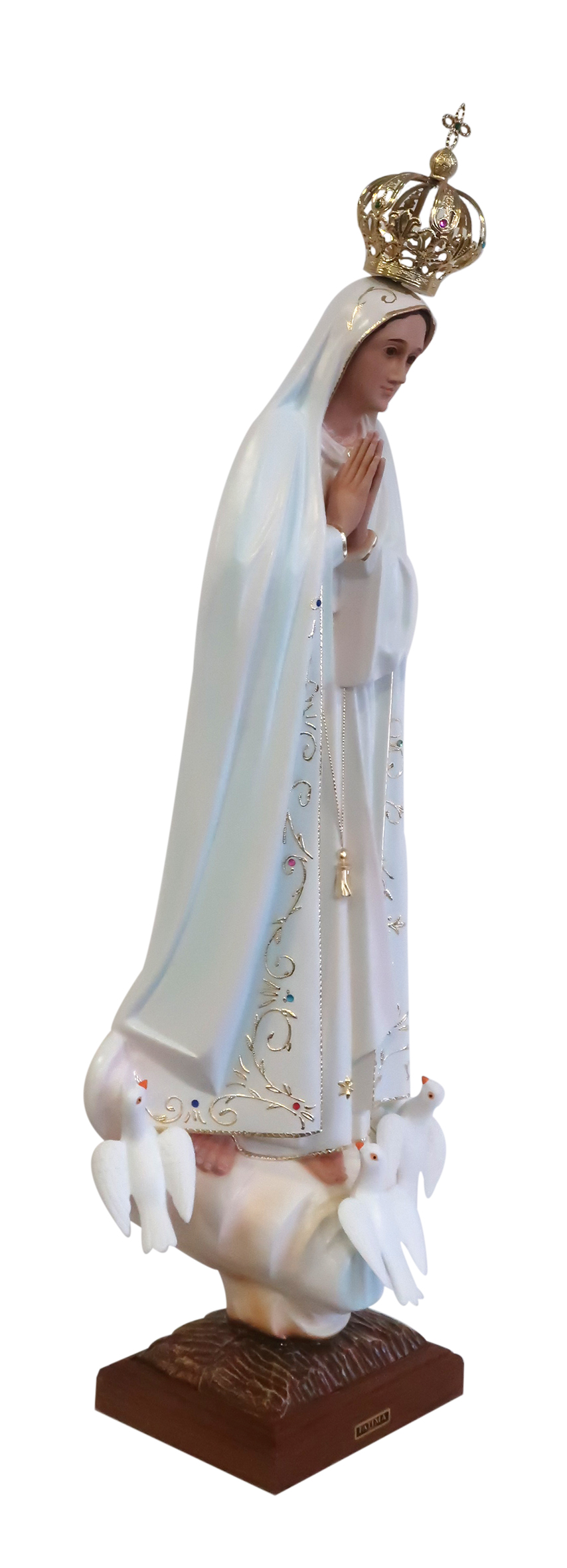 Questa grande statua della Vergine di Fatima di circa 85 cm d'altezza è prodotta a Fatima, in Portogallo, è realizzata in poliestere ed è dipinta a mano. Il volto della Vergine, qui rappresentata con le mani giunte in preghiera, è molto delicato e vanta occhi marroni di cristallo. Il loro aspetto è molto realistico e curato.