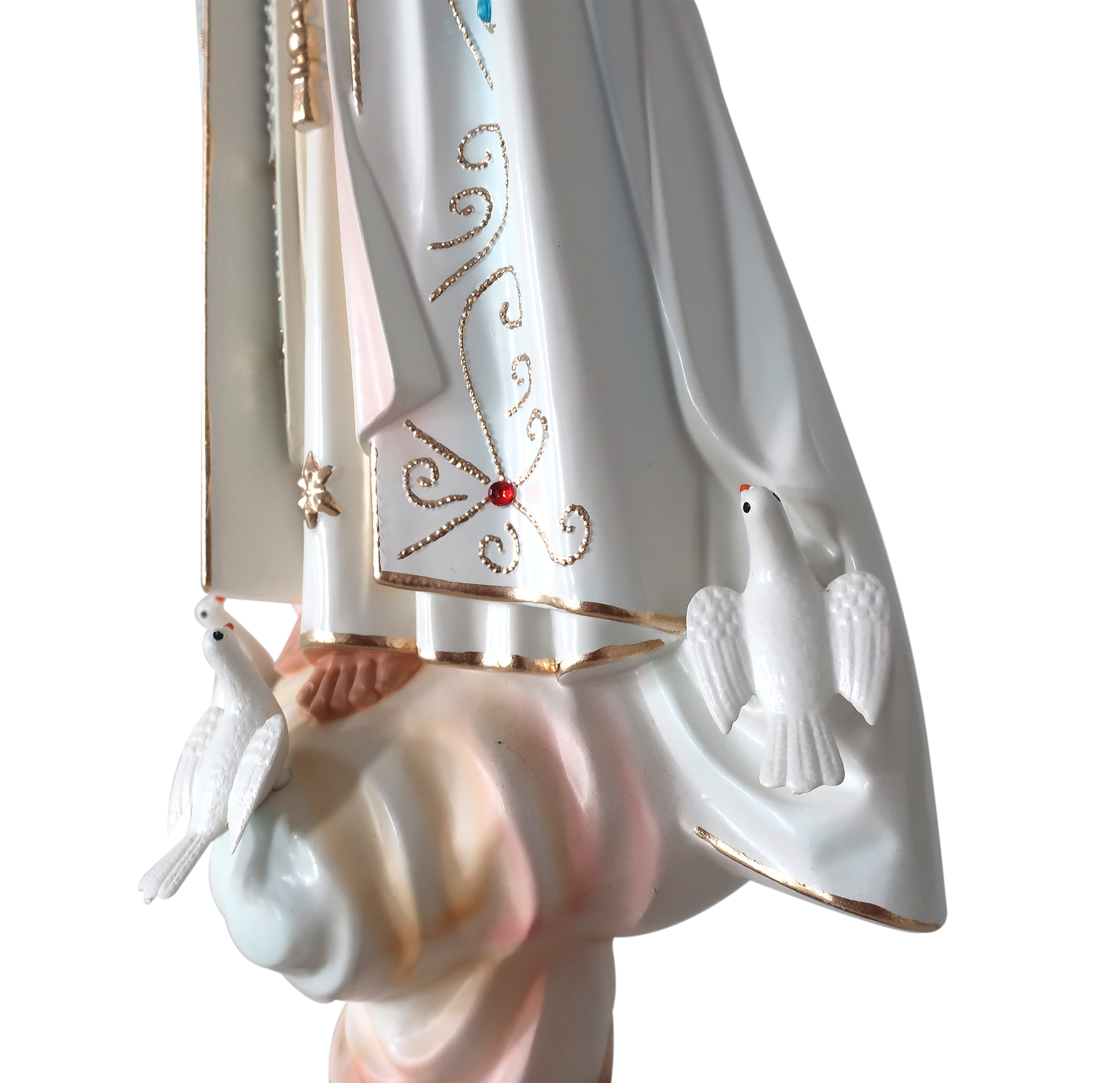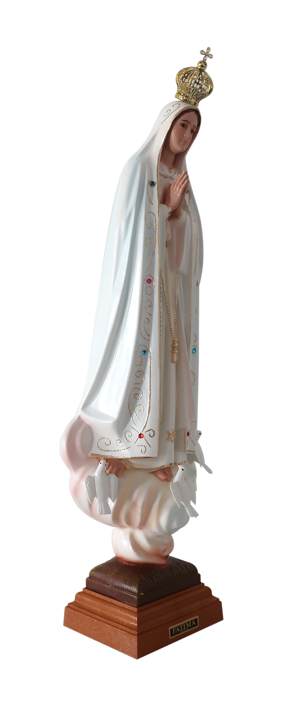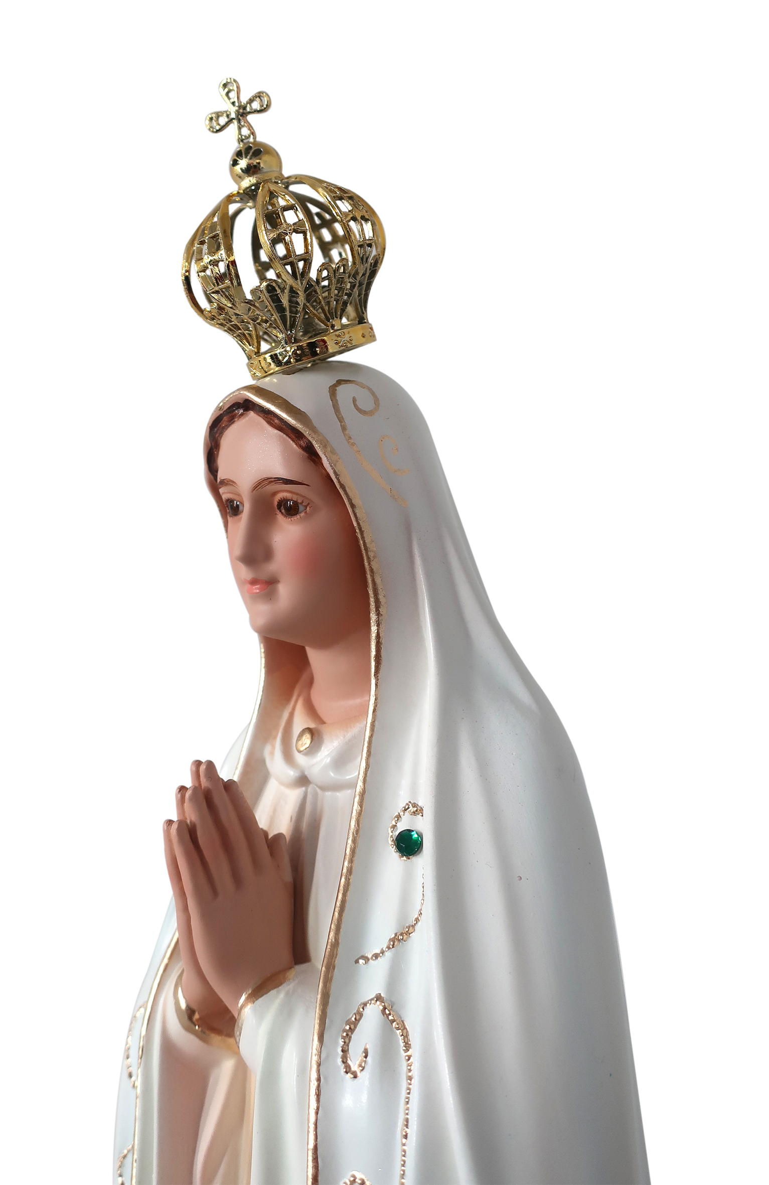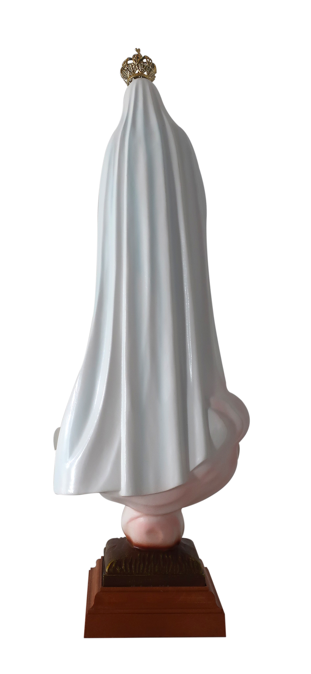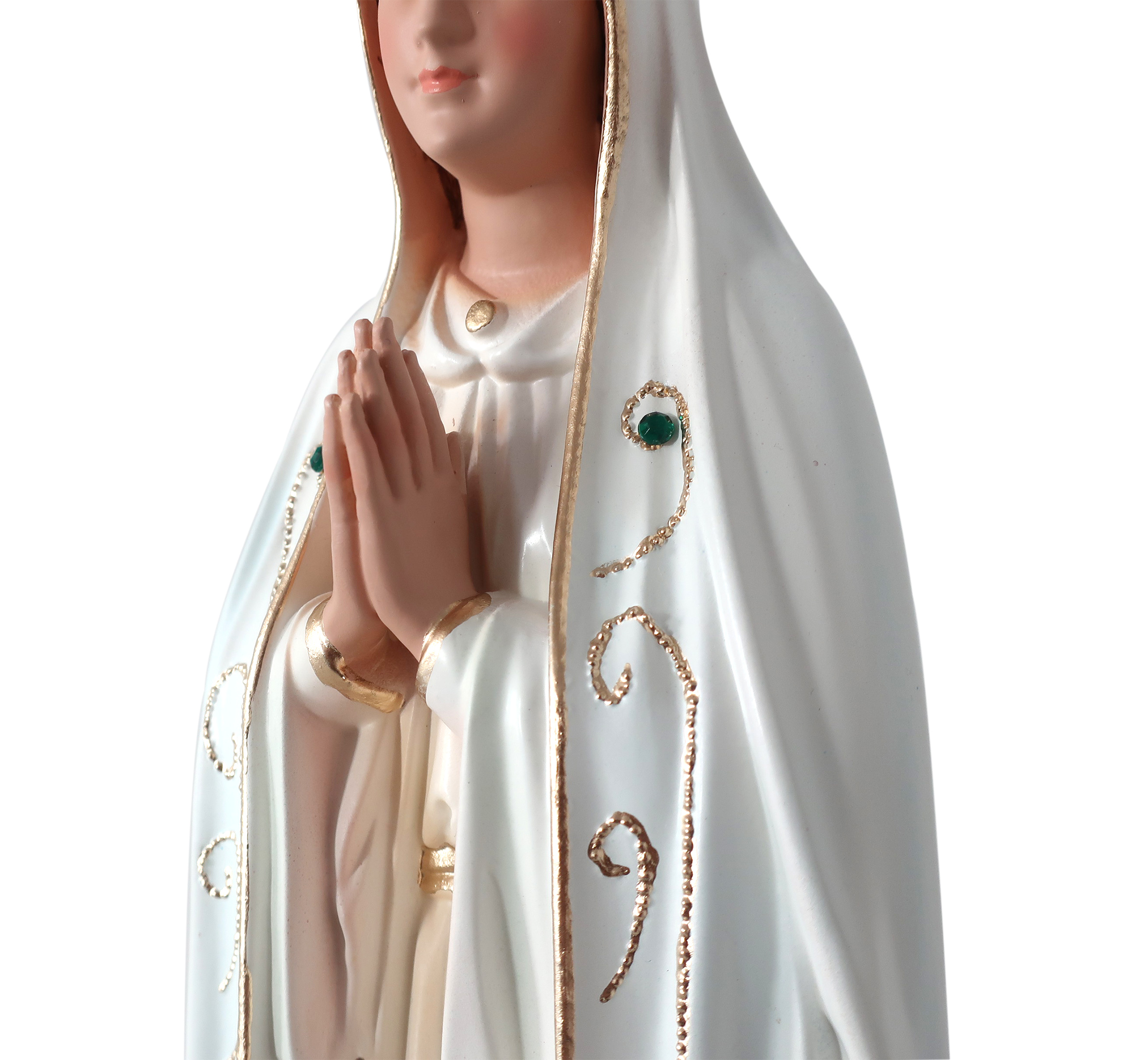 Questa statua della Vergine di Fatima di circa 45 cm d'altezza è prodotta a Fatima, in Portogallo, è realizzata in poliestere ed è dipinta a mano. Il volto della Vergine, qui rappresentata con le mani giunte in preghiera, è molto delicato e vanta occhi di vetro. Il loro aspetto è molto realistico e curato.