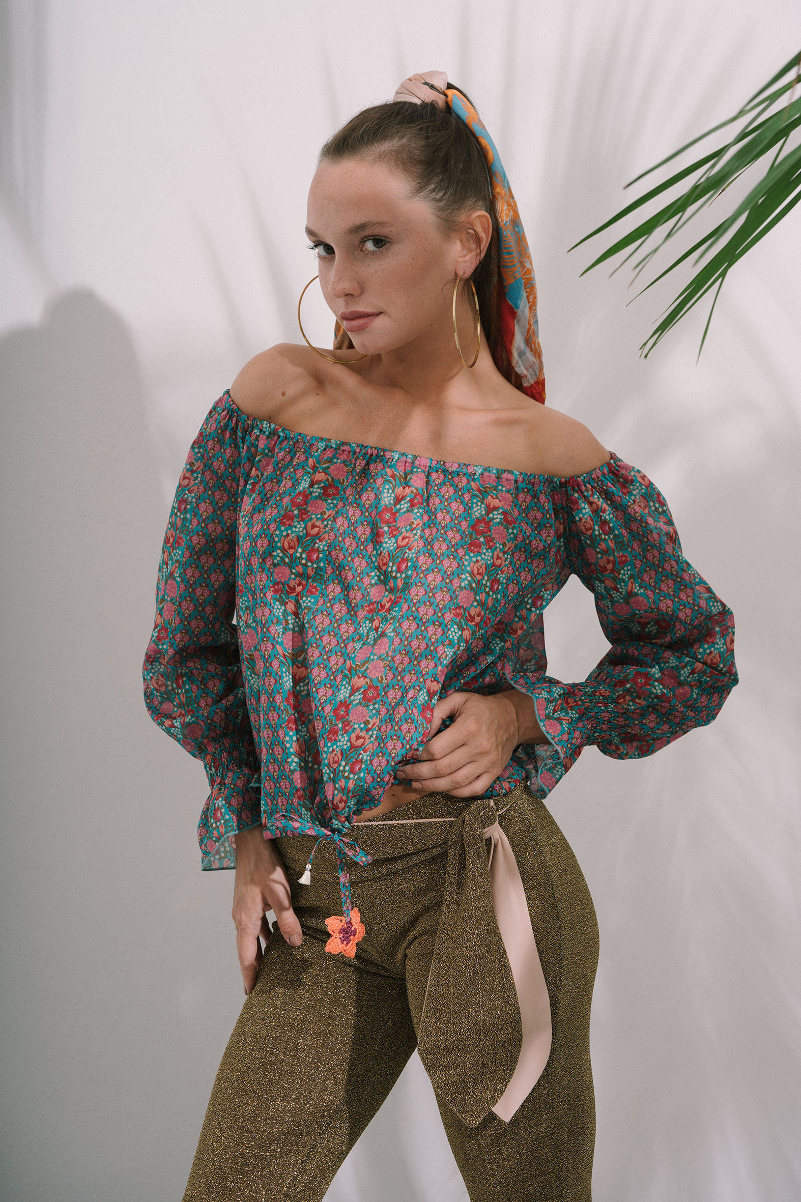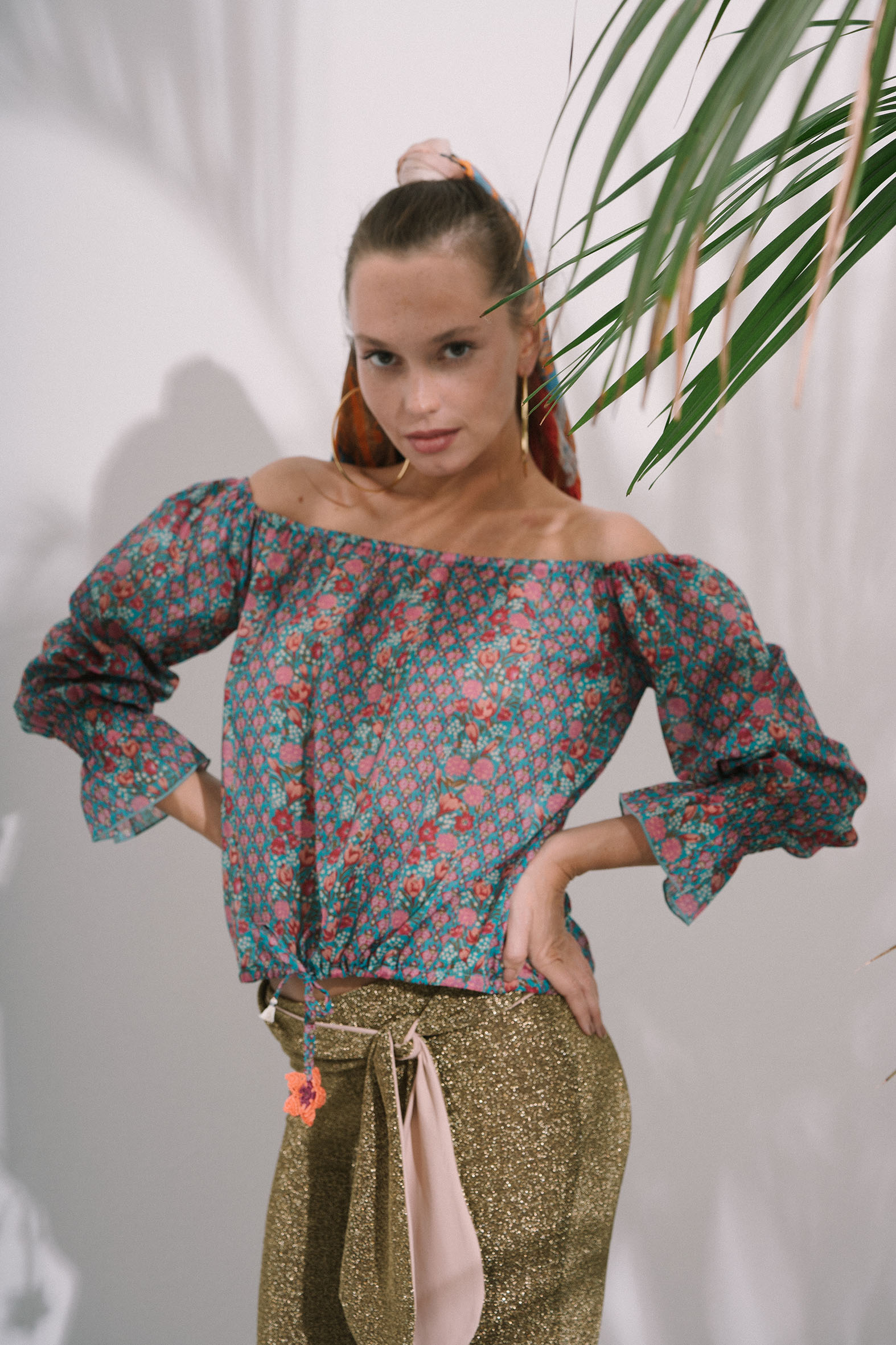 Blusa in voile di cotone; fantasia “Jakarta”; scollo elastico a “barchetta”; fondo maniche a sbuffo, coulisse in vita con lacci di chiusura scorrevoli e nappine sui finali.