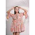Caftano corto in cotone, fantasia “Papua”; inserti in pizzo macramé sulle maniche, giochi di frange e passamanerie su scollo e fondo maniche.