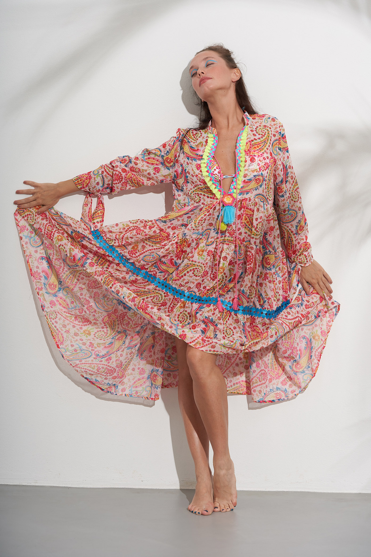Caftano lungo fantasia “Papua”; maniche con allacciatura a fiocco; giochi di frange, passamanerie, fiore crochet fatto a mano e pom-pom sullo scollo; nastro decorativo tra le balze.