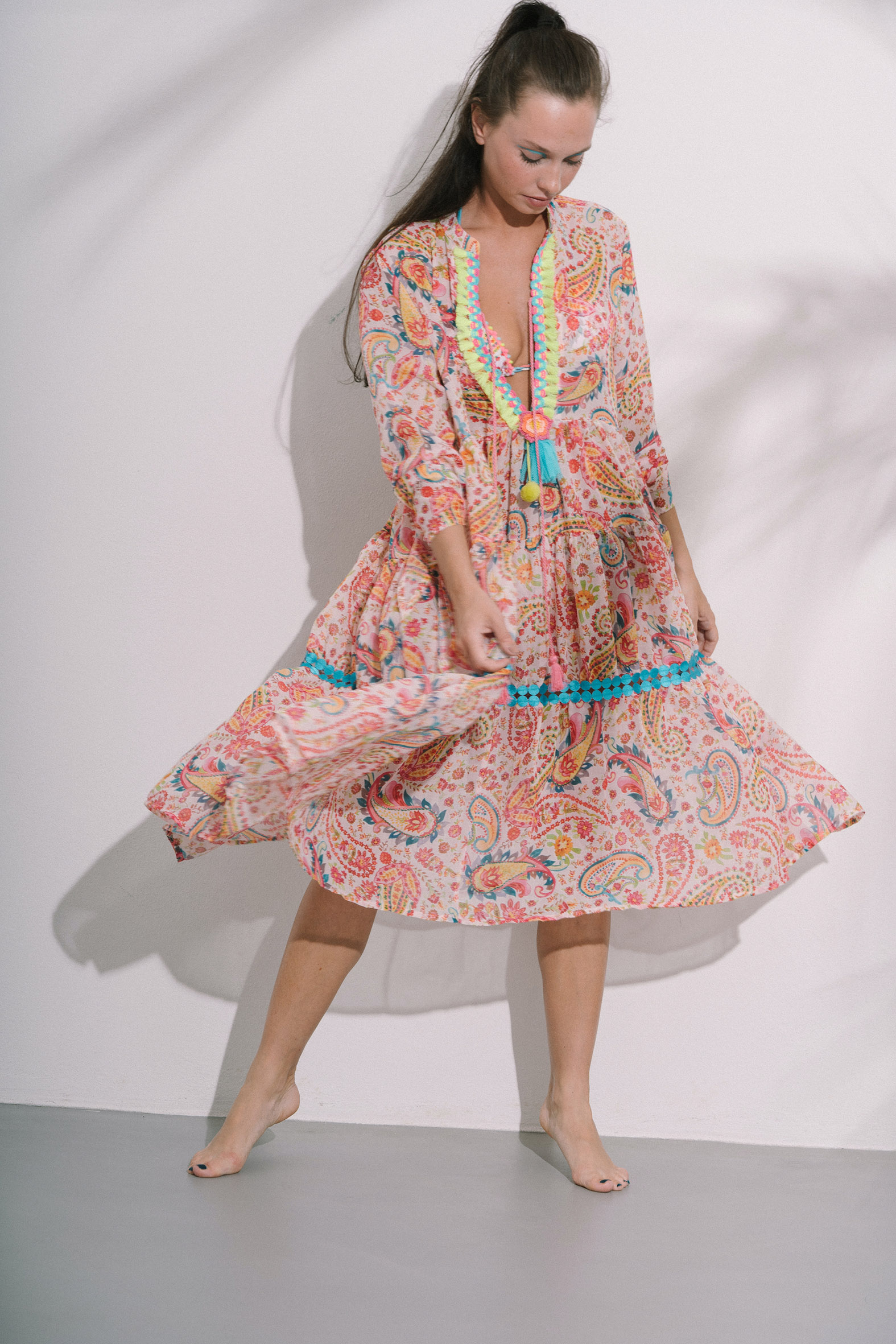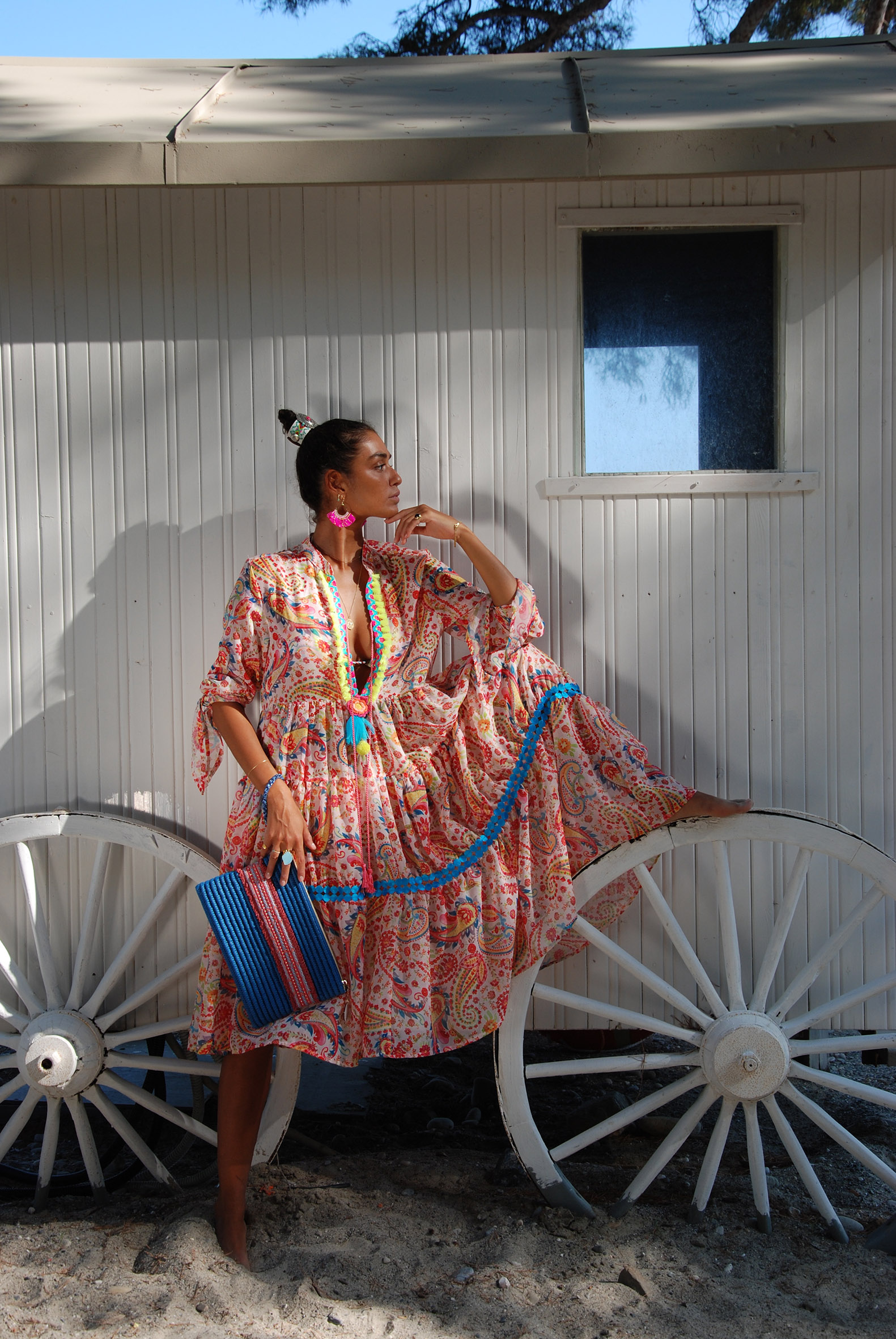 Caftano lungo fantasia “Papua”; maniche con allacciatura a fiocco; giochi di frange, passamanerie, fiore crochet fatto a mano e pom-pom sullo scollo; nastro decorativo tra le balze.