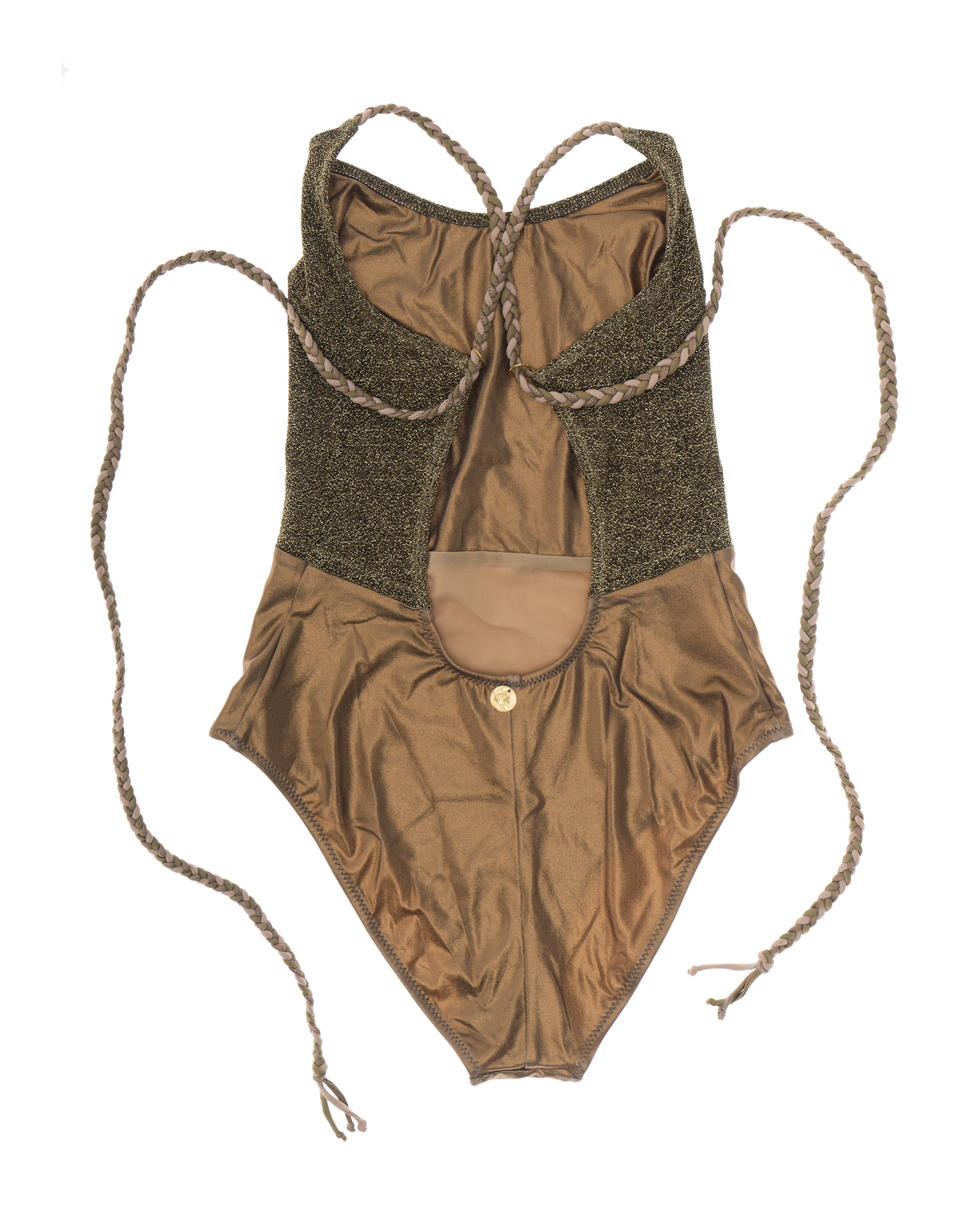 Costume intero in lurex e lamina bronzo; lacci a treccia fatta a mano; allacciatura al collo o sulla schiena.