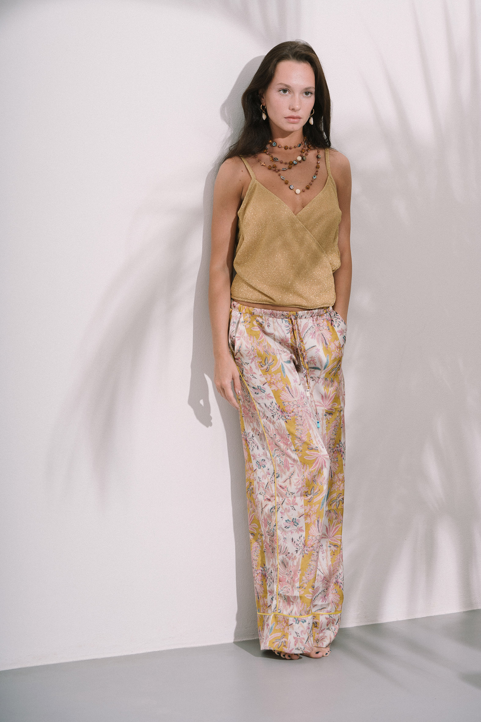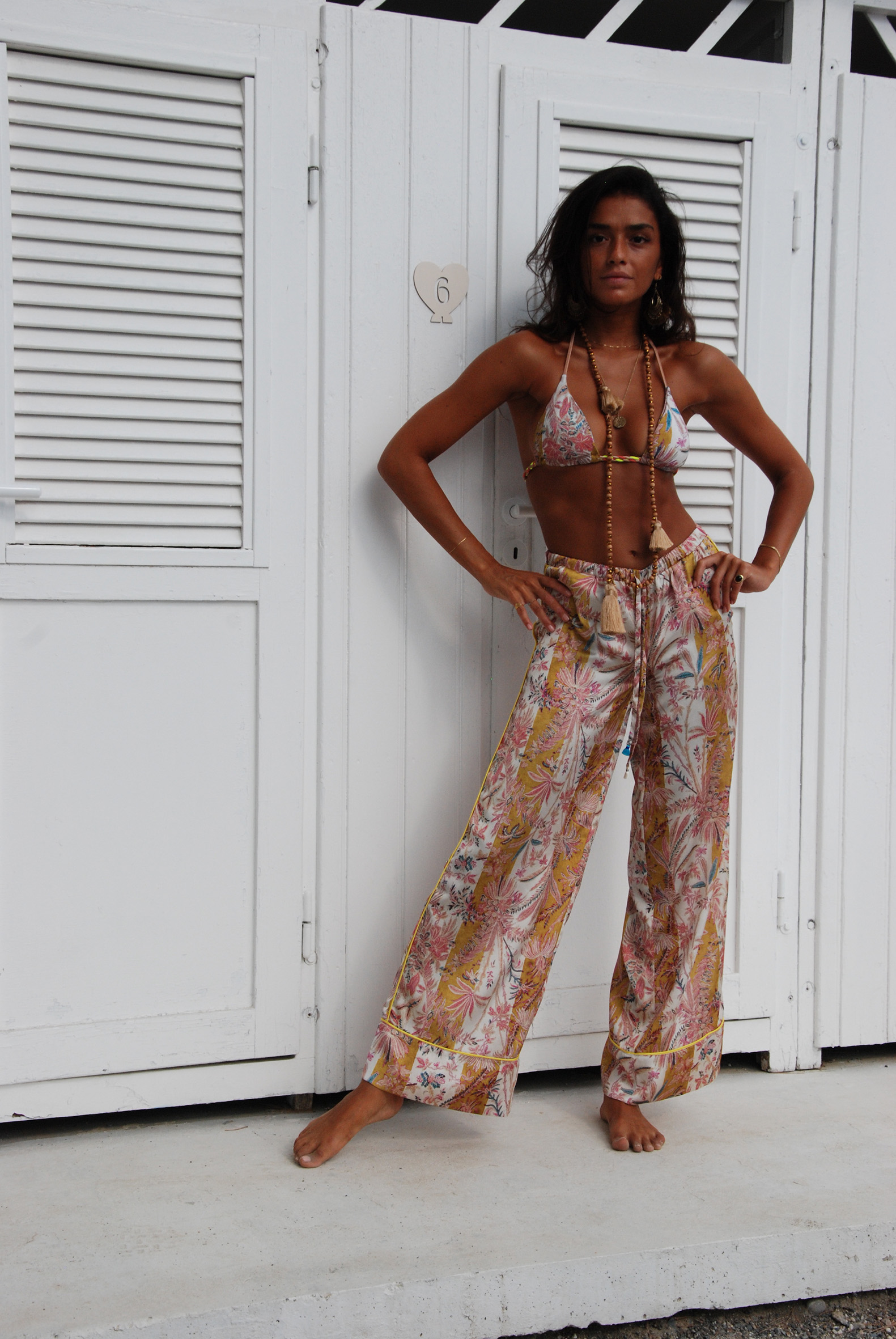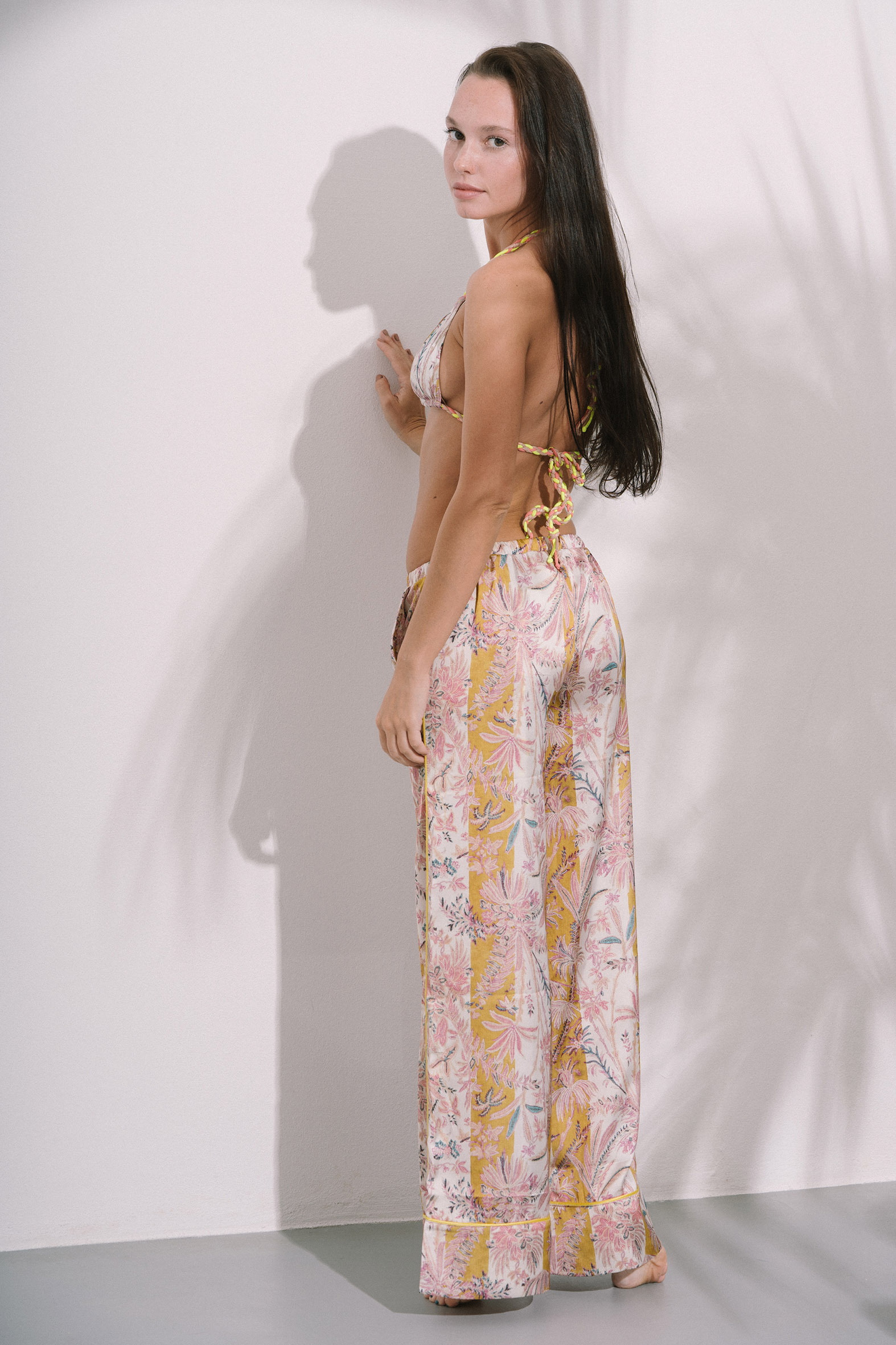 Pantalone Palazzo in raso, fantasia “Hiva Oa”; elastico morbido in vita con coulisse; lacci con nappine colorate sui finali; tasche laterali.