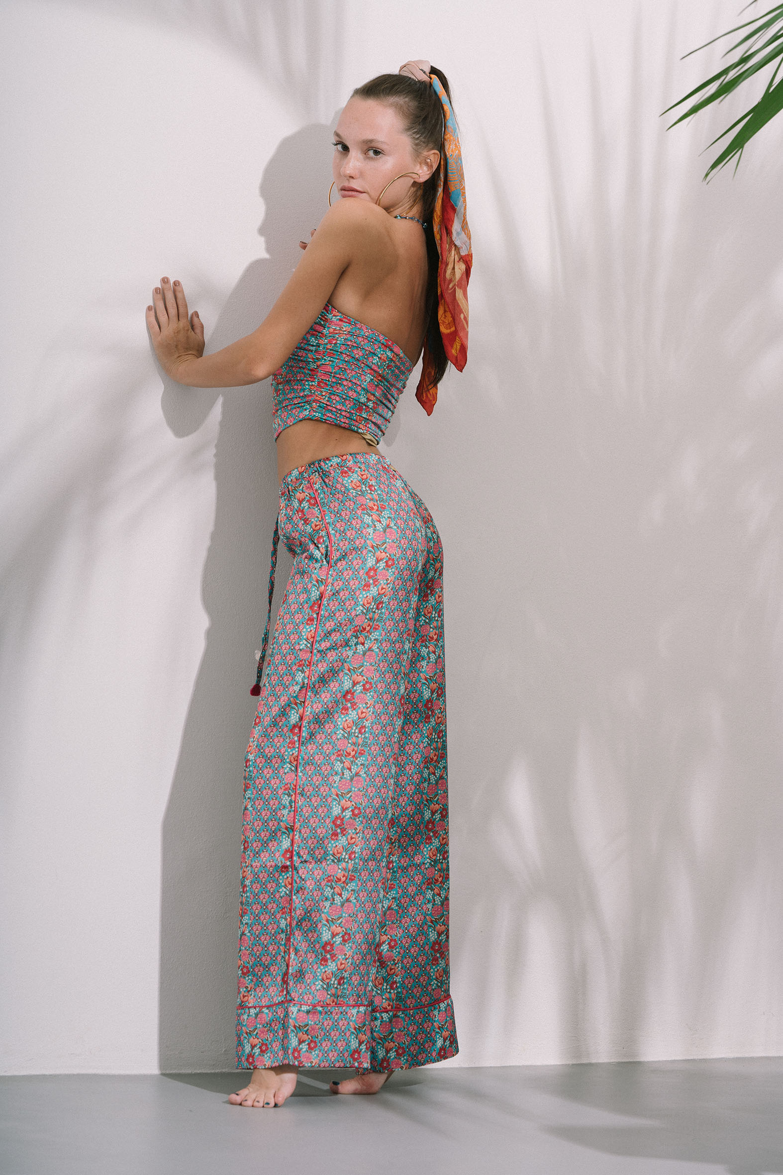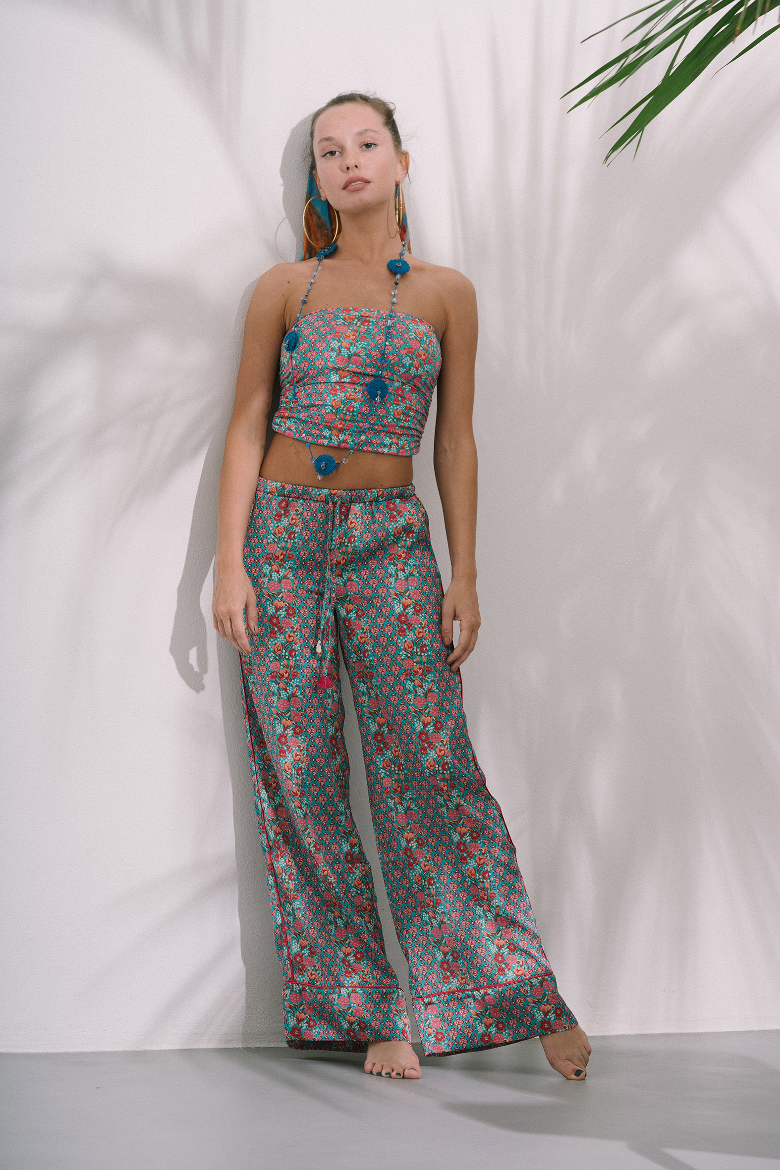 Pantalone Palazzo in raso, fantasia “Jakarta”; elastico morbido in vita con coulisse; lacci con nappine colorate sui finali; tasche laterali.