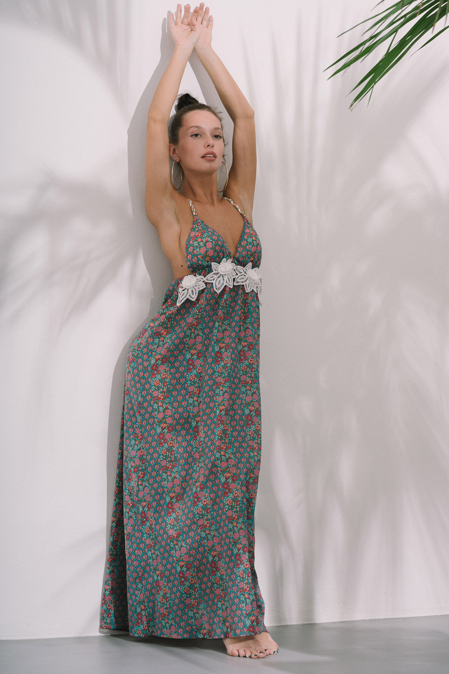 Abito lungo a schiena nuda in voile di cotone; fantasia “Jakarta”; allacciatura al collo o sulla schiena con fettuccia in lycra multi-color intrecciata a mano; raffinato nastro sotto petto in macramé.