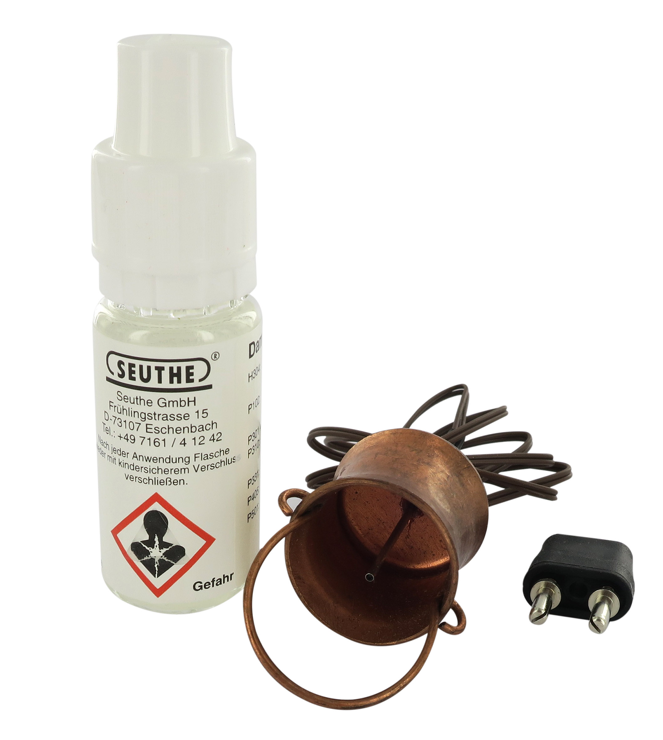 Accessorio elettrico per presepe: Pentola con generatore di fumo e liquido (10 ml). Funzionamento a bassa tensione (3,5 V). Materiali: liquido distillato, rame e materiale elettrico.