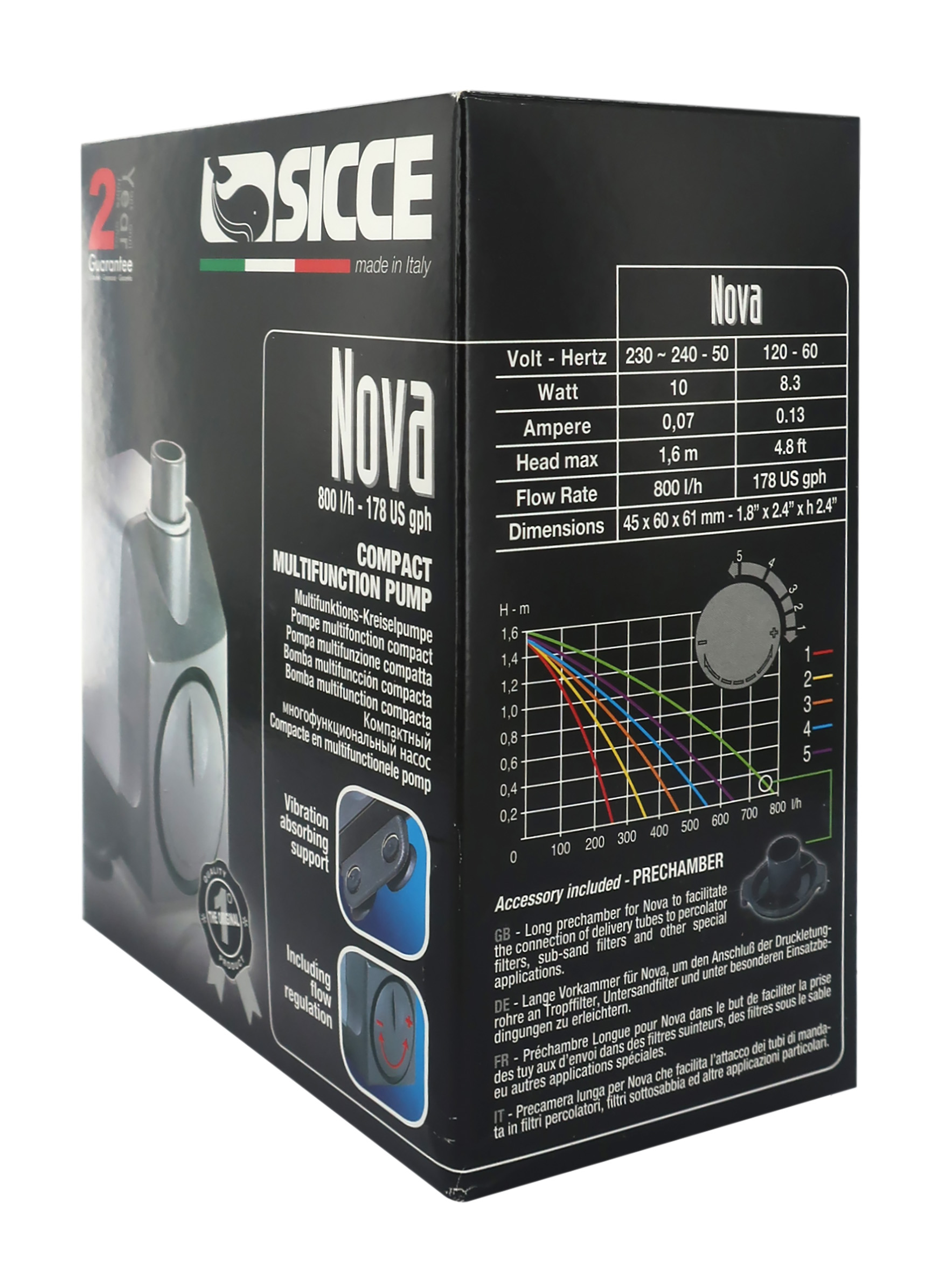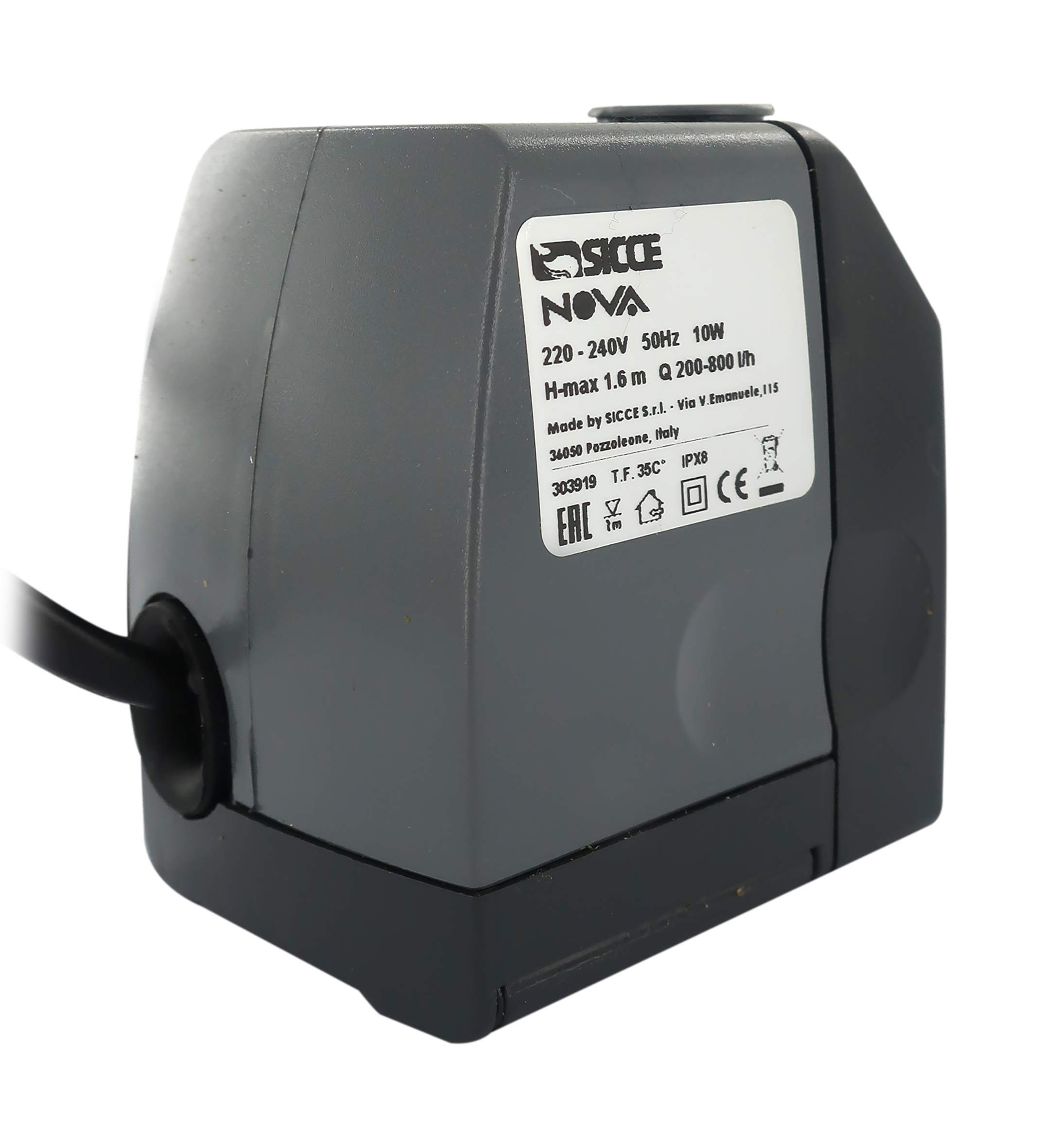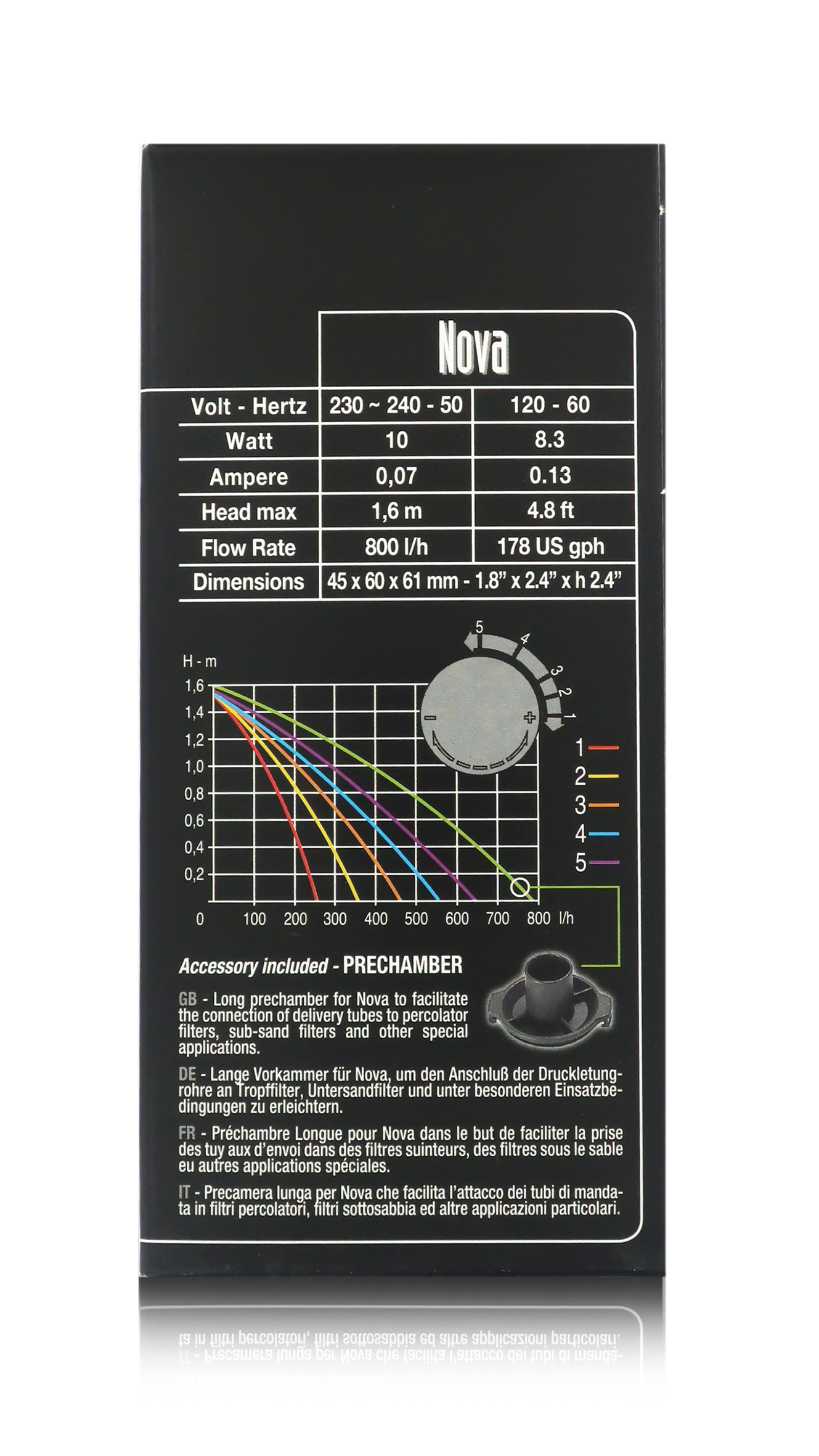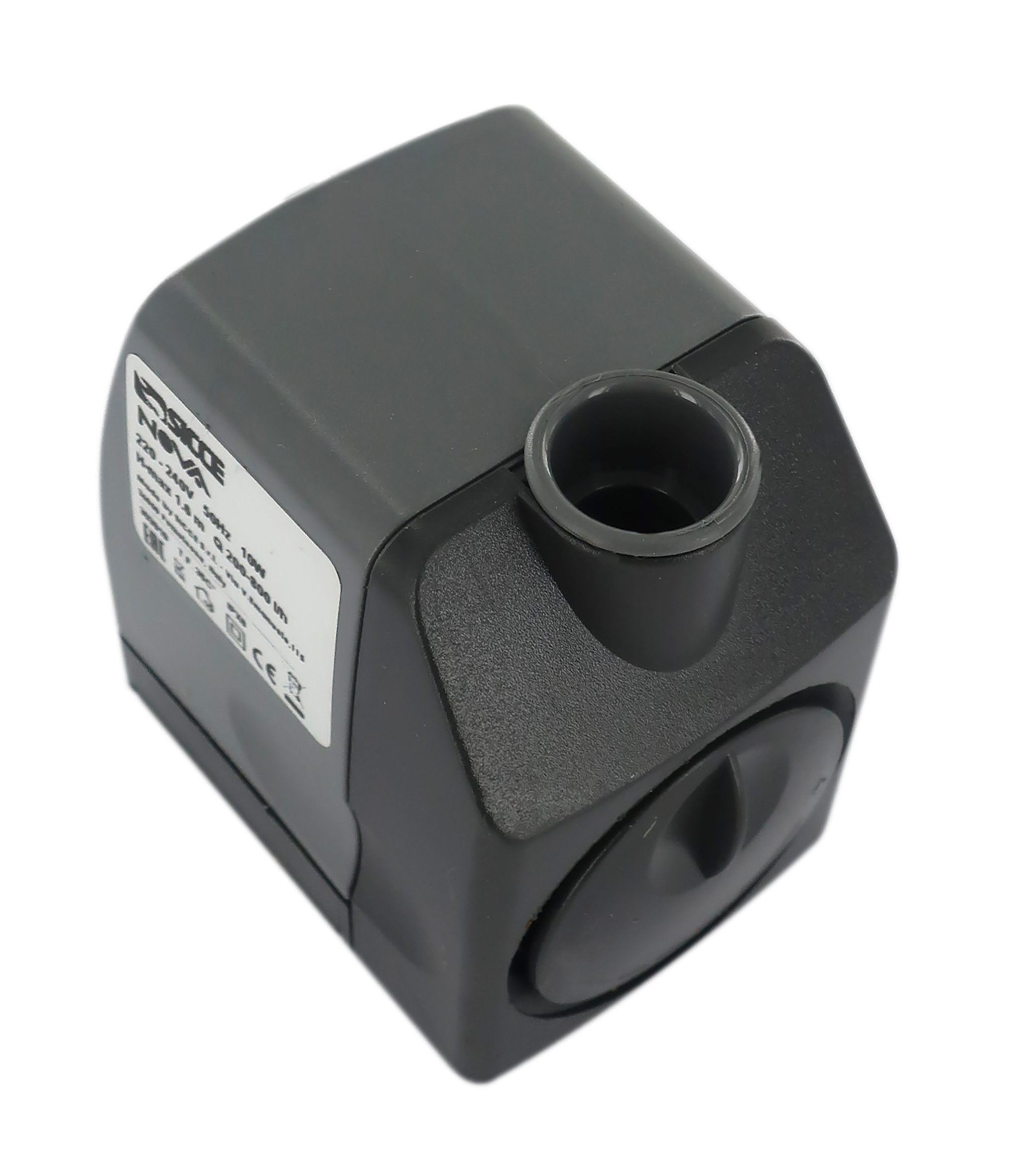 Accessori elettrici per presepe: "Nova" è una pompa totalmente sommergibile azionata da un motore sincrono a magnete permanente. Nella parte frontale, la pompa è provvista di un regolatore di flusso che consente di variare con precisione la portata d'acqua fino a 800 L/H e 160 cm di prevalenza. Quando necessita un'ampia superficie d'appoggio, si possono facilmente utilizzare i supporti a ventosa ripiegabili di cui la pompa è dotata. Alimentazione elettrica 220 V.