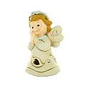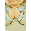 L'angelo che prega con luce, molto adatto per bambini, è una statuina di resina dipinta vuota al suo interno, che ospita una luce LED alimentata da batterie tipo AG3 (spesso usate negli orologi). Le vesti dell'angelo hanno dei fori a forma di cuore, da cui esce la luce prodotta dalla lampadina al suo interno. Il dolce angelo indossa una veste color crema, dagli orli azzurri, e ha le mani conserte in segno di preghiera. Sul volto beato, con gote sfumate, si notano i capelli biondi mossi, adornati da una corona di fiori azzurri. L'uso di colori abbastanza coprenti e opachi dona alla statuina un aspetto molto simile all'argilla.