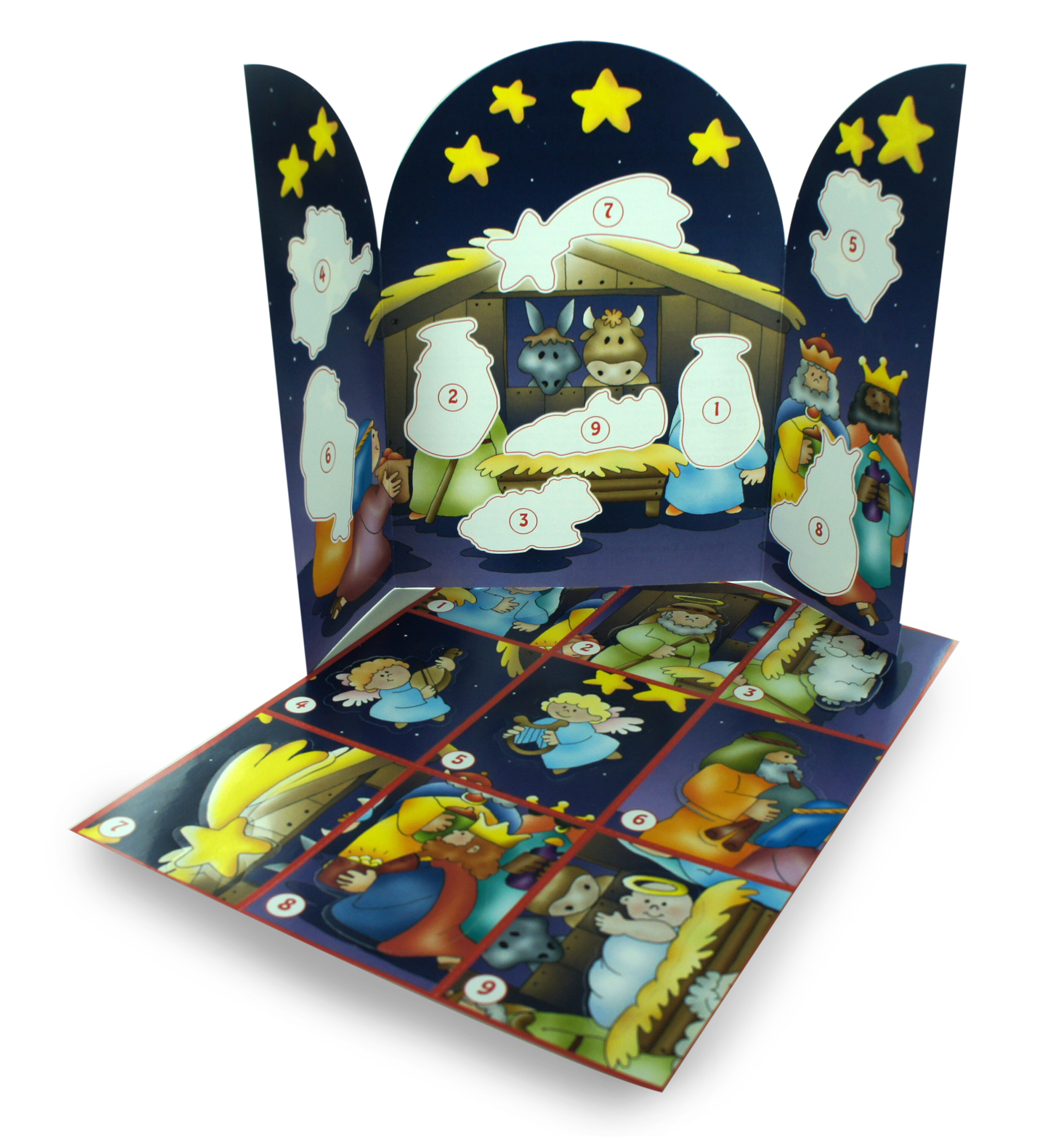 Novena di Natale in cartoncino con nove adesivi da attaccare dal giorno 17 al giorno 25 dicembre,per attendere in allegria il Santo Natale.