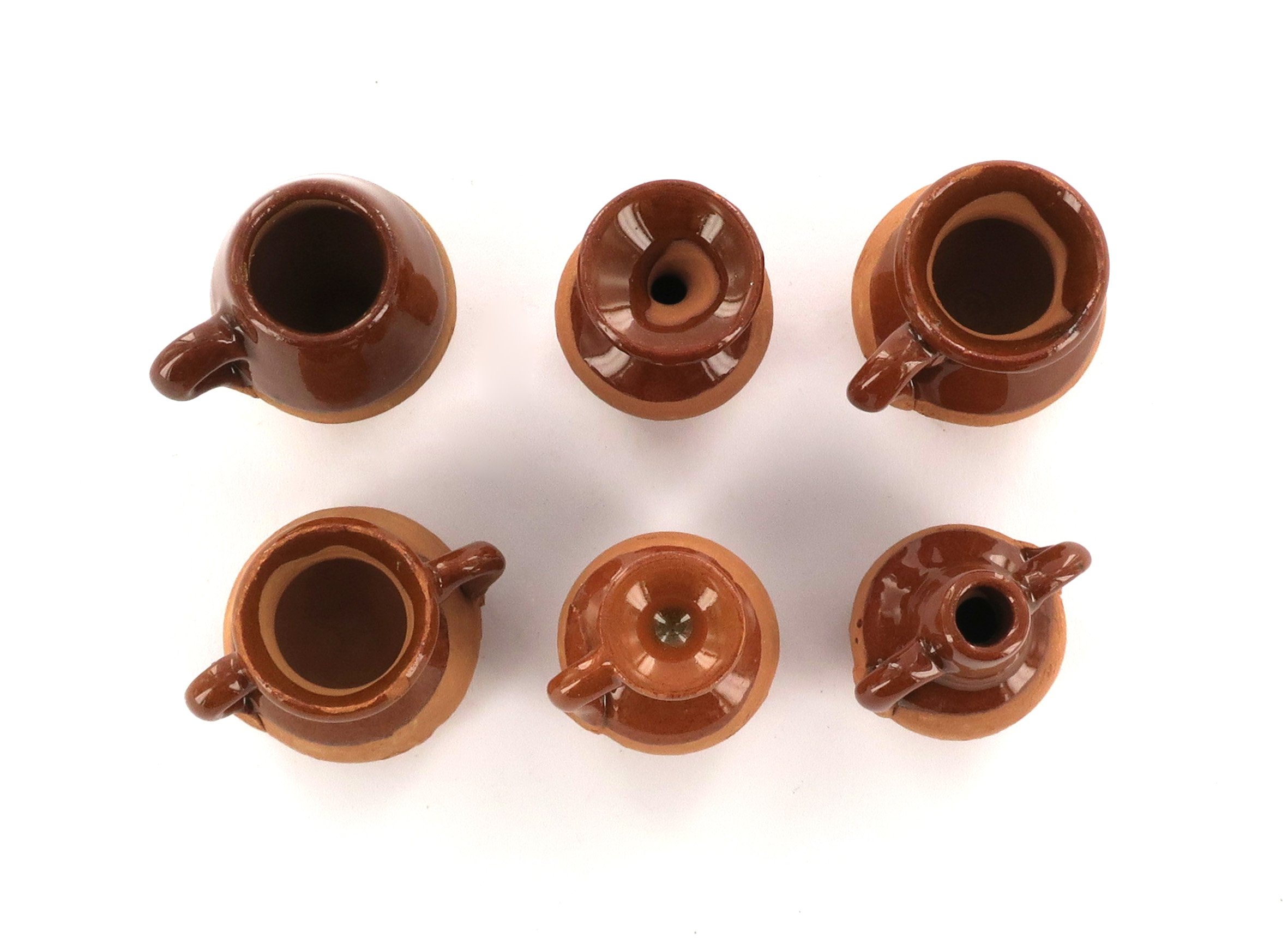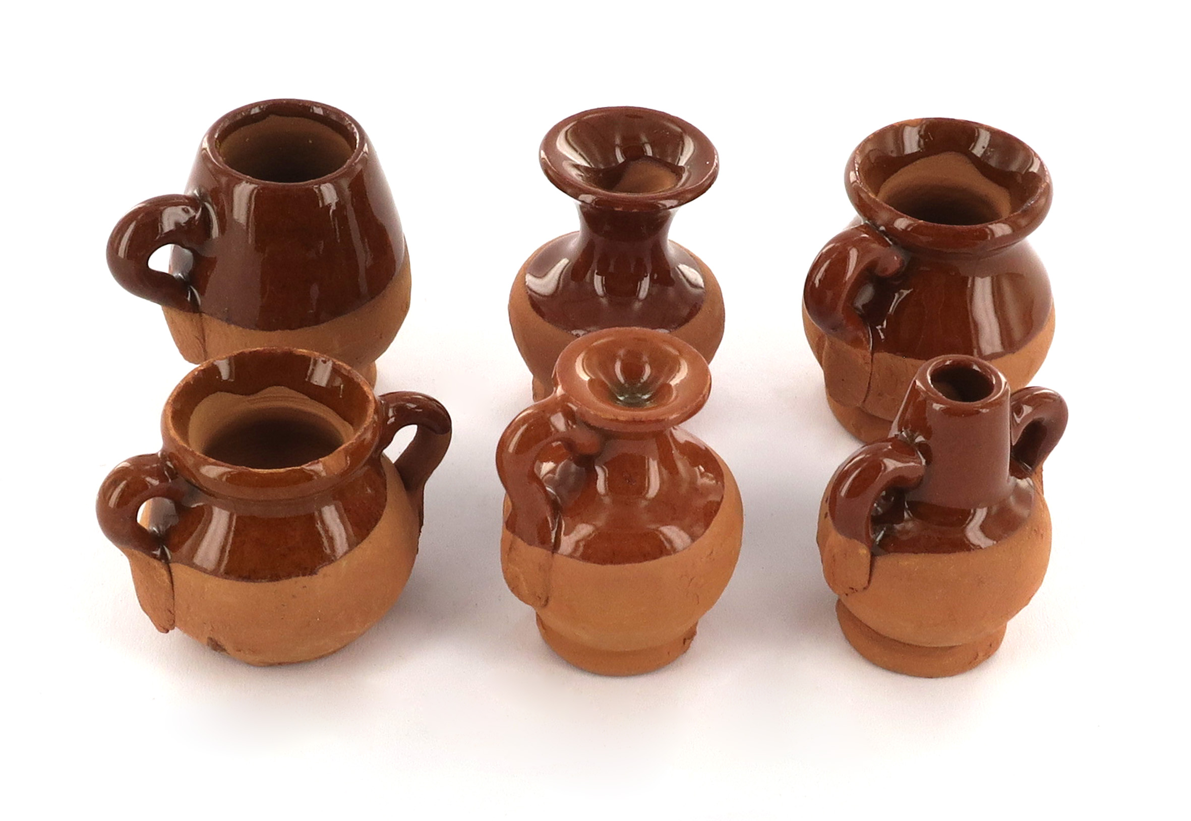 Accessori per presepe: Busta con 6 vasetti in terracotta vetrificati. Dimensioni: 3 cm. Materiali: terracotta. Realizzato artigianalmente in Italia.