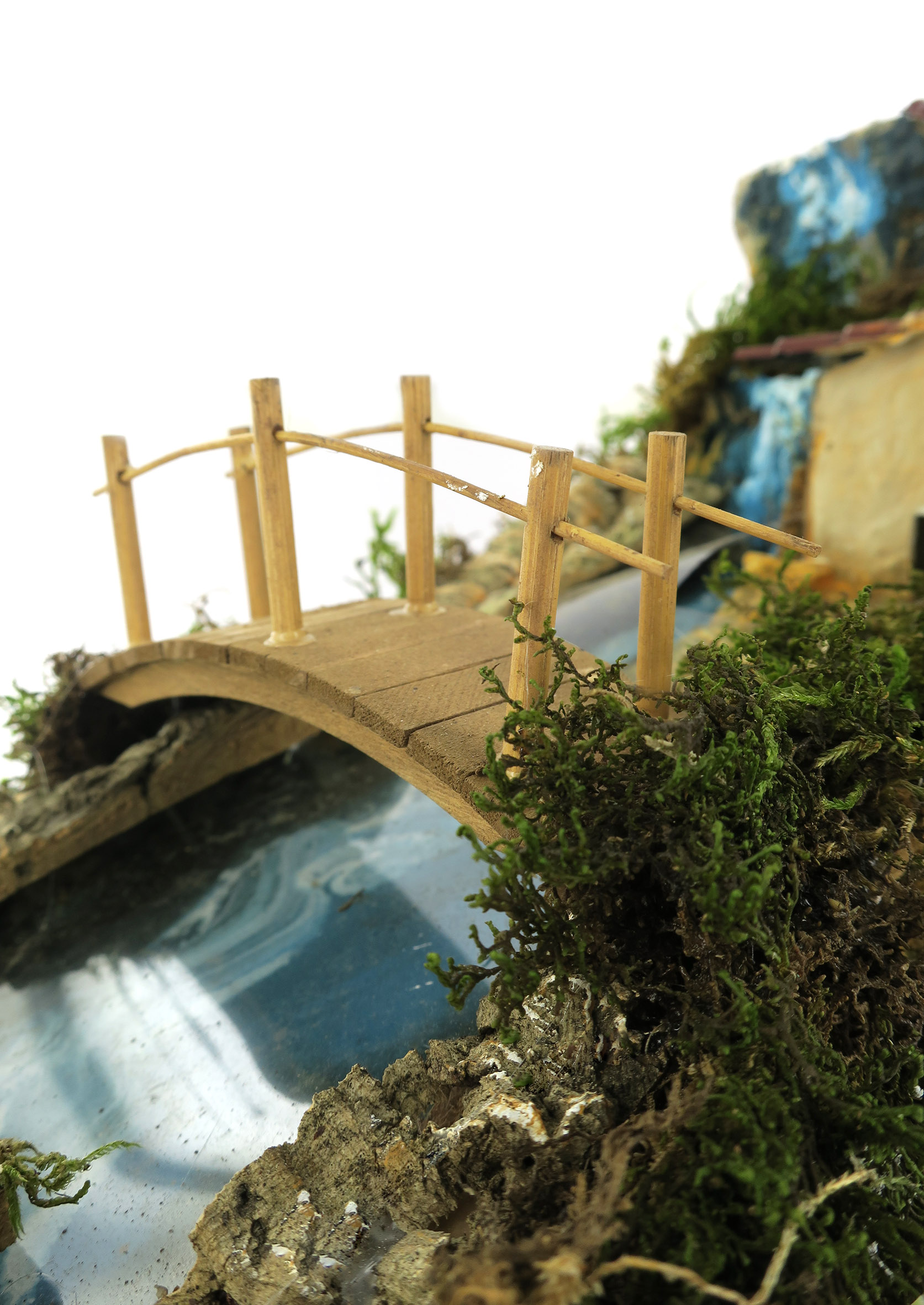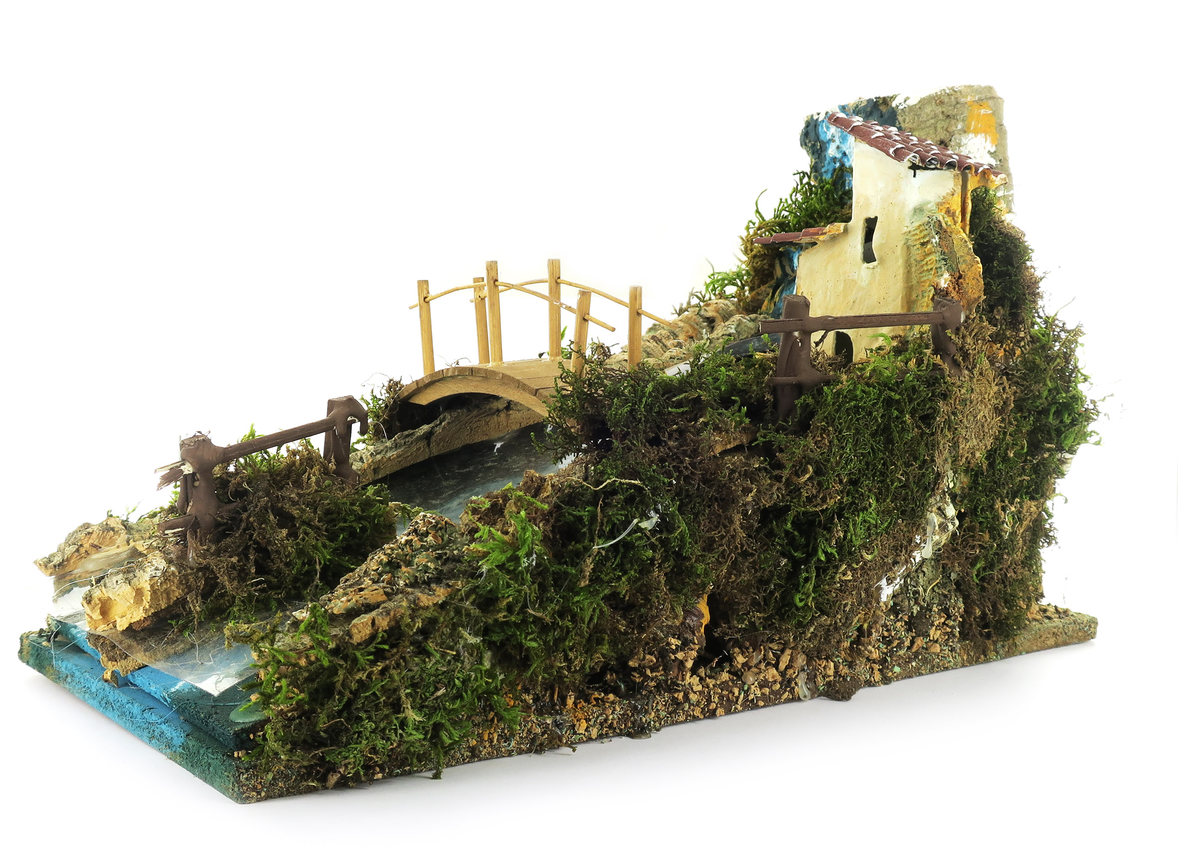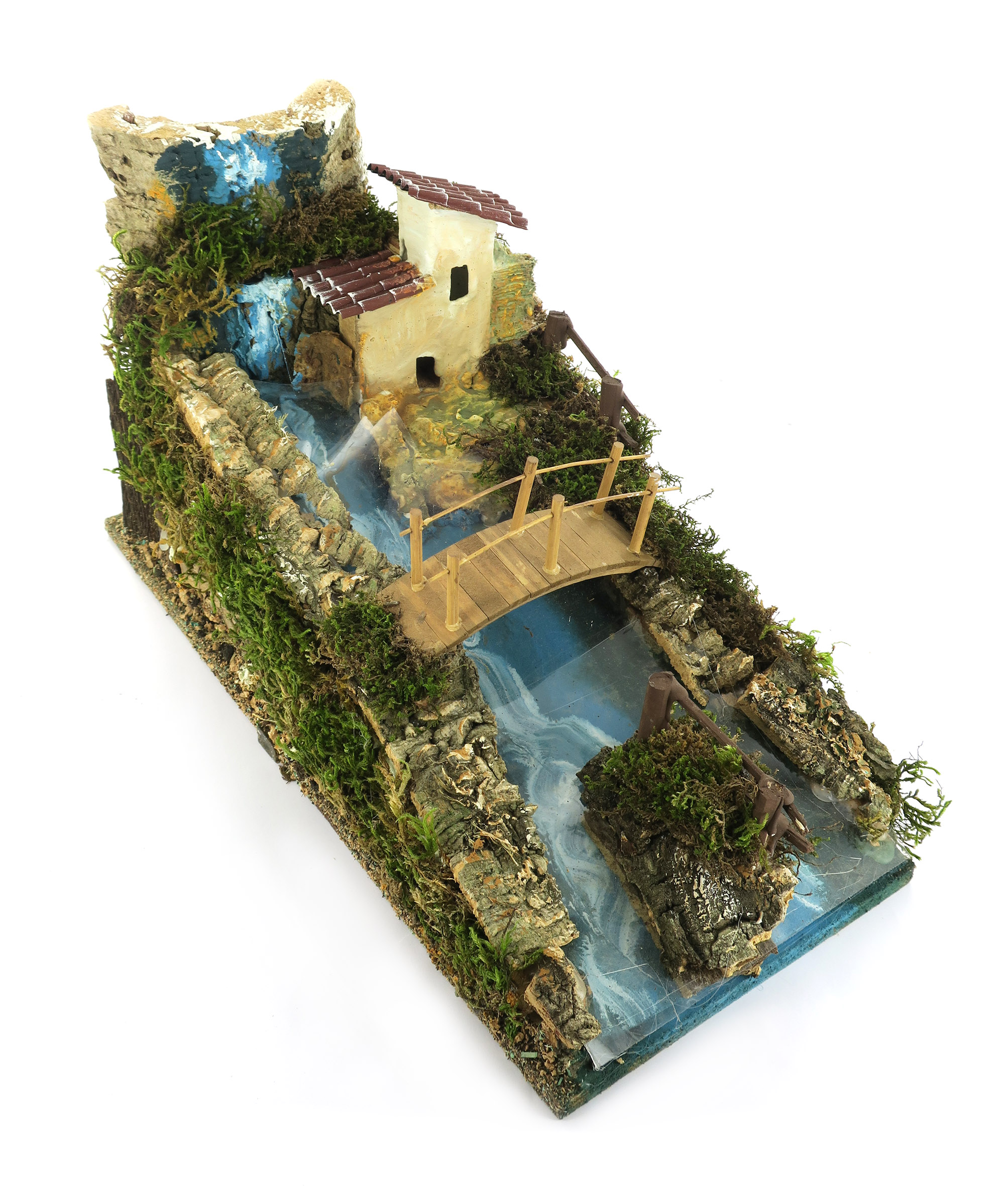 Accessori per presepe: Cascata rapida con corso che si sdoppia. Decorato con casetta e ponticello, oltre a dettagli in sughero e muschio che ricreano elementi naturali del paesaggio.
