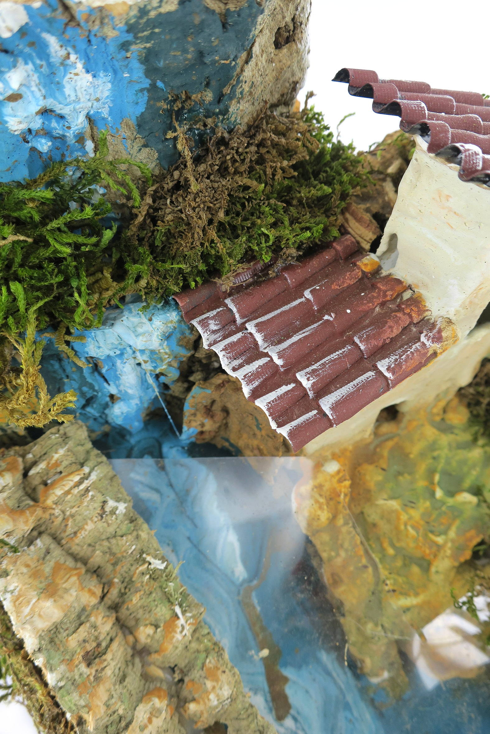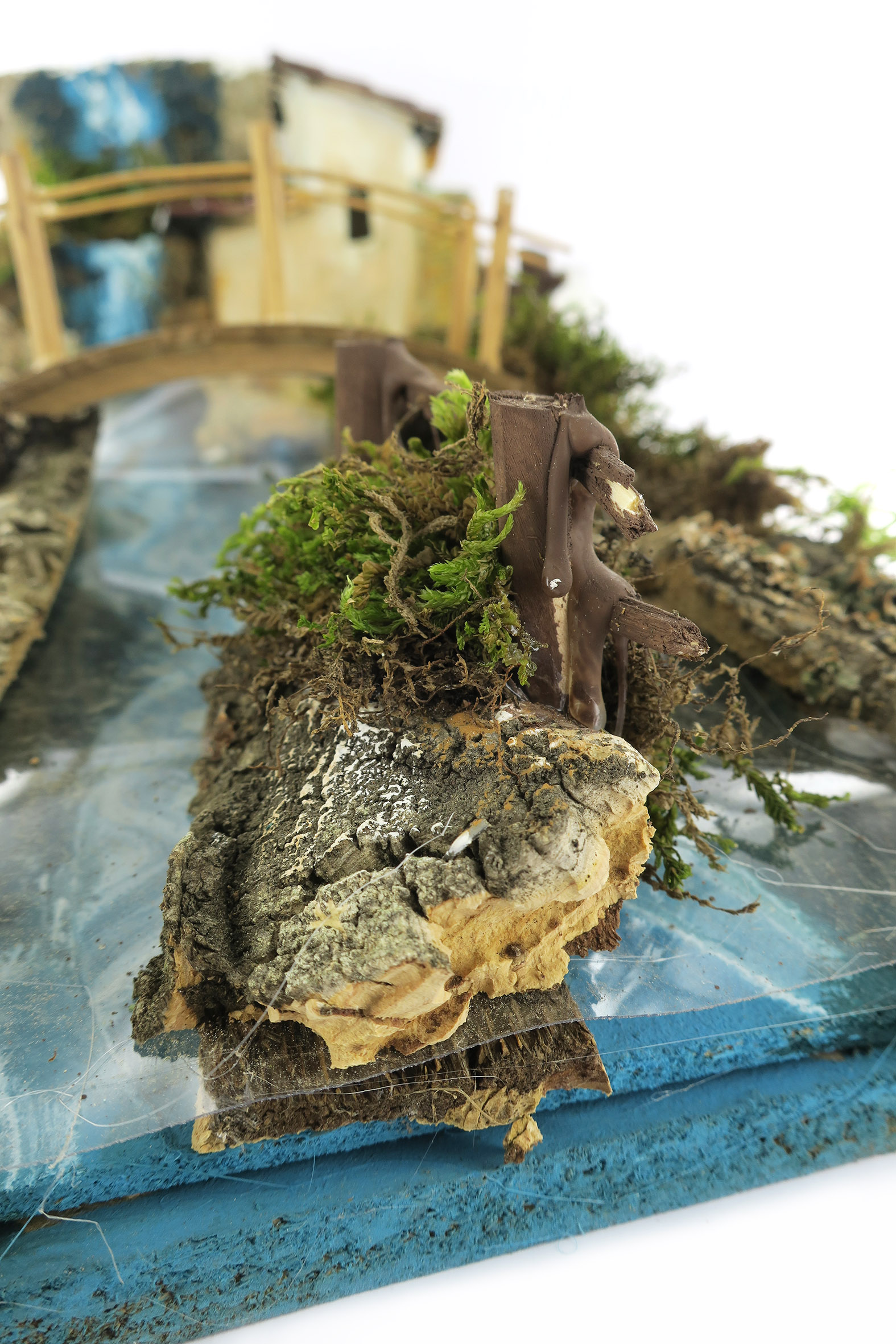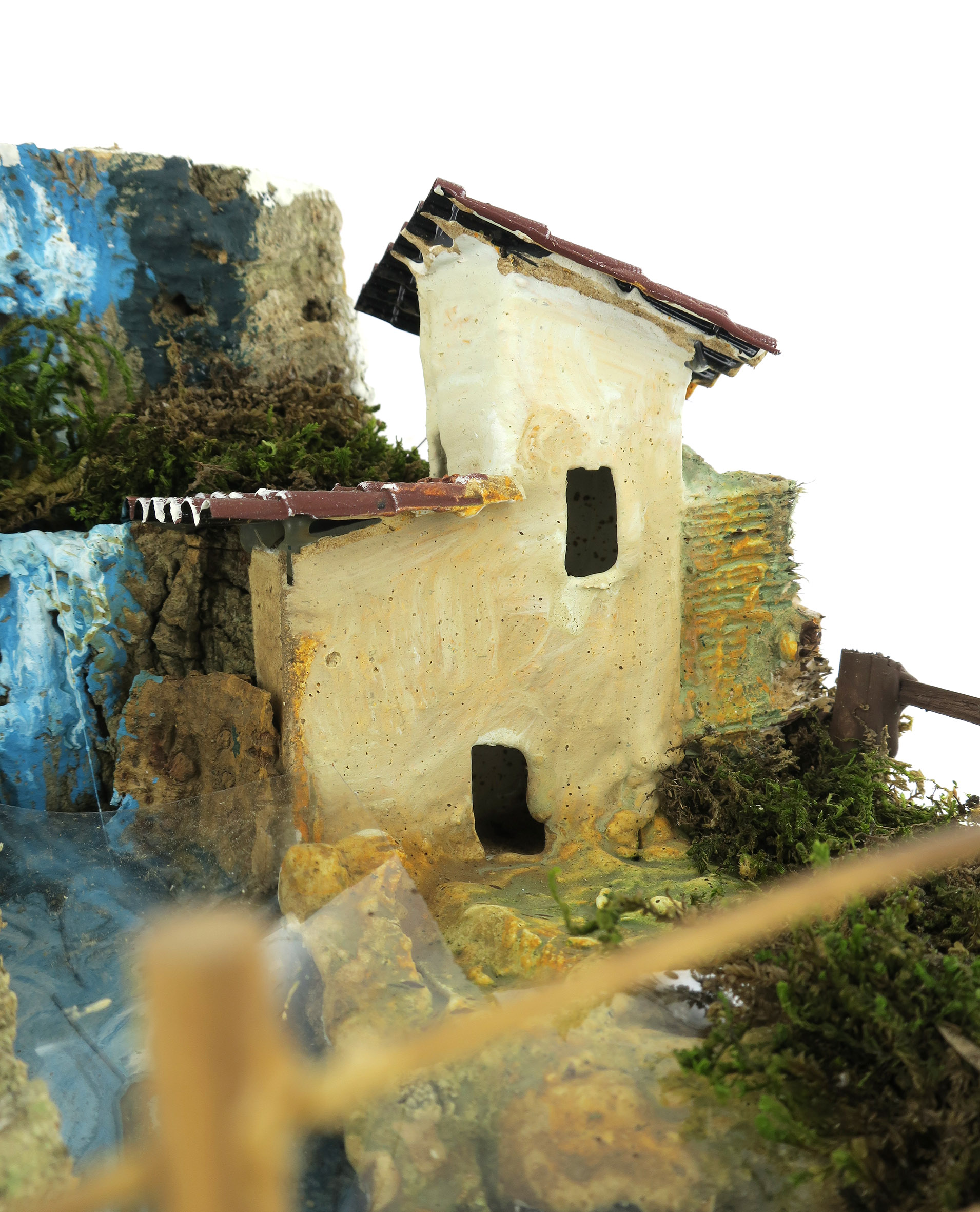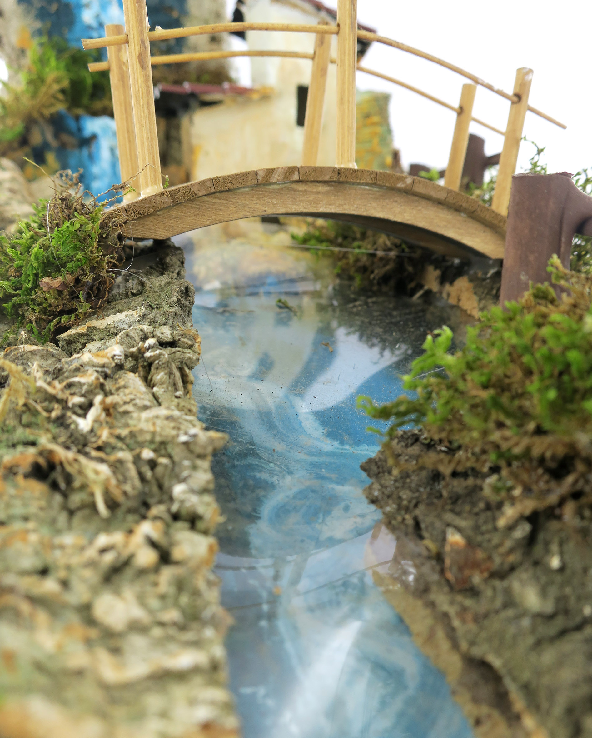 Accessori per presepe: Cascata rapida con corso che si sdoppia. Decorato con casetta e ponticello, oltre a dettagli in sughero e muschio che ricreano elementi naturali del paesaggio.