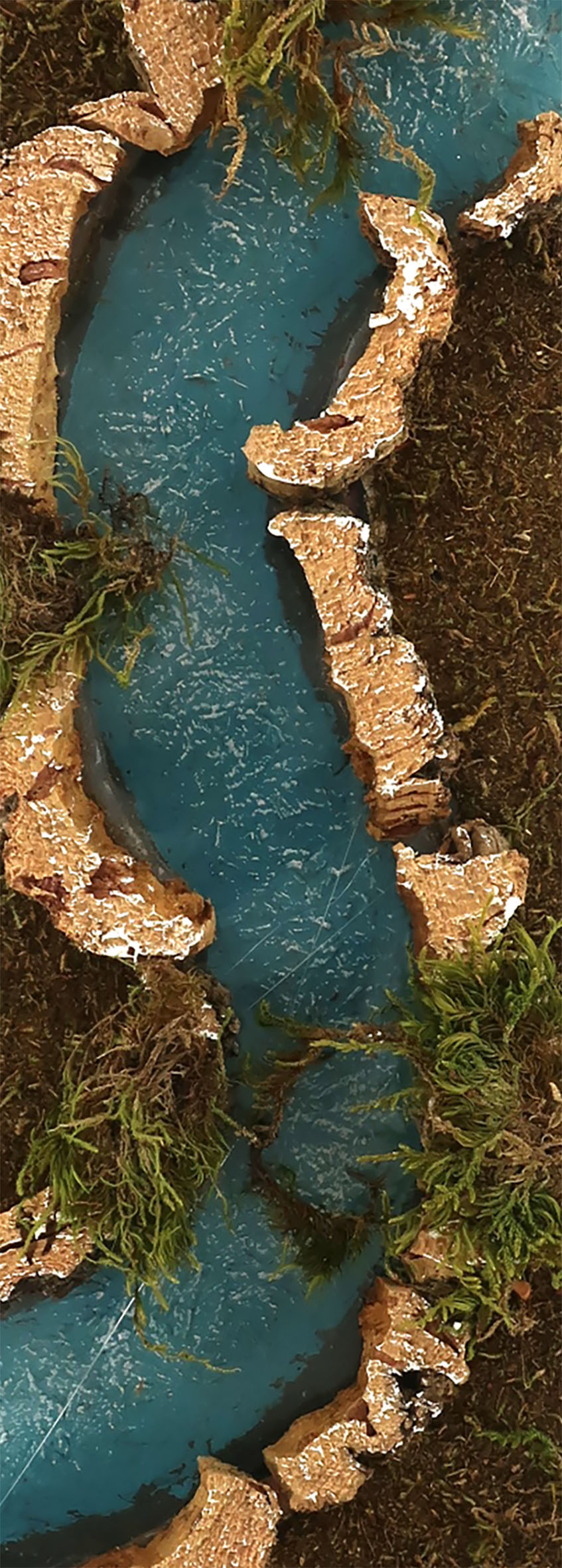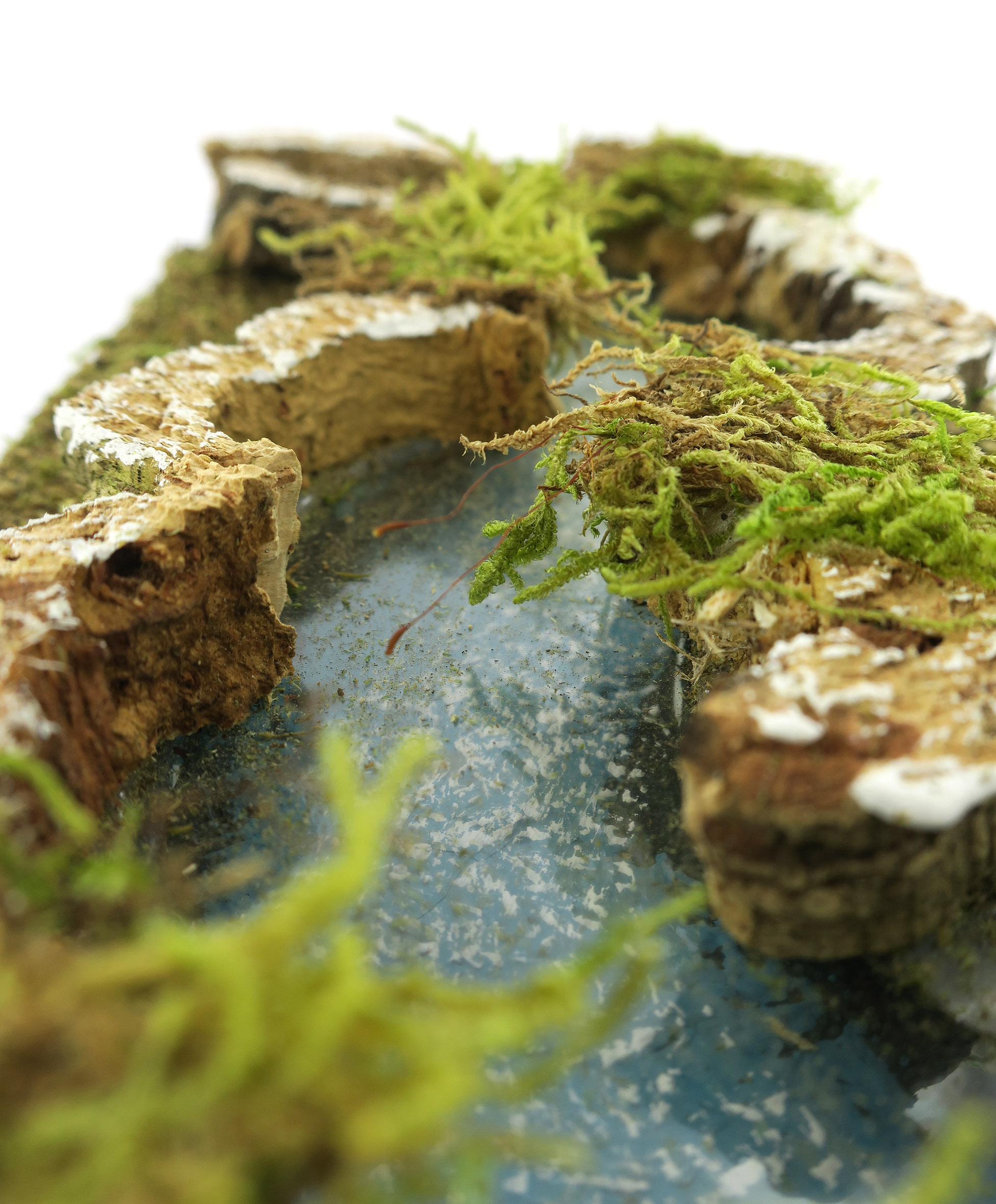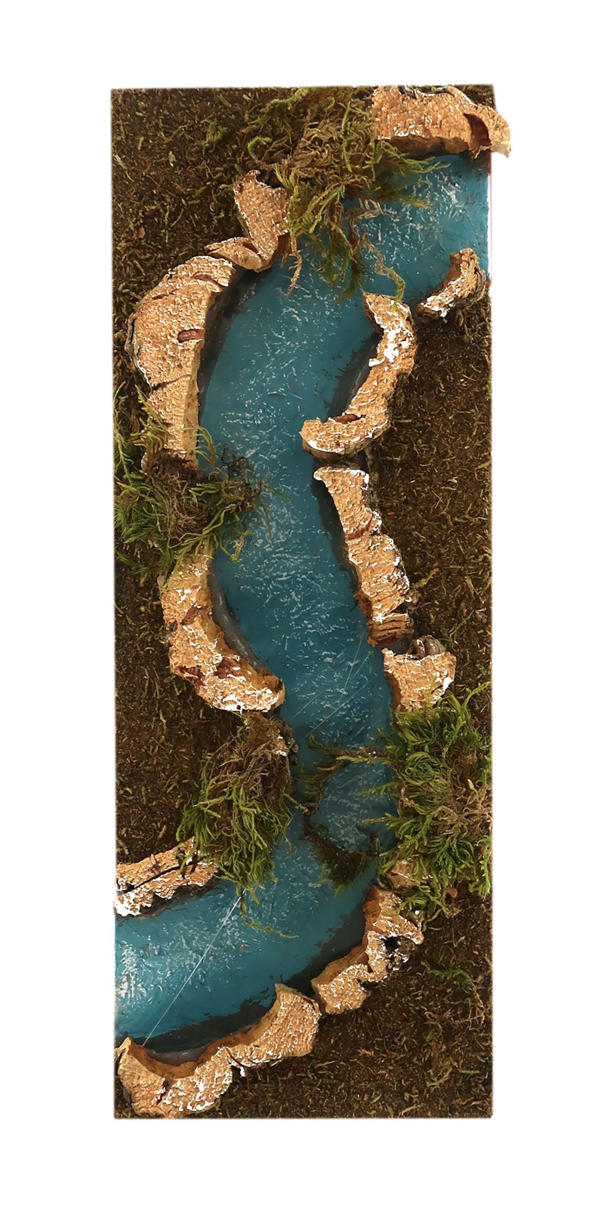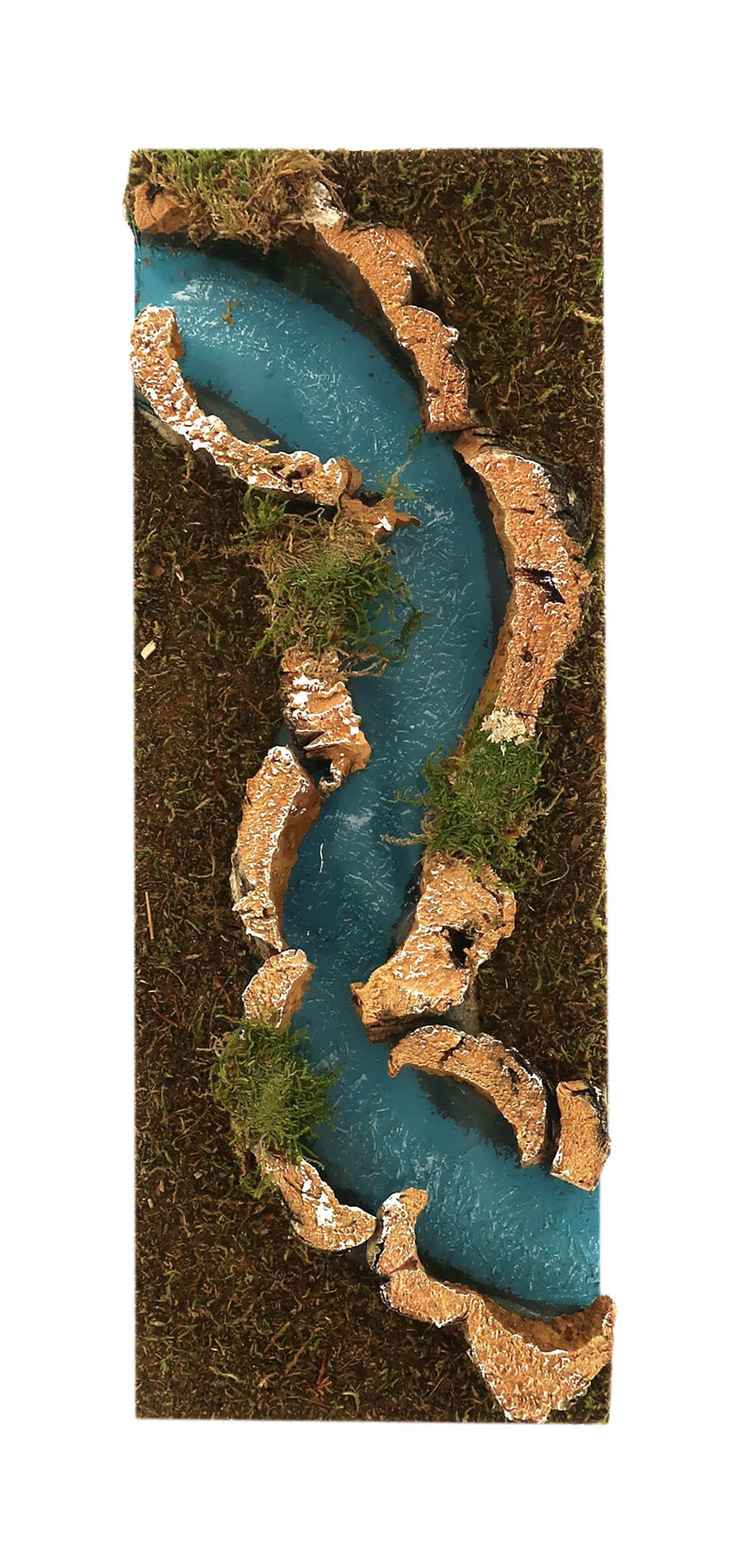Accessori per presepe: Fiume componibile (4 tratti di fiume, da comporre). Grazie a questo set iniziale da 4 pezzi di tratti di fiume sarà possibile creare il fiume per il vostro presepe in modo facile e veloce. Combinando i vari pezzi, tra loro compatibili, potrete realizzare il corso di un fiume per presepe, e se desiderate potrete integrare con altri tratti, disponibili in varie forme e fattezze, in modo da sviluppare il fiume come meglio preferite. Dimensioni: 32 x 13 x 3 cm. Materiali: Legno, sughero e muschio. Realizzato artigianalmente in Italia.