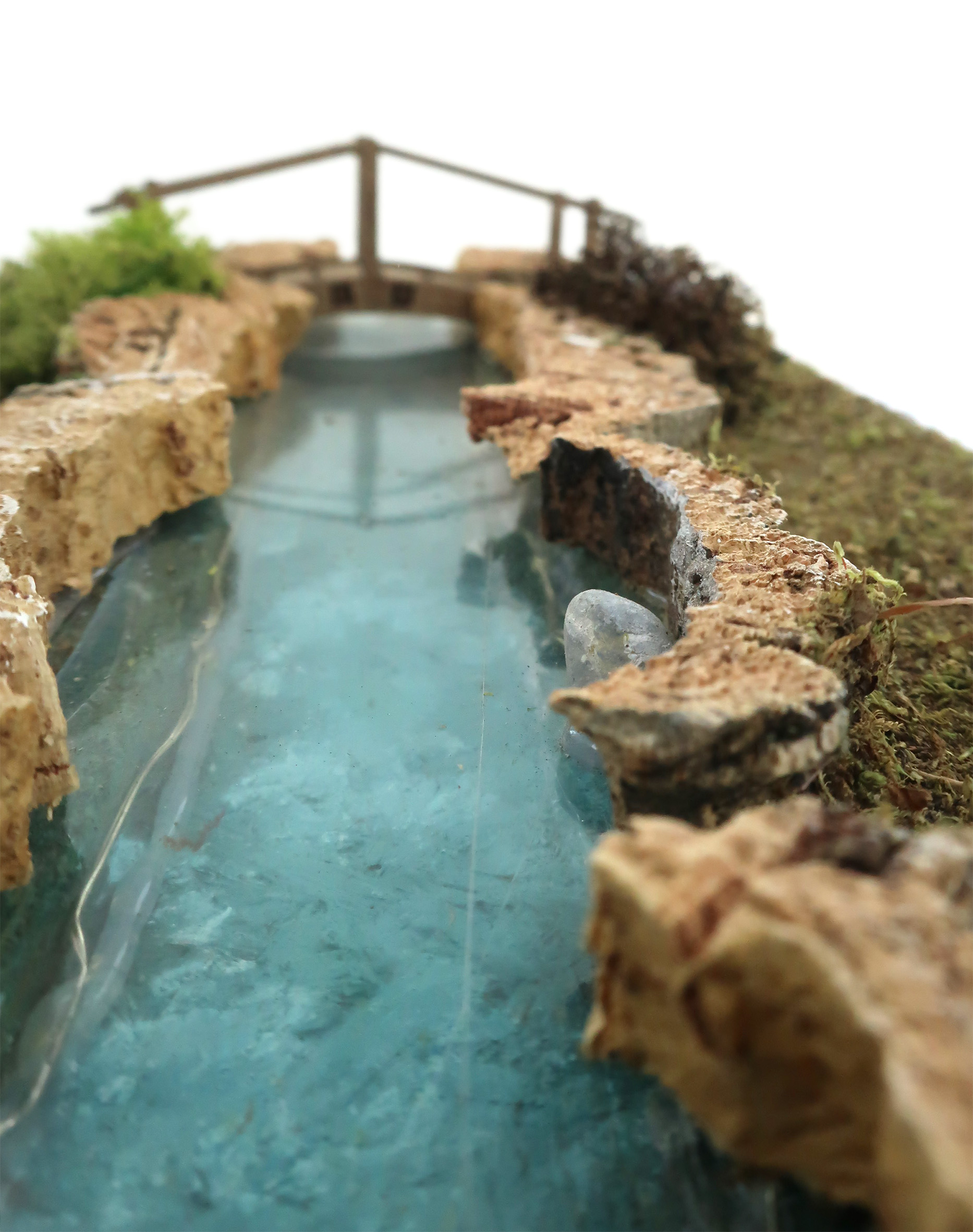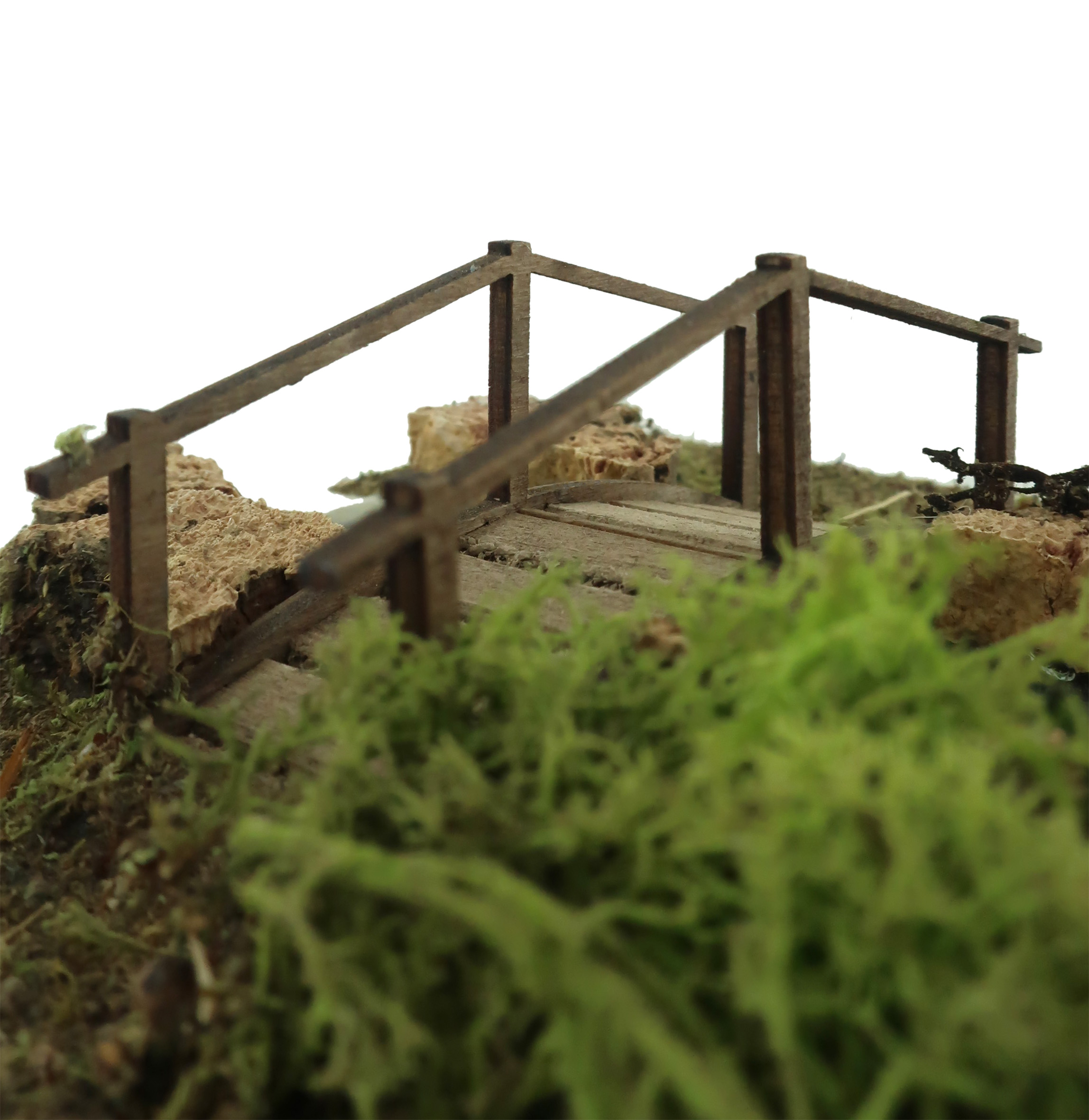 Accessori per presepe: Fiume luminoso con ponticello. Dimensioni: 17 x 33 x 8 cm. Materiali: legno, sughero, cartone, lichene e muschio. Alimentazione a batteria. Altre caratteristiche: LED bianco ghiaccio. Realizzato artigianalmente in Italia.