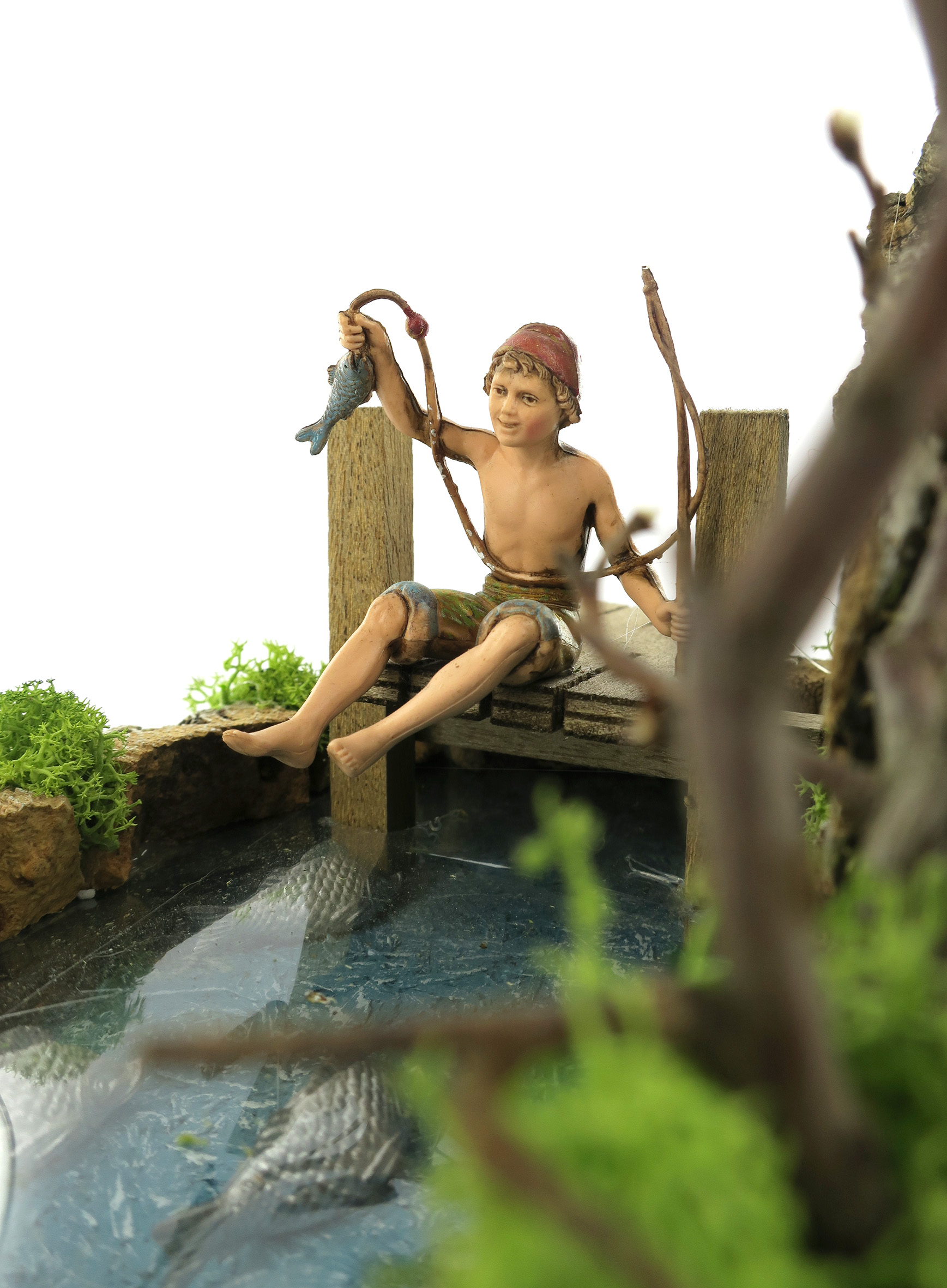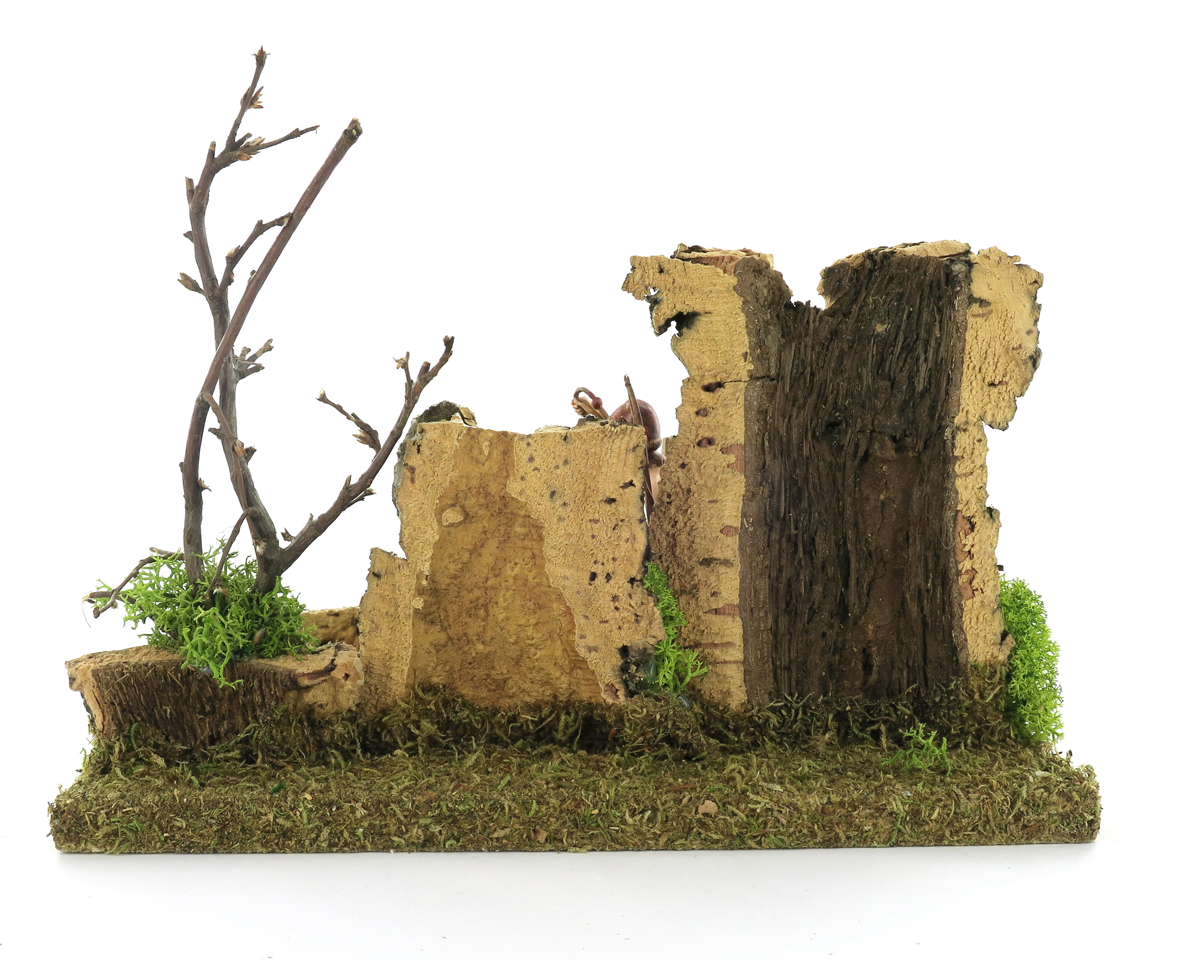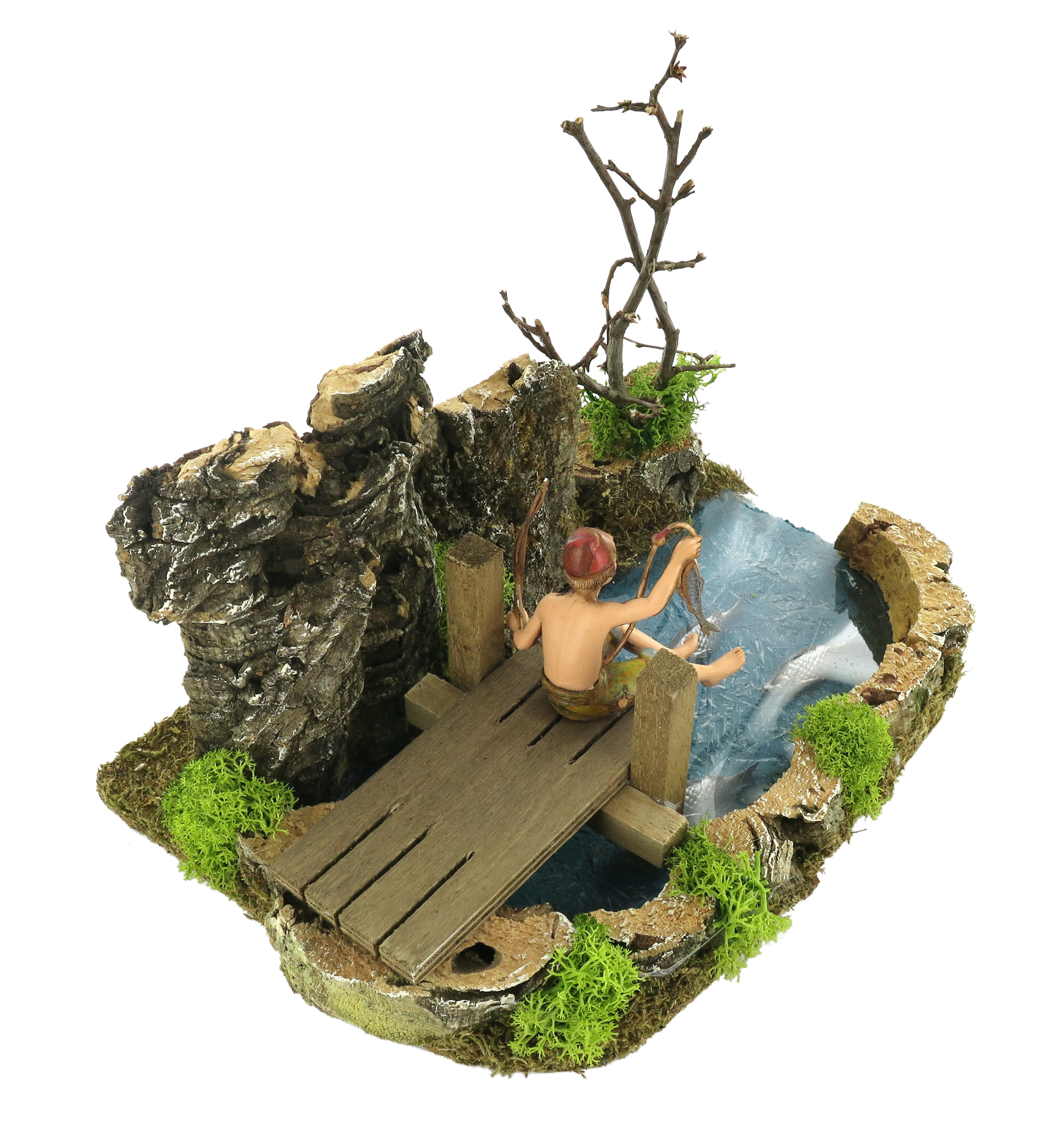 Accessori per presepe: Laghetto con pescatore. Dimensioni: 19 x 17 x 18 cm Materiali: Legno, sughero, muschio e lichene. La statuina del pescatore è in plastica ed è da 10 cm. Realizzato artigianalmente in Italia.