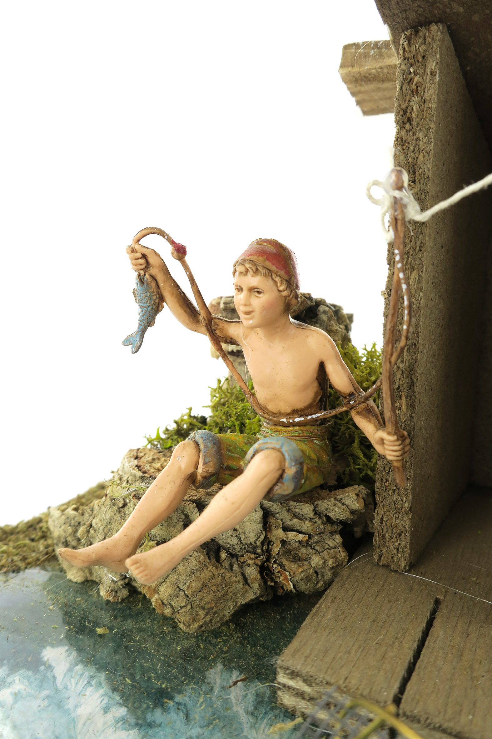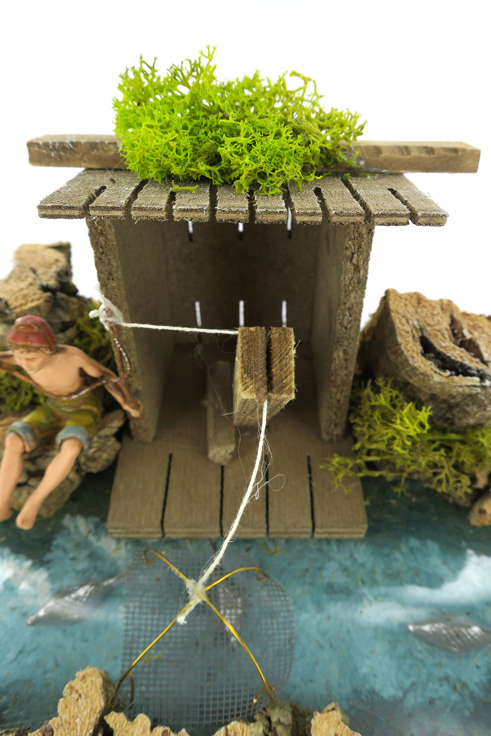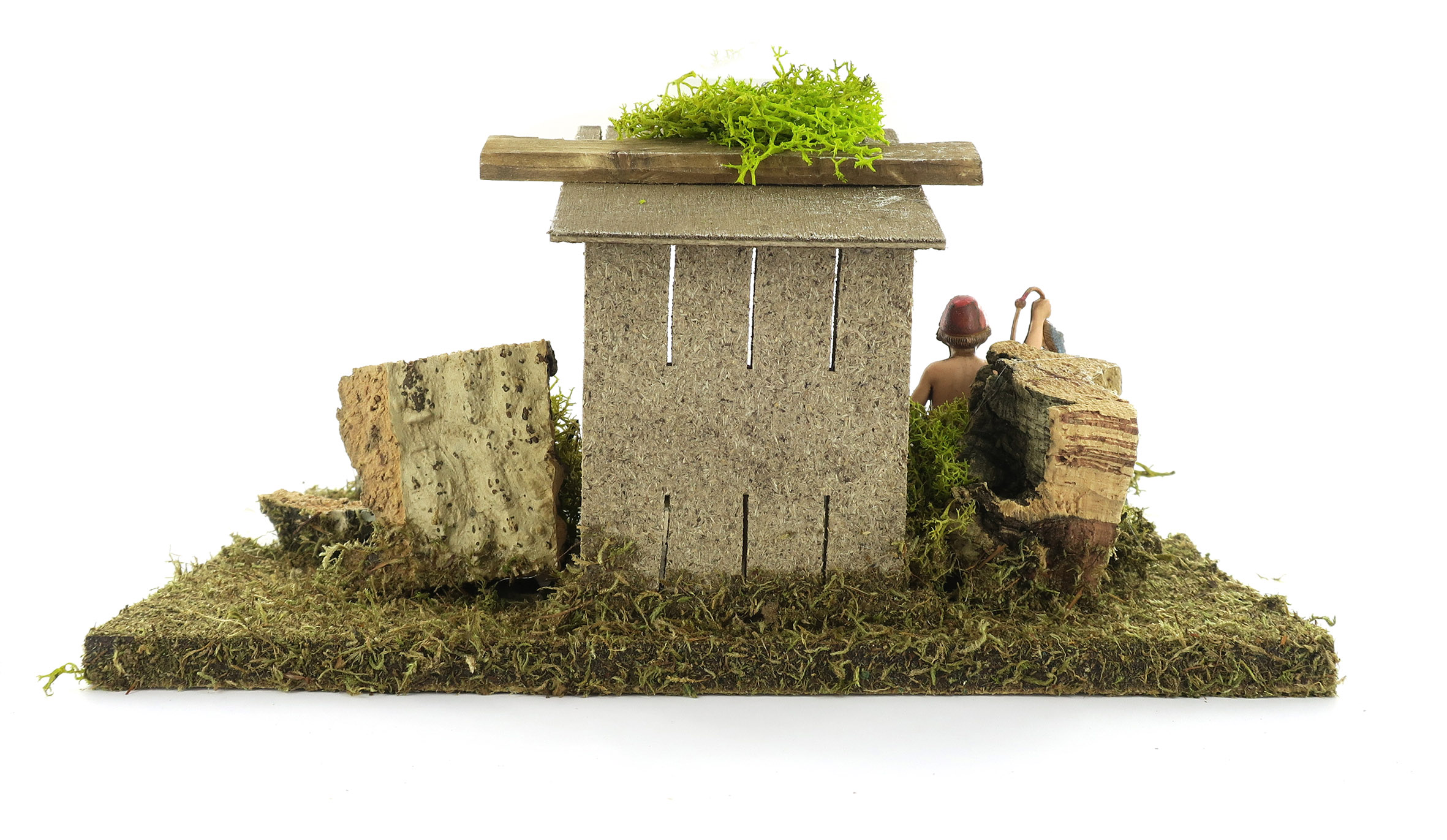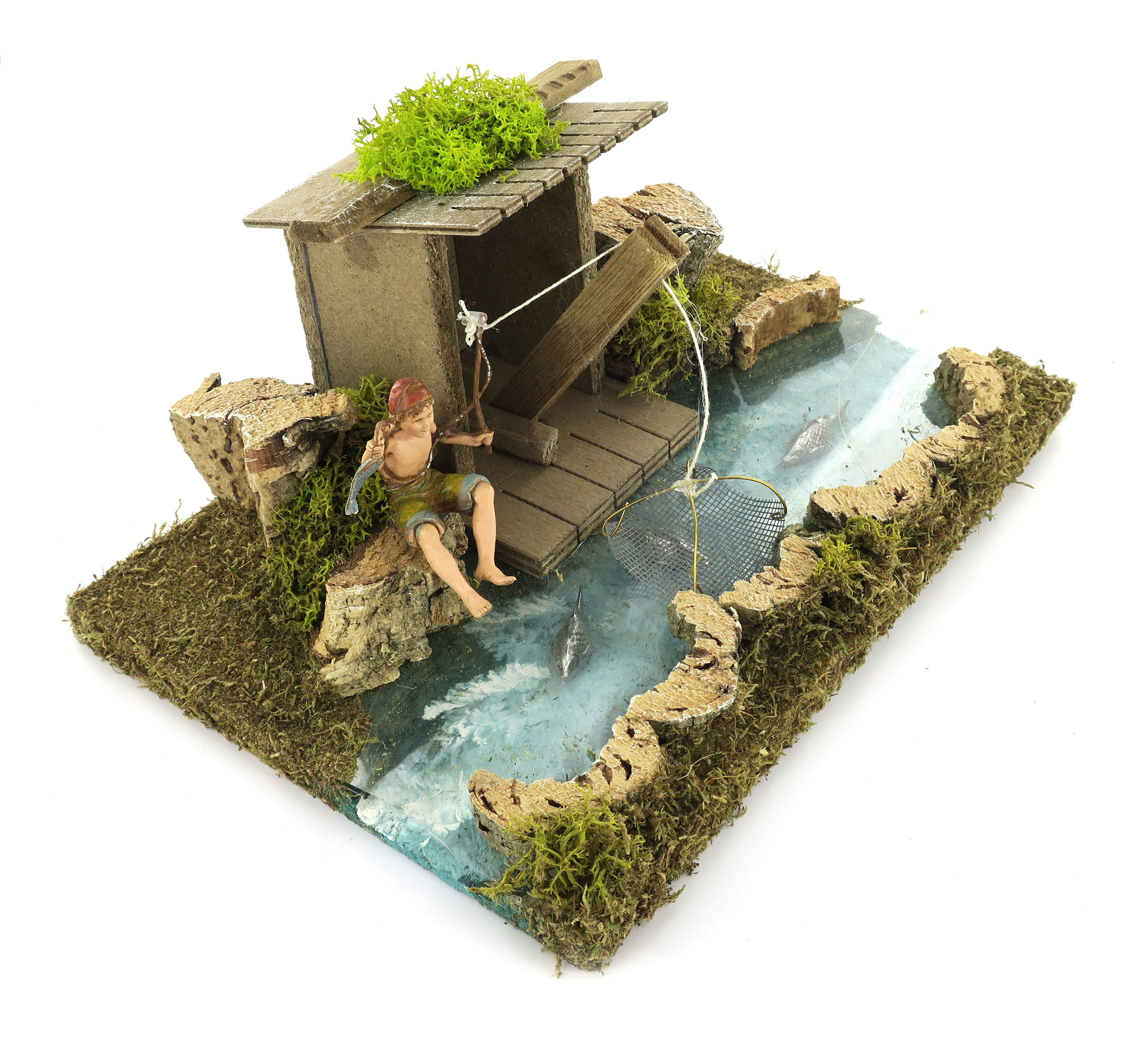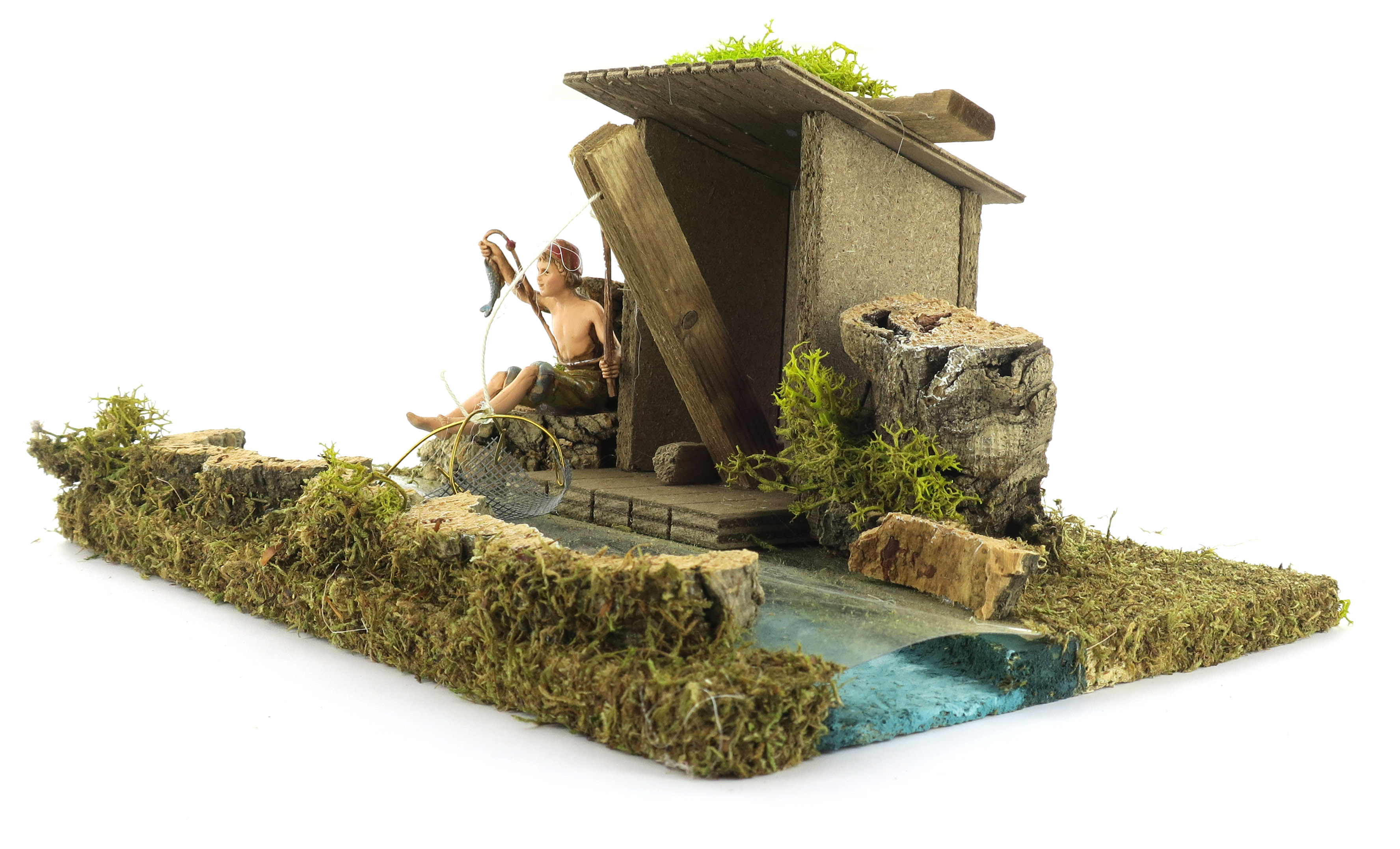 Accessori per presepe: Tratto di fiume con casa del pescatore. Dimensioni: 26 x 18 x 11 cm. La statuina del pescatore è in plastica ed è alta 10 cm. Il tratto di fiume è combinabile con altri pezzi per creare un fiume modulare, della forma e della lunghezza desiderata. Materiali: Legno, sughero e muschio. Realizzato artigianalmente in Italia.