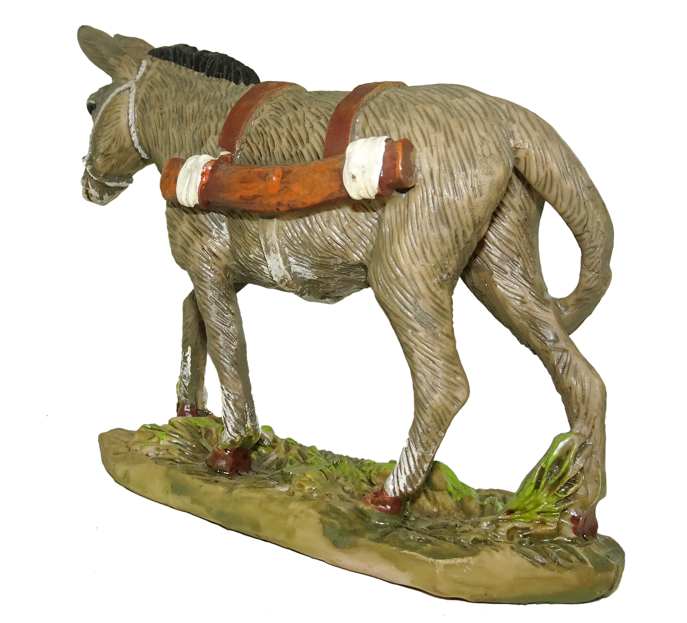 La statuina dell’asino, in resina colorata e rifinita a mano, rappresenta un animale che non può mancare nel presepe. L’asinello, dal manto marrone chiaro, è raffigurato in piedi, con un giogo color legno sul dorso. La punta della coda e parte del pelo nella parte superiore del collo è invece di color marrone scuro. I dettagli della trama del manto dell’asino, così come l’accuratezza della riproduzione delle briglie e del giogo, vi consentiranno di ricreare scene molto realistiche. Questa statuina è adatta a essere usata nel presepe Landi da 10 cm.