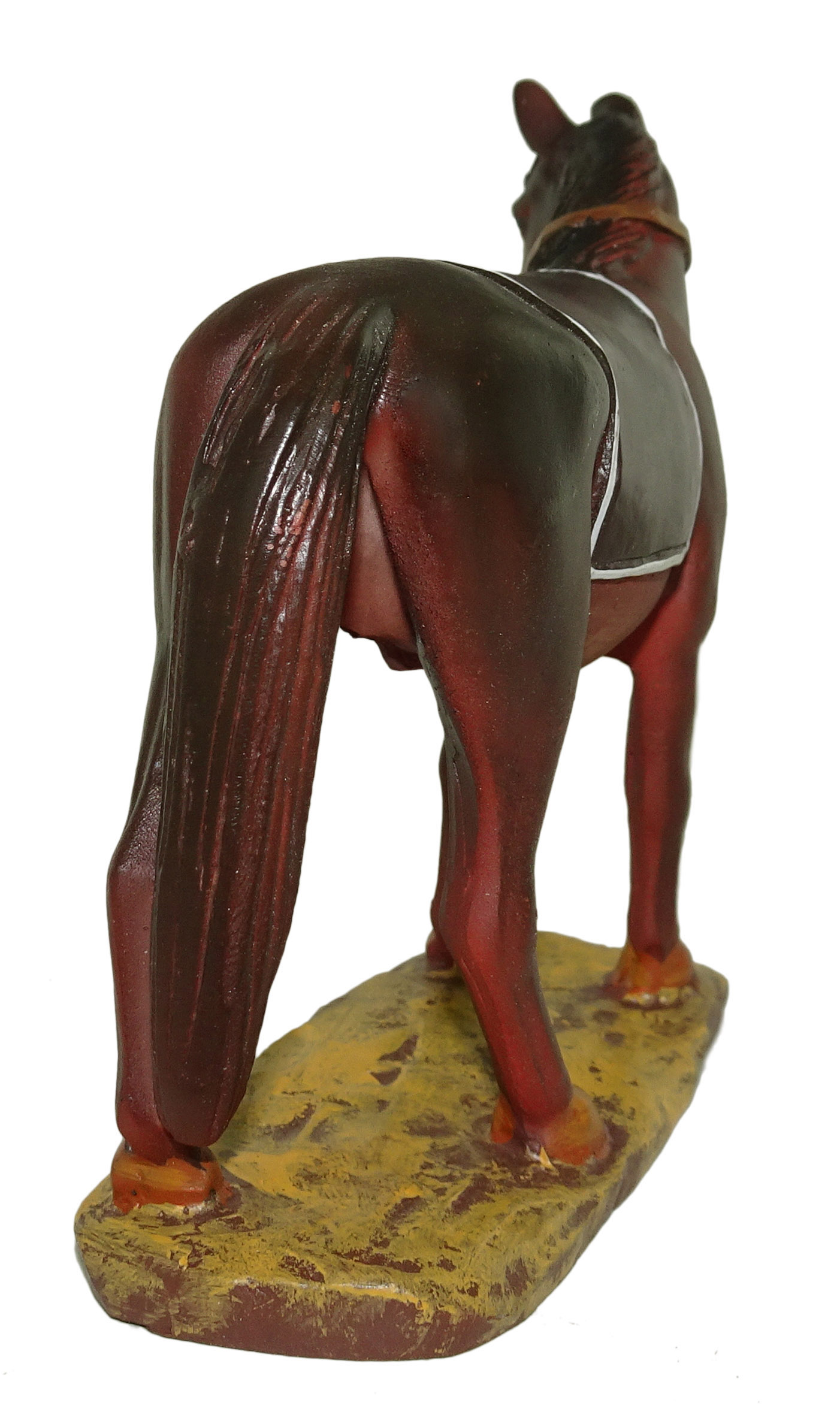 La statuina del cavallo, in resina colorata e rifinita a mano, rappresenta un animale che arricchirà sicuramente la scena agreste del vostro presepe tradizionale. Il cavallo, dal manto marrone scuro e in alcune parti tendente al nero, è raffigurato in piedi, con una sella nera a bordo bianco. La statuina del cavallo risulta liscia al tatto, eccezion fatta per la coda e per la criniera, la cui trama del pelo è stata resa in modo molto accurato. La definizione degli arti dell’animale e della sua muscolatura, così come la fedeltà di riproduzione dei dettagli della coda e della criniera, vi consentiranno di ricreare scene molto realistiche. Questa statuina è adatta a essere usata nel presepe Landi da 10 cm.