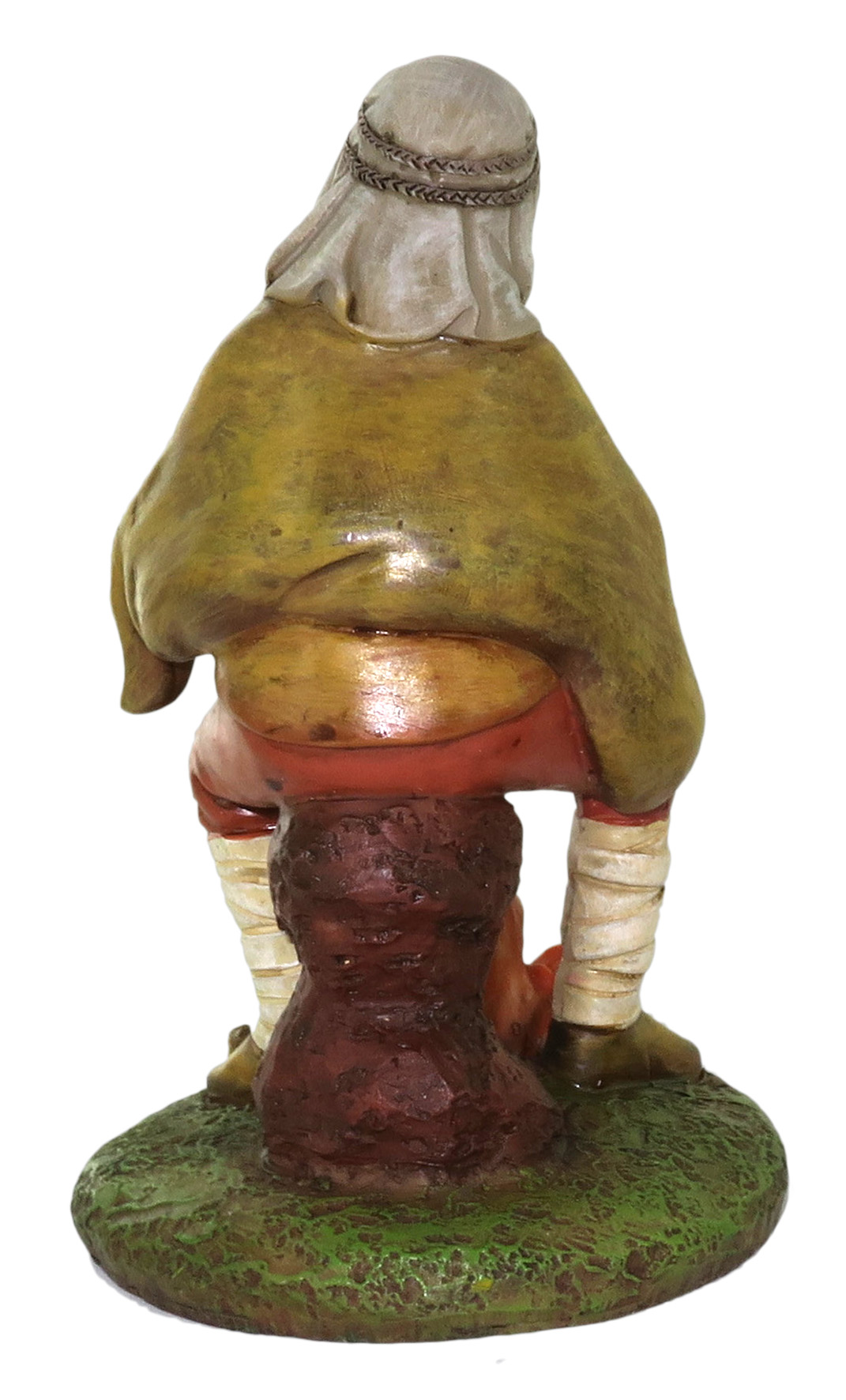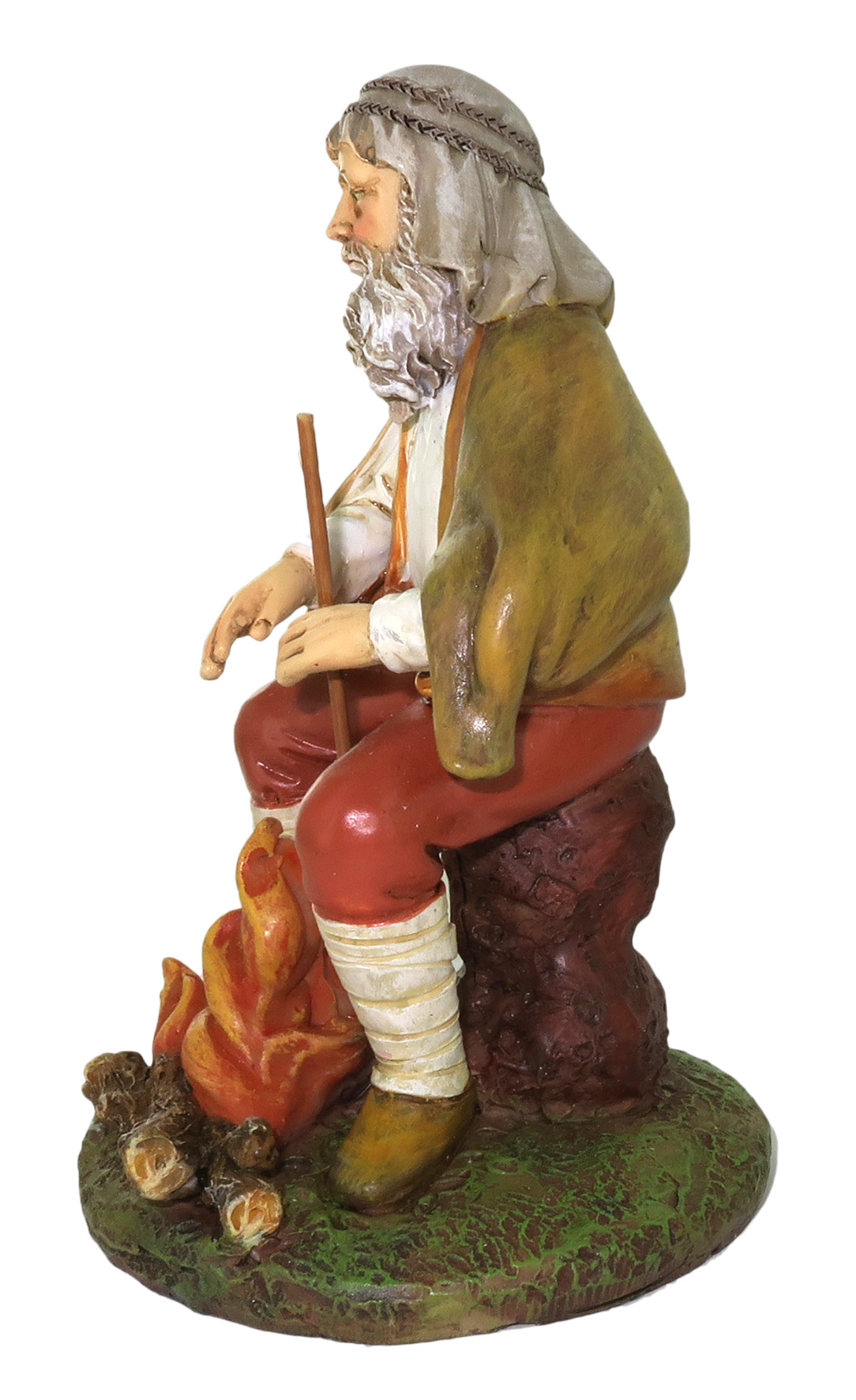 La statuina del pastore con fuoco, in resina colorata e rifinita a mano, rappresenta un soggetto che arricchirà sicuramente il vostro presepe tradizionale. Il pastore, dalla lunga barba bianca, sta riposando seduto su un tronco, imbraccia un bastone e si raccoglie intorno al piccolo fuoco di fronte a lui, con le mani tese verso le fiamme per scaldarsi. I dettagli della barba, delle vesti e del piccolo fuoco vi consentiranno di ricreare scene molto fedeli alla realtà. Questa statuina è adatta a essere usata nel presepe Landi da 10 cm.