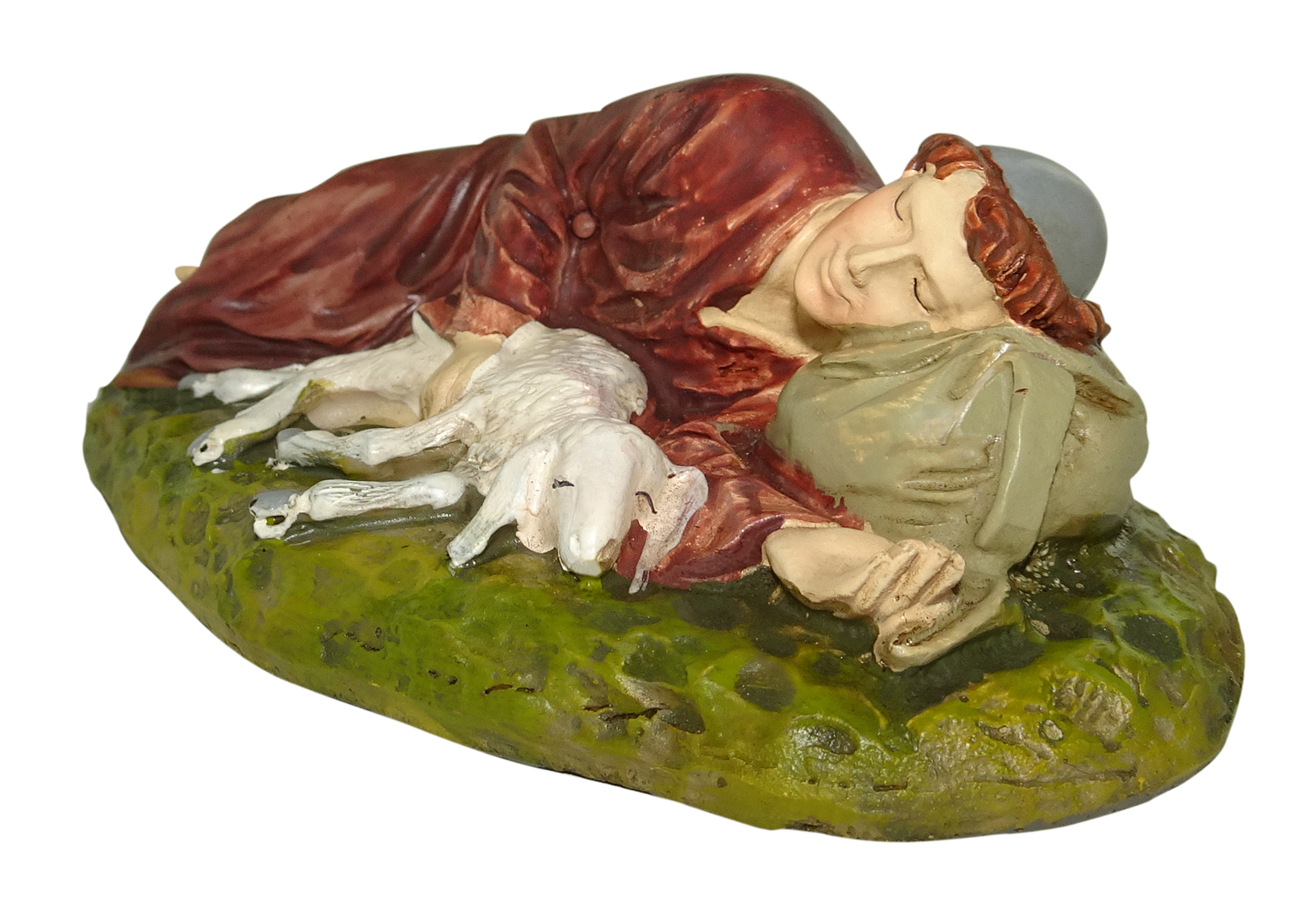 La statuina del pastore dormiente per presepe Landi da 10 cm, in resina colorata e rifinita a mano, è stata ideata dallo scultore d’arte sacra Martino Landi e rappresenta un pezzo che non può mancare nel vostro presepe tradizionale. Il pastore è raffigurato mentre, sdraiato sull’erba, riposa su un fianco, con la testa appoggiata ad un cuscino. Insieme al pastorello, trova riposo anche una pecorella, che dorme beata al fianco del padrone. La sinuosità delle linee della tunica marrone del pastore, così come la fedeltà di riproduzione dei dettagli del pelo dell’ovino, rappresentano la firma di Landi, che rimane sempre fedele alla tradizione, proponendo personaggi e particolari resi con precisione artigianale.