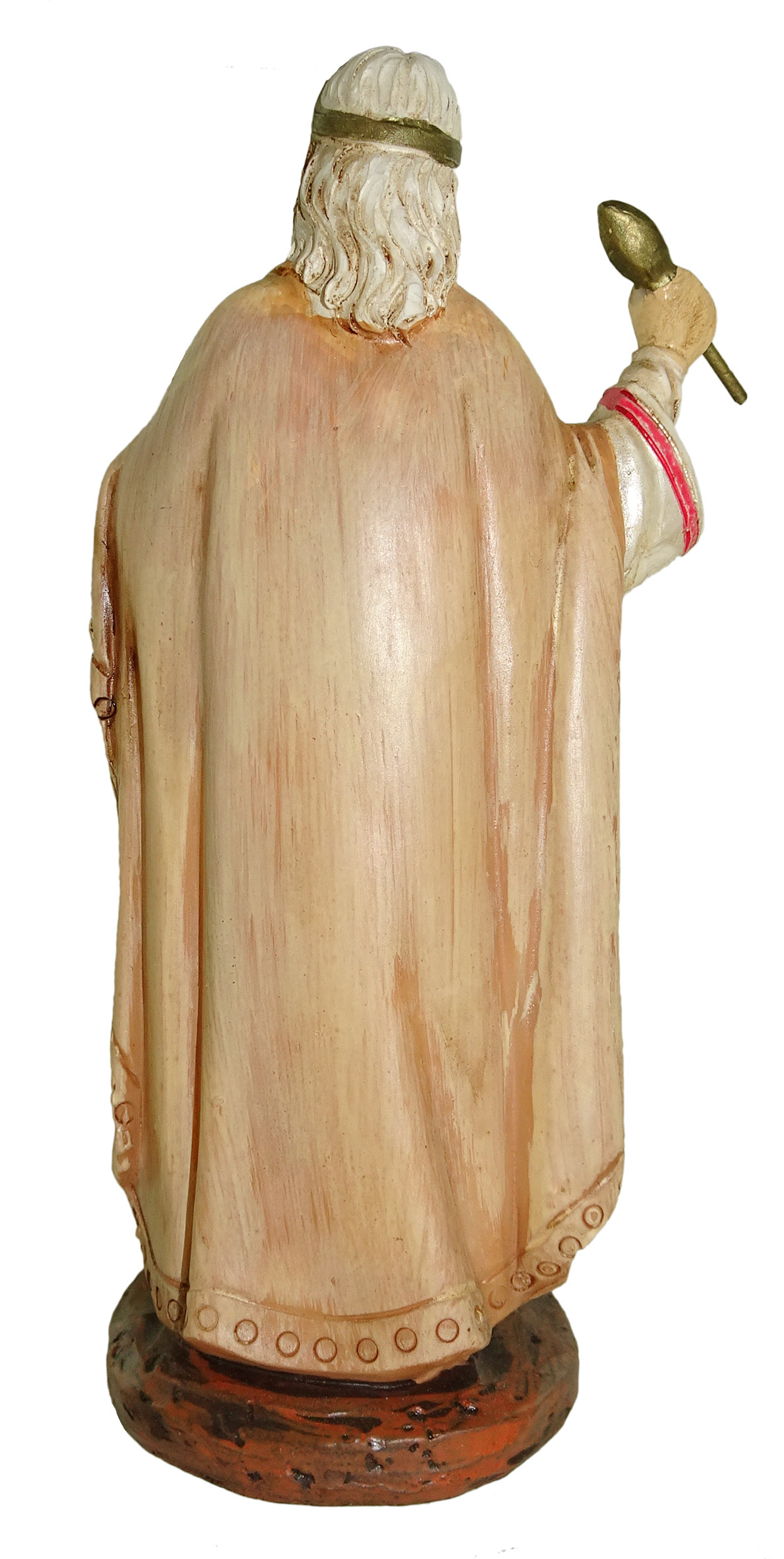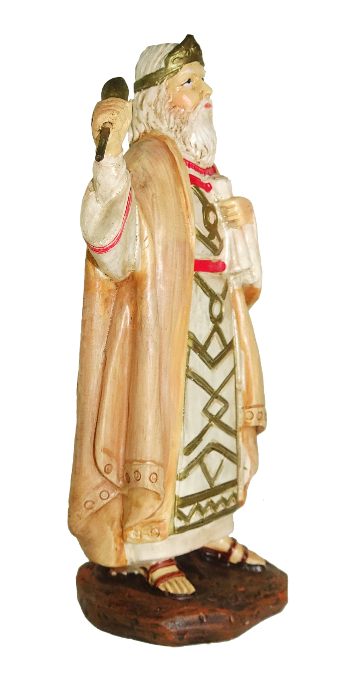 La statuina del Re Erode, in resina colorata e rifinita a mano, rappresenta un personaggio che arricchirà sicuramente il vostro presepe tradizionale. Il Re di Giudea è raffigurato in posizione eretta, con la corona sul capo e un manoscritto nella mano sinistra. Veste una preziosa tunica color avorio, decorata con inserti geometrici di color dorato e coperta da un mantello marrone chiaro. Le pieghe del mantello, così come la fedeltà di riproduzione dei dettagli, vi consentiranno di ricreare scene molto realistiche. Questa statuina è adatta a essere usata nel presepe Landi da 10 cm.