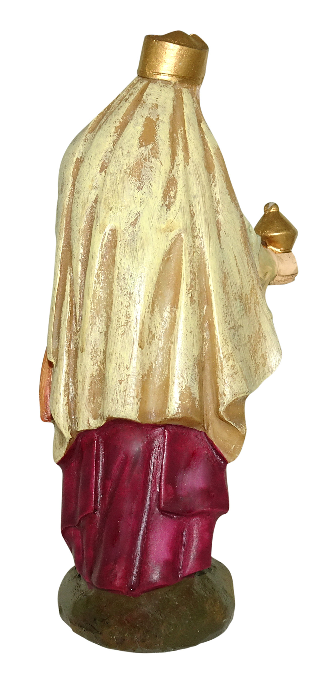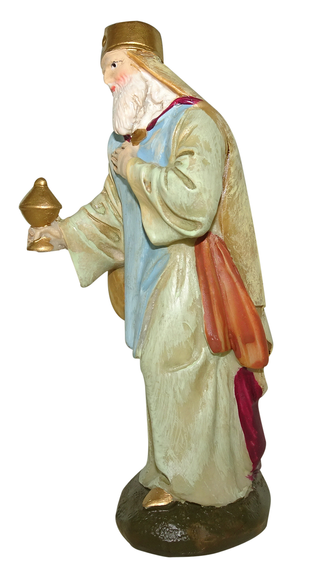 Questa statuina del Re Magio Melchiorre per presepe Landi da 10 cm, in resina colorata e rifinita a mano, è stata ideata dallo scultore d’arte sacra Martino Landi e rappresenta un pezzo a cui non potete rinunciare nel vostro presepe tradizionale. In posizione eretta, con la mano sinistra sul petto e la destra che regge un dono destinato al Bambin Gesù, Melchiorre è raffigurato con un copricapo dorato e vesti verdi, azzurre e rosso carmine. L’uso particolare del colore e delle sfumature, insieme all’effetto anticato applicato ad alcune parti di questa statuina del Re Magio Melchiorre, conferiscono profondità al soggetto e lo rendono ancora più realistico.