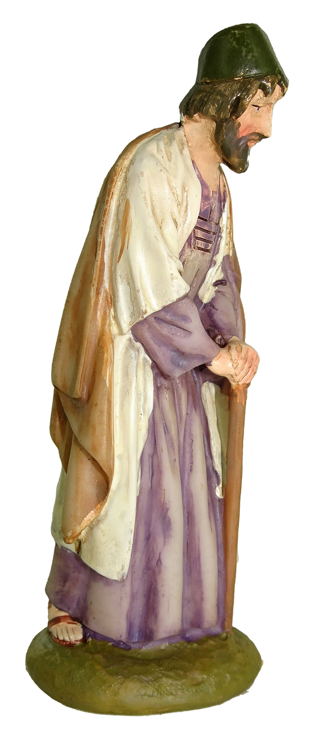 La statuina di San Giuseppe per presepe Landi da 10 cm, in resina colorata e rifinita a mano, è stata ideata dallo scultore d’arte sacra Martino Landi e rappresenta un pezzo indispensabile per il vostro presepe tradizionale. In posizione eretta, ma appoggiato al proprio bastone e con lo sguardo rivolto verso il basso, idealmente verso la mangiatoia dove troverà posto il Bambin Gesù, San Giuseppe è raffigurato con un copricapo verde scuro e vesti marroni, bianche e viola. L’uso particolare del colore e delle sfumature, insieme all’effetto anticato applicato ad alcune parti di questa statuina di San Giuseppe, conferiscono profondità al soggetto e lo rendono ancora più realistico.