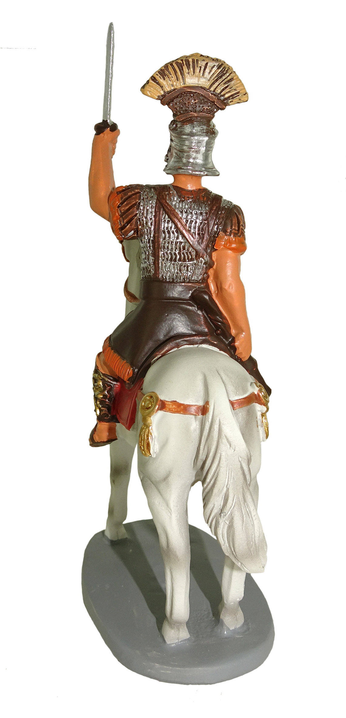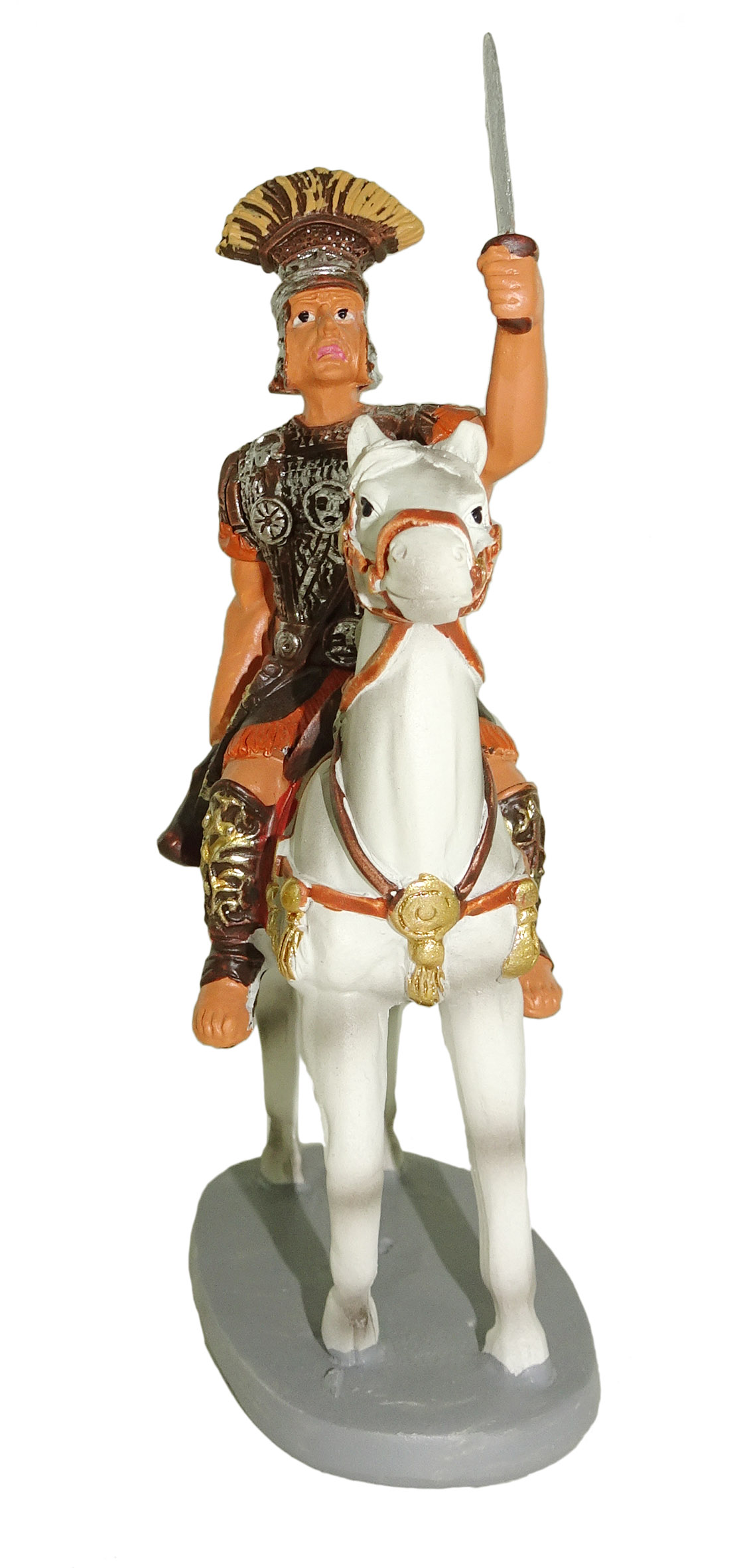 La statuina del soldato a cavallo, in resina colorata e rifinita a mano, rappresenta un elemento che arricchirà sicuramente il vostro presepe tradizionale. Il soldato, raffigurato a dorso del proprio destriero bianco bardato con nappe dorate e una sella rossa, imbraccia una spada nella mano sinistra, volta al cielo. La fedeltà di riproduzione dei dettagli, come le linee dell’elmetto e i decori dell’armatura del soldato, vi consentiranno di ricreare scene molto realistiche. Questa statuina è adatta a essere usata nel presepe Landi da 10 cm.