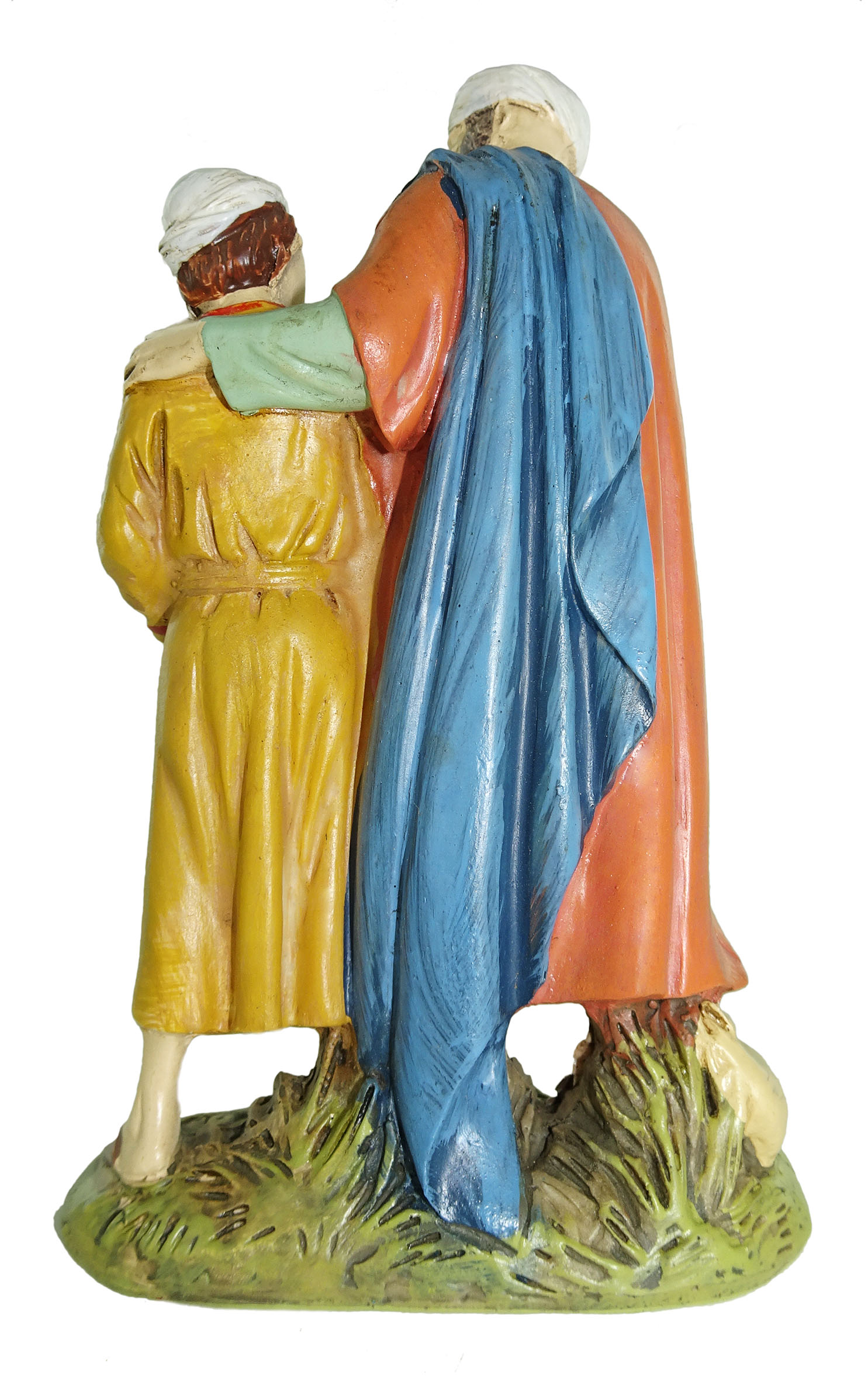 La statuina dell’uomo e bambino con colomba su base per presepe Landi da 12 cm, in resina colorata e rifinita a mano, è stata creata dallo scultore d’arte sacra Martino Landi e rappresenta un elemento che arricchirà sicuramente il vostro presepe tradizionale. L’uomo, raffigurato in piedi, è a fianco a un bambino che tiene in mano una colomba, simbolo di pace e di gioia per il lieto evento della nascita del Salvatore. Il color ocra delle vesti del fanciullo spicca accostato agli indumenti dell’uomo, di colore rosso, azzurro e verde. Le linee delle due figure, così come la fedeltà di riproduzione dei dettagli, rappresentano la firma di Landi, che rimane sempre fedele alla tradizione, proponendo personaggi e particolari resi con precisione artigianale.