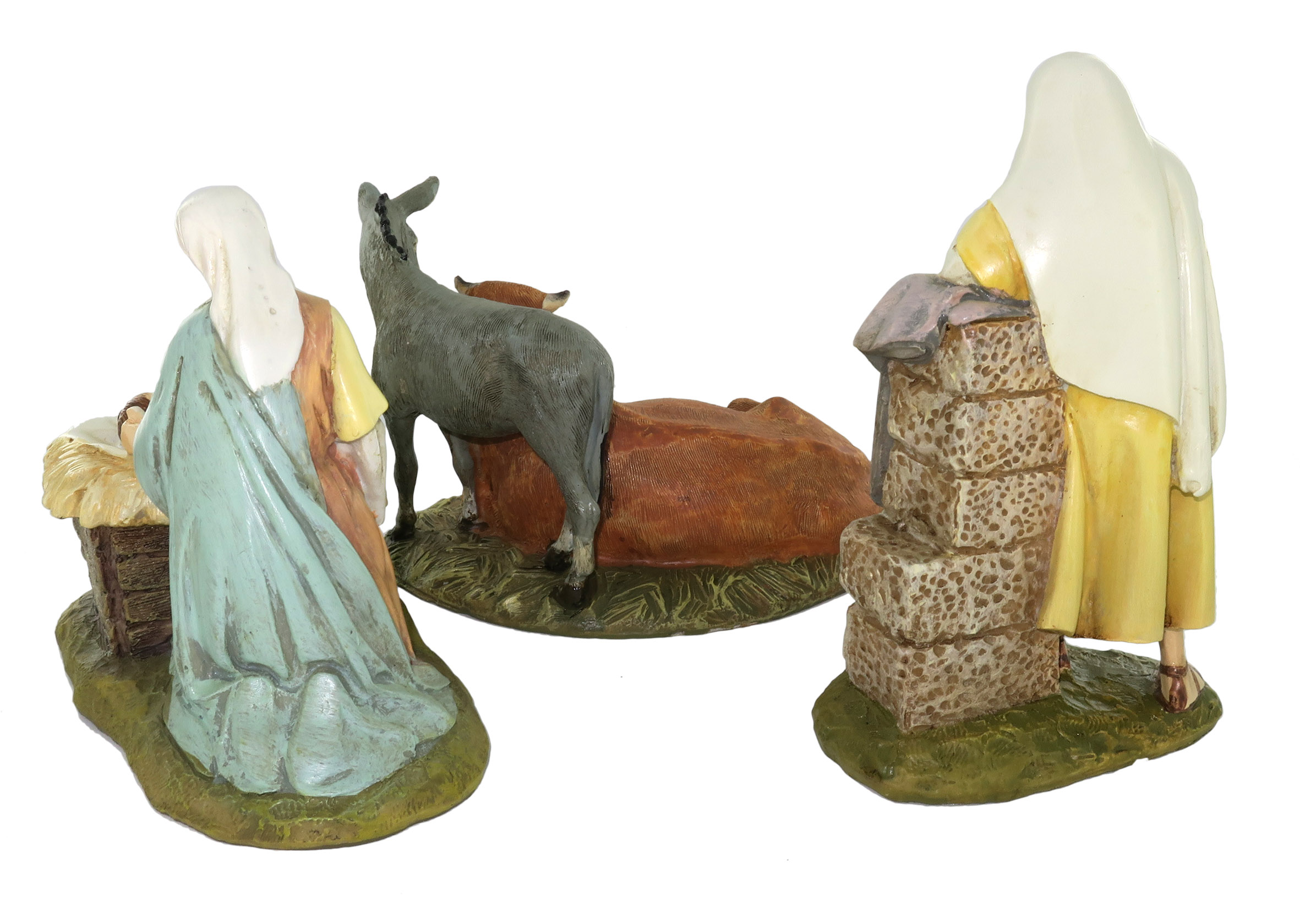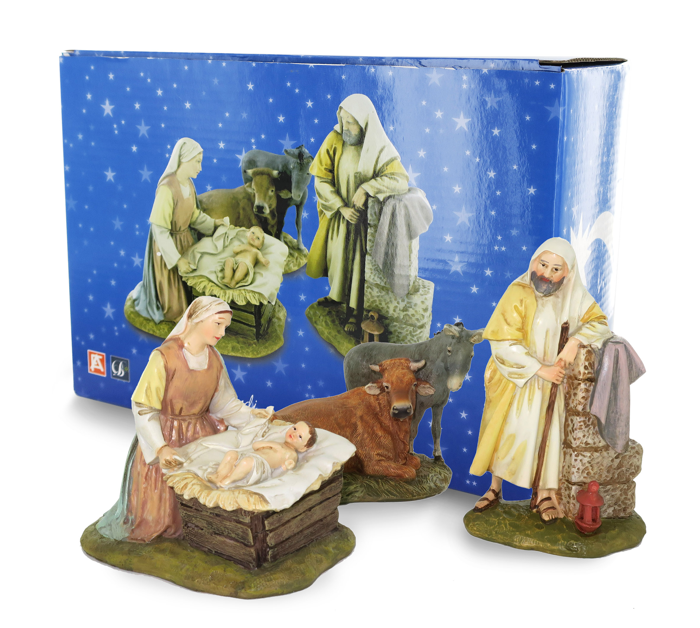 Questa Natività della serie Martino Landi, in resina colorata e rifinita a mano, è formata da 3 pezzi da 12 cm di altezza e conta un totale di 5 figure. Un primo pezzo include la Madonna con il bambino nella culla, su base unica; il secondo raffigura Giuseppe appoggiato a un muretto, mentre il terzo pezzo include i due animali che accompagnano la Sacra Famiglia, il bue e l’asinello, anch’essi su base unica. Realizzate su modello concepito dal celeberrimo scultore Martino Landi, le statuine ripropongono le caratteristiche tipiche delle creazioni del famoso maestro d’arte sacra, come l’attenzione alla cura dei dettagli e alla tradizione. La Sacra Famiglia, con la Madonna genuflessa in prossimità della culla che ospita il Salvatore, si completa con Giuseppe, in piedi, che ammira Maria e il bambino. A completare la Natività, il bue, accucciato a terra, e l’asinello, in piedi. Il peso dell’intero set è 490 gr, mentre il peso con imballo è 605 gr. Madonna con bambino – Peso: 163 gr, Dimensioni: 11 cm (larghezza), 10 cm (altezza), 7 cm (profondità). Giuseppe – Peso: 132 gr, Dimensioni: 8 cm (larghezza), 12,5 cm (altezza), 5,3 cm (profondità). Bue e asinello – Peso: 195 gr, Dimensioni: 13 cm (larghezza), 8,5 cm (altezza), 8,5 cm (profondità). A causa della pittura a mano, le tonalità dei colori potrebbero variare. Il presepe è una tradizione natalizia molto amata in Italia. L'usanza del presepe coinvolge famiglie che, con cura e devozione, allestiscono nel periodo di Natale il presepe con statuine rappresentanti la Natività e le persone che rendono omaggio a Gesù Bambino. Un'emozione unica, che unisce tradizione e spiritualità, si prova ammirando una ricostruzione creativa e simbolica della nascita di Gesù.